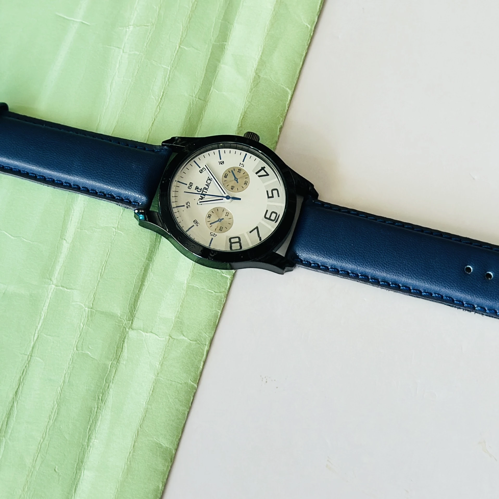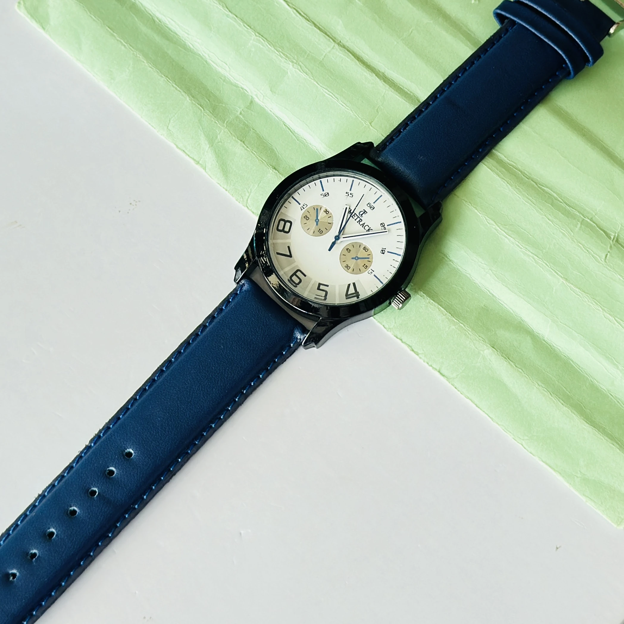 METRACK brand analog watch with a blue leather strap and a white dial