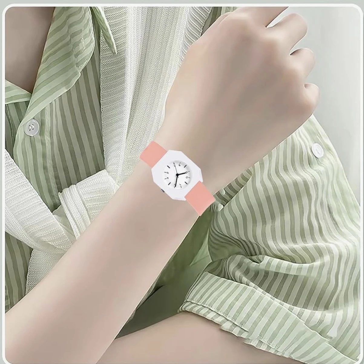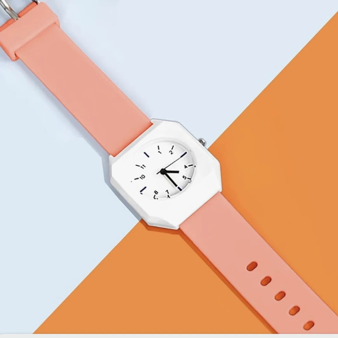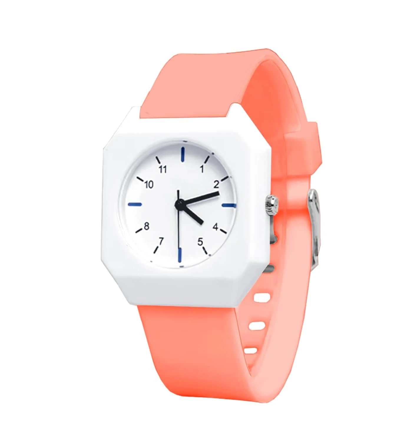 👉 Theme :- Mingrui analog quartz watch with a white plastic case and a peach/orange silicone strap
