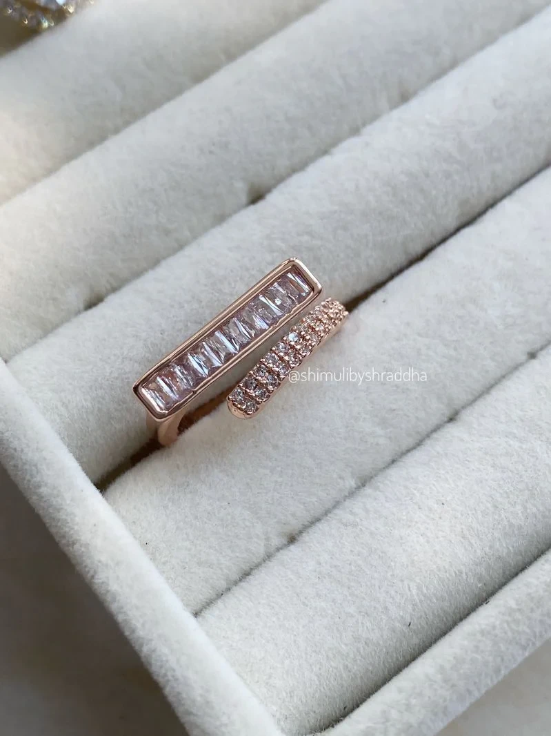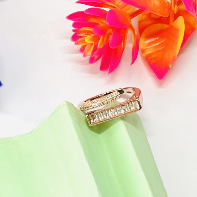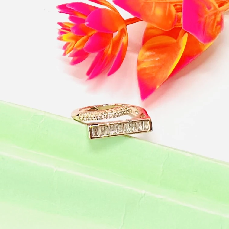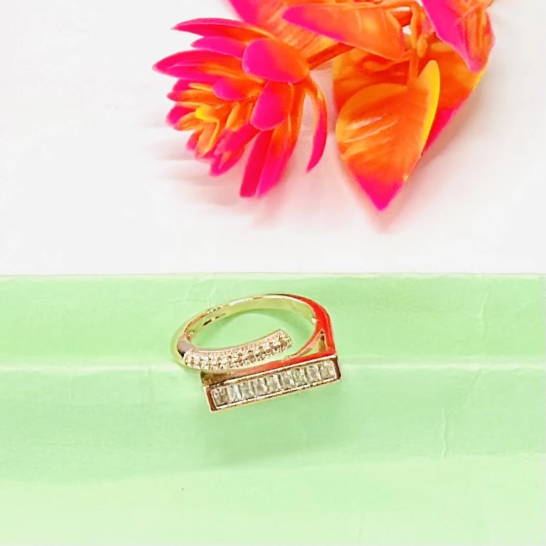 modern minimalist gold ring featuring a baguette diamond bar design.