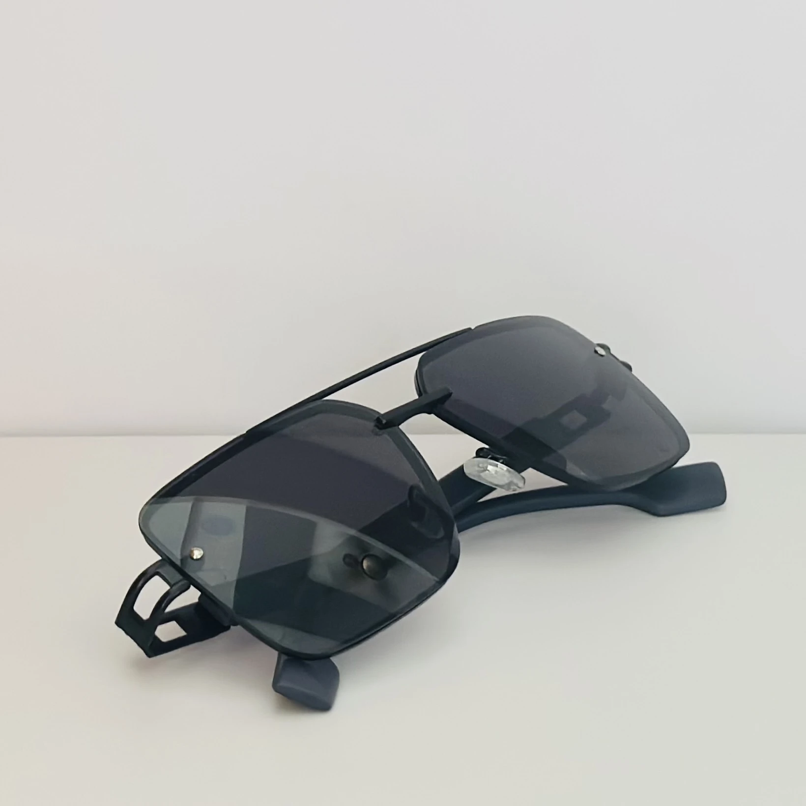 👉 Theme :- pair of black metal rectangular sunglasses.