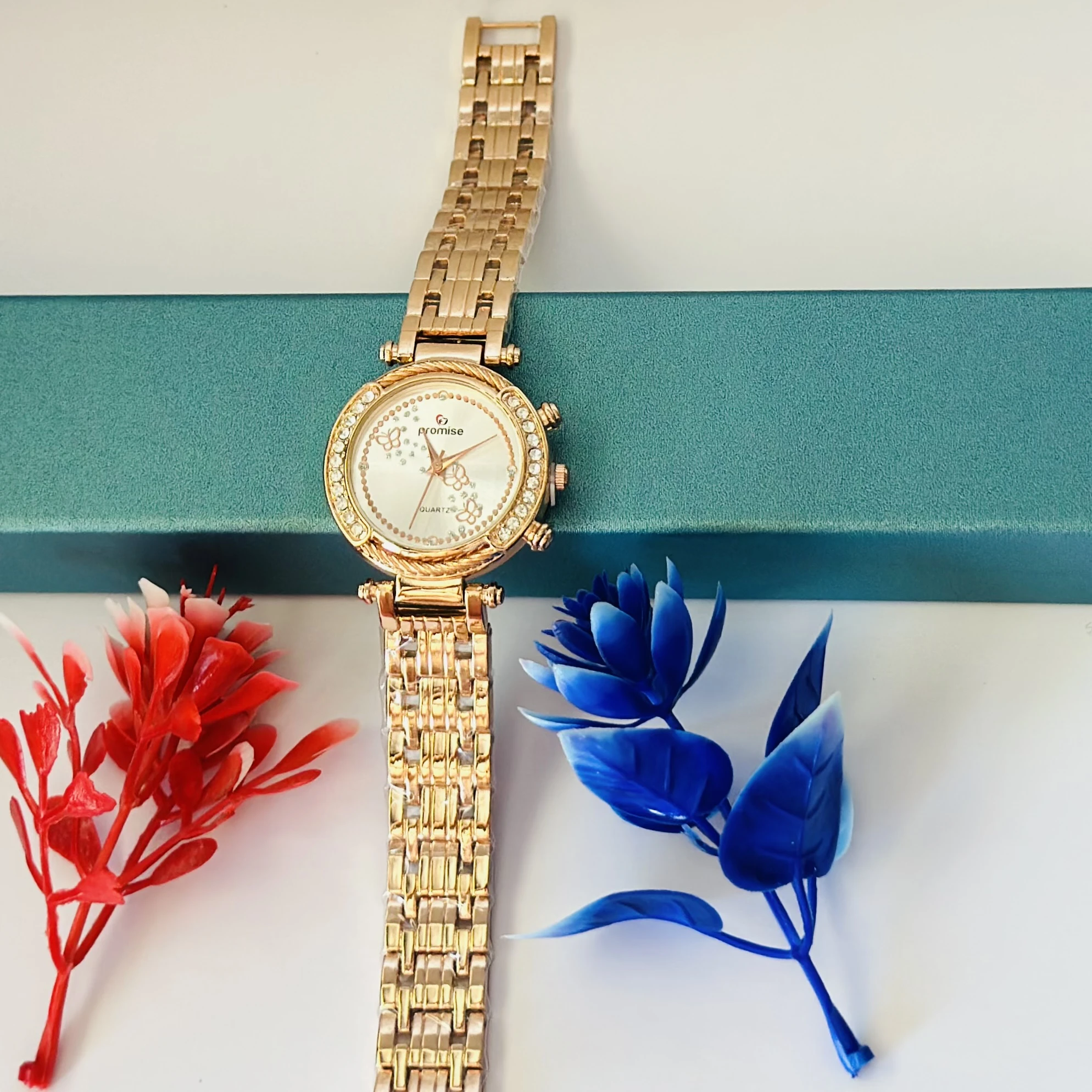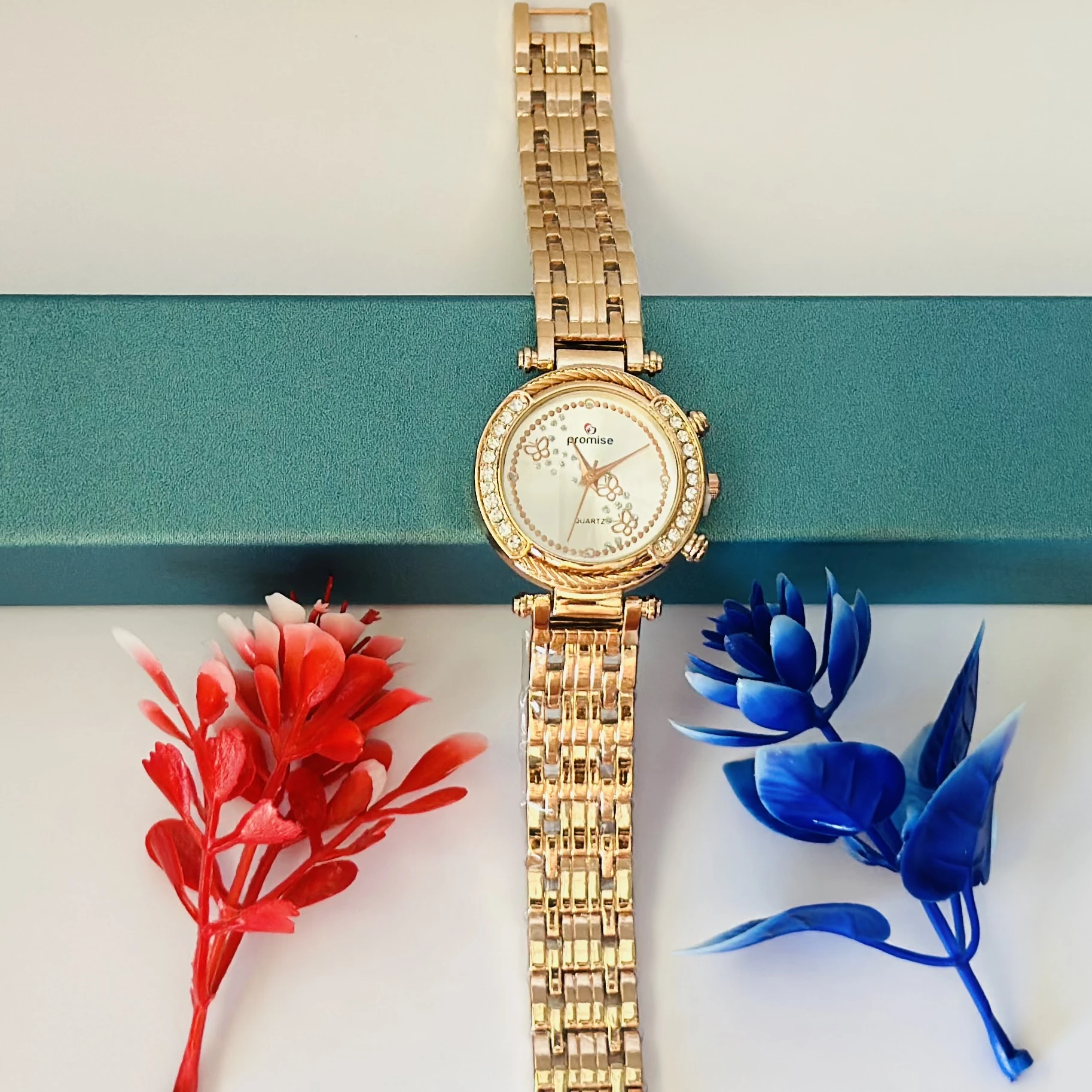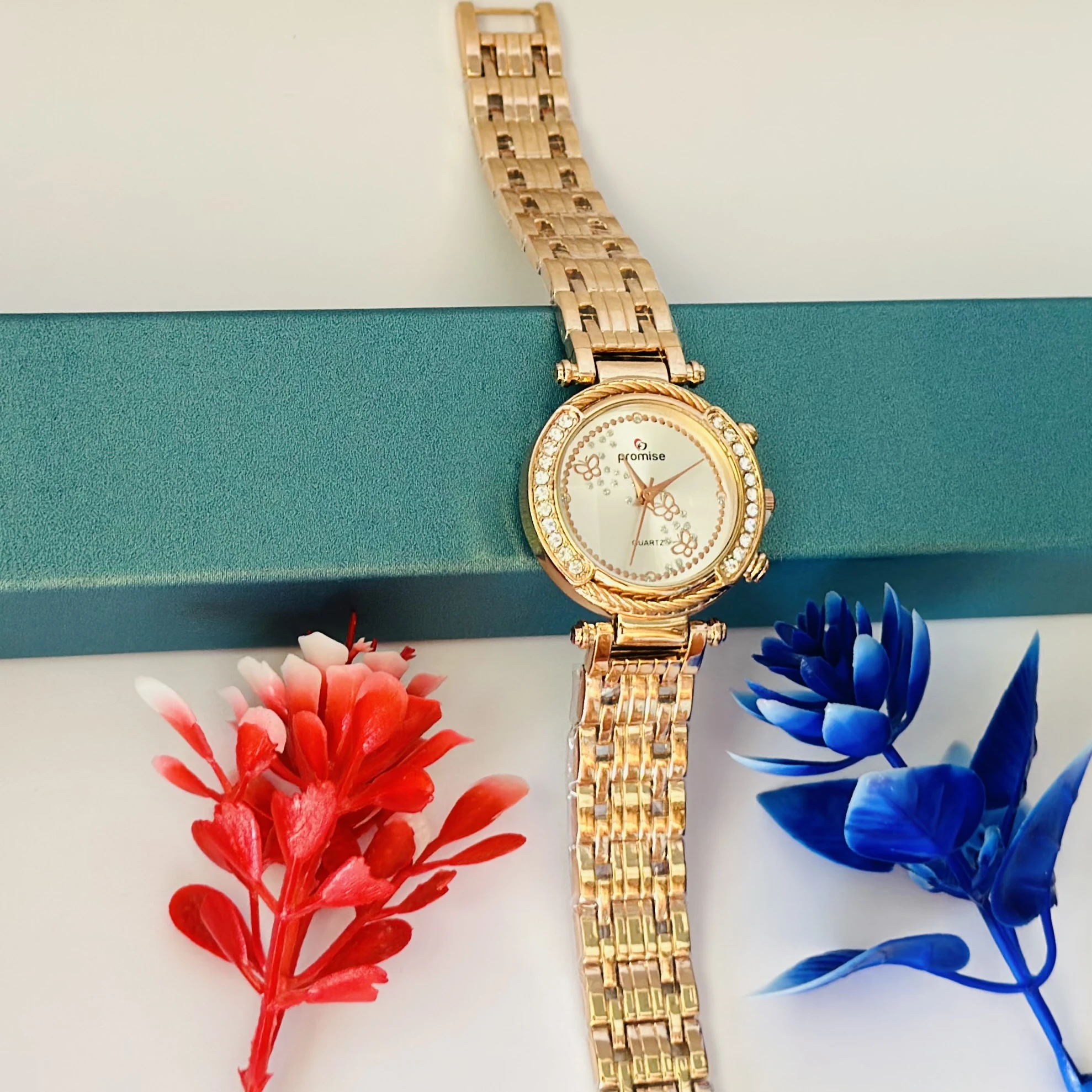👉 Theme :- Promise Quartz watch with a rose gold-tone stainless steel bracelet and crystal-accented bezel.