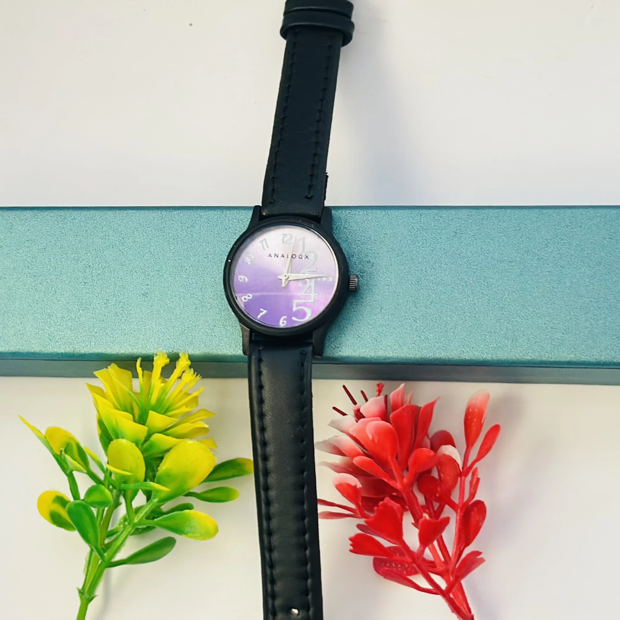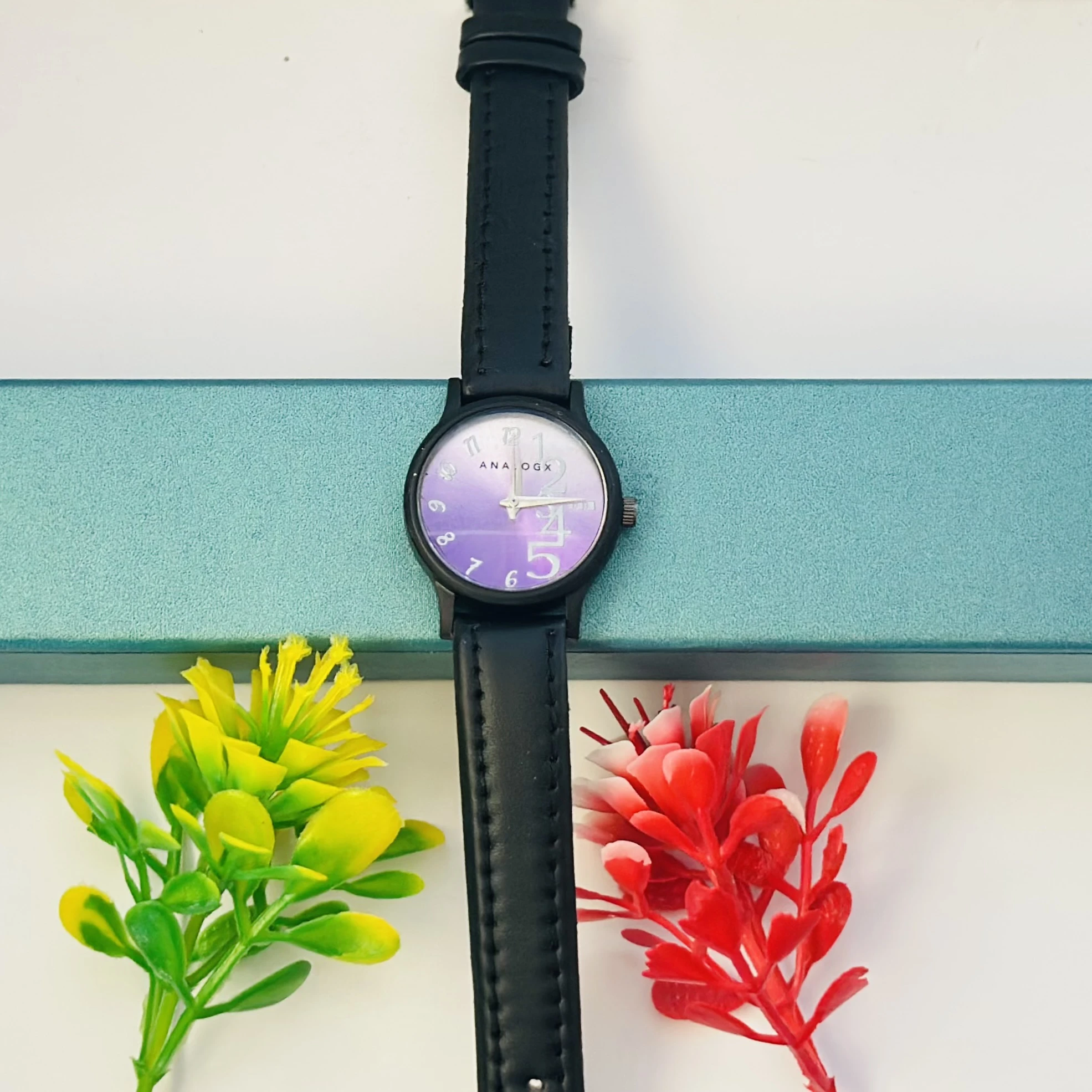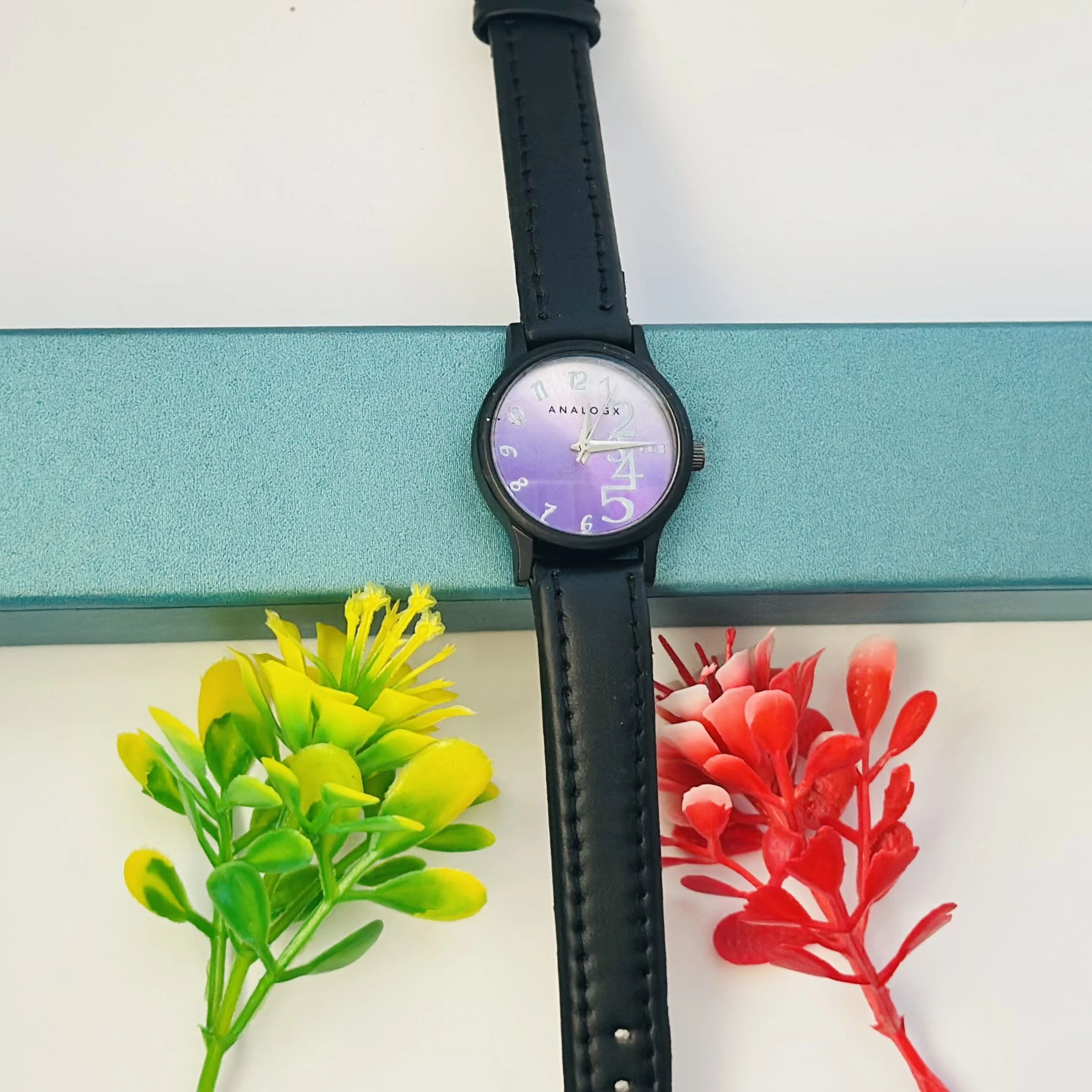 👉 Theme :- purple analog watch with a black leather strap.