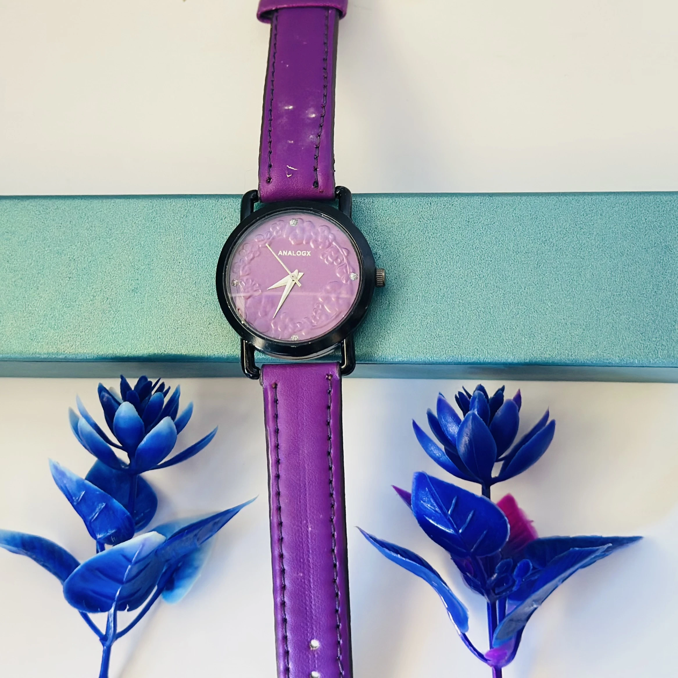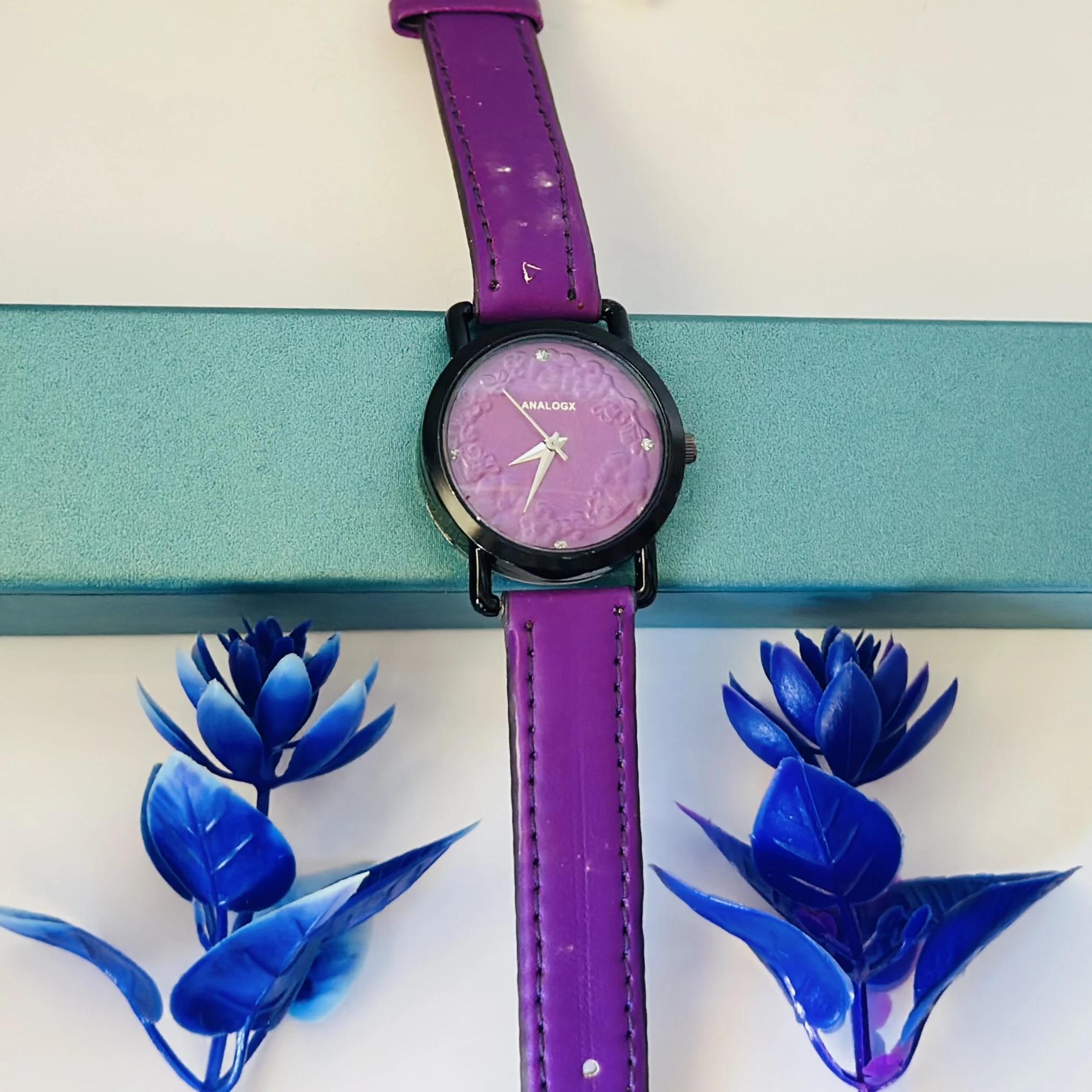 👉 Theme :- purple analog watch with a black leather strap.