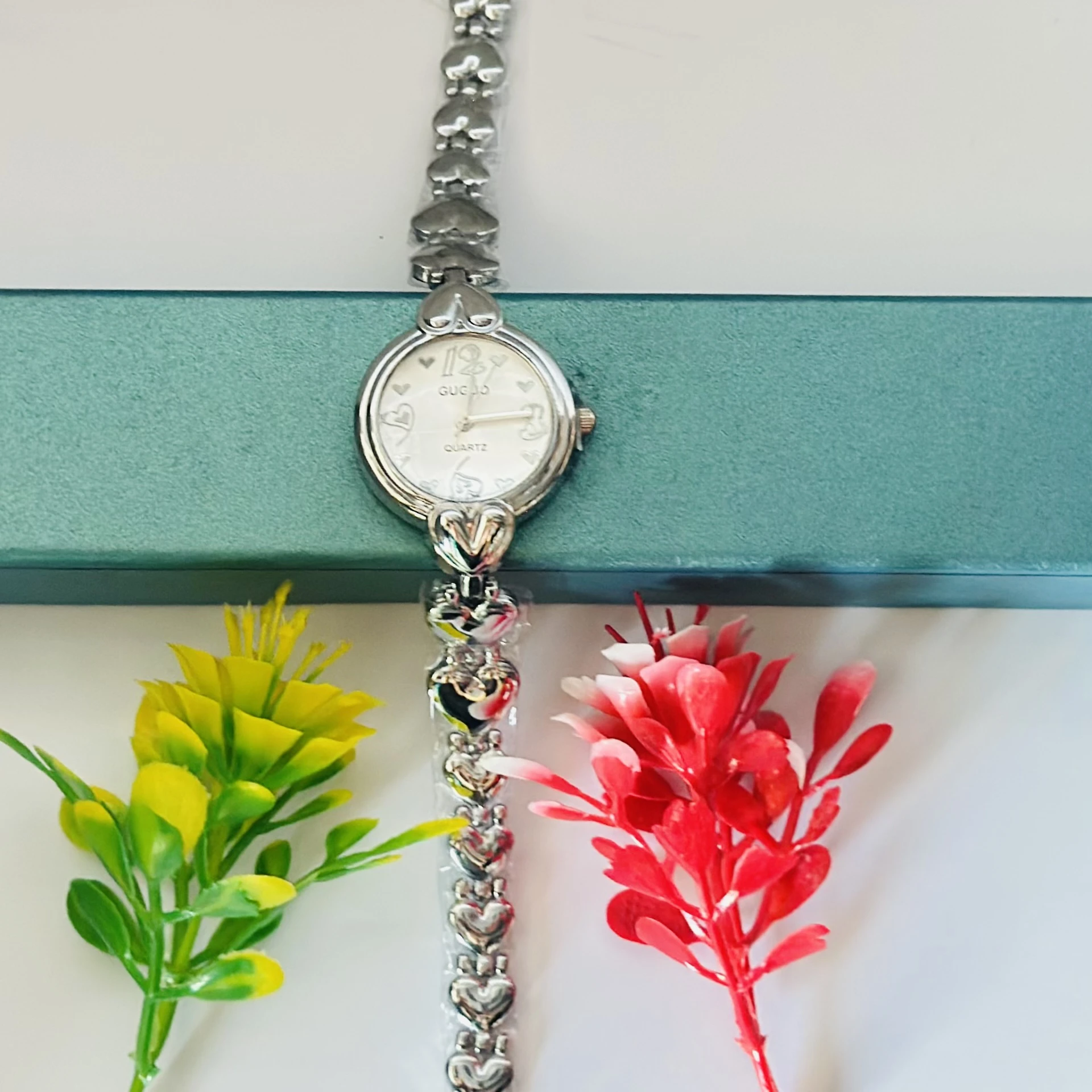 👉 Theme :- Gucio Quartz analog watch for women with a silver heart-link bracelet.
