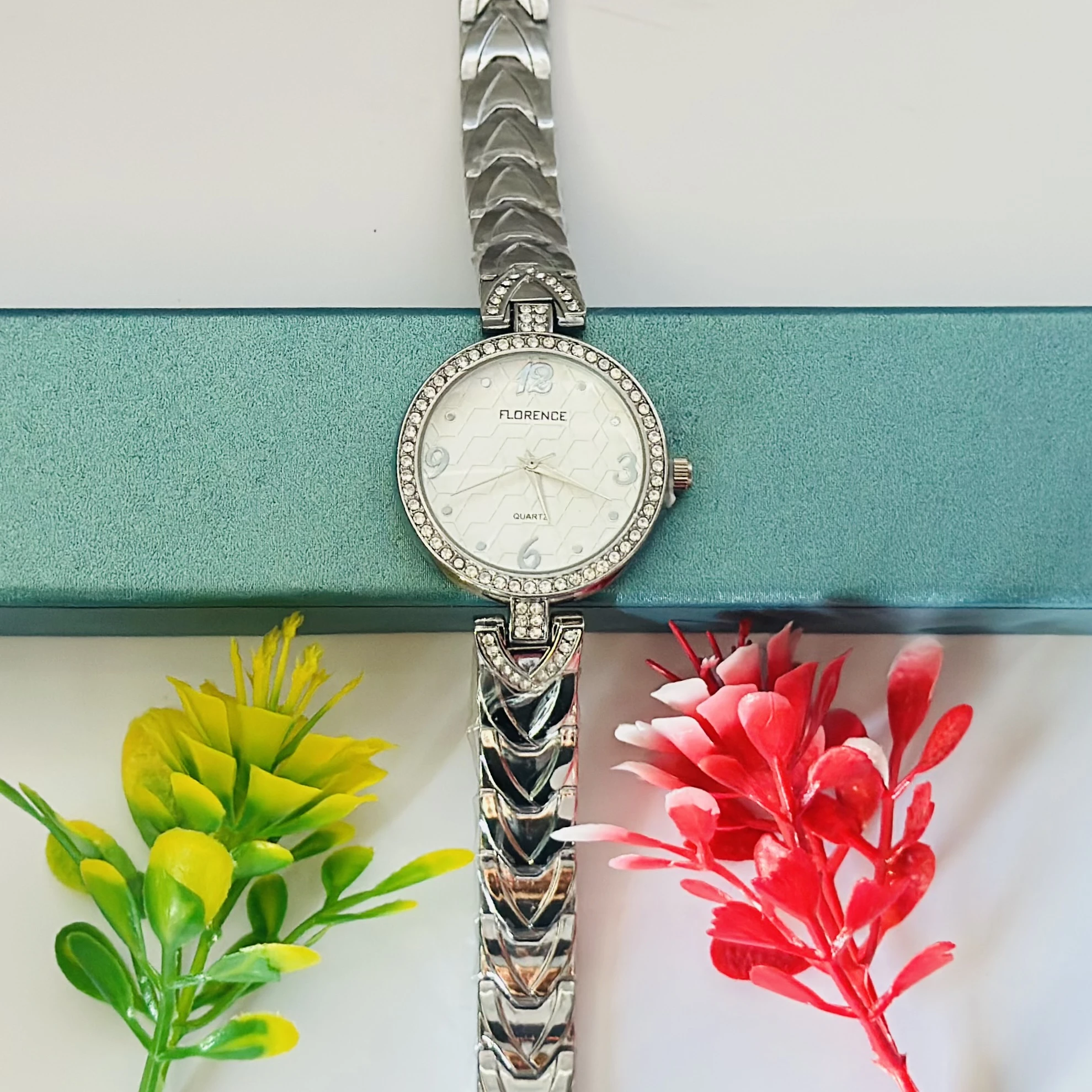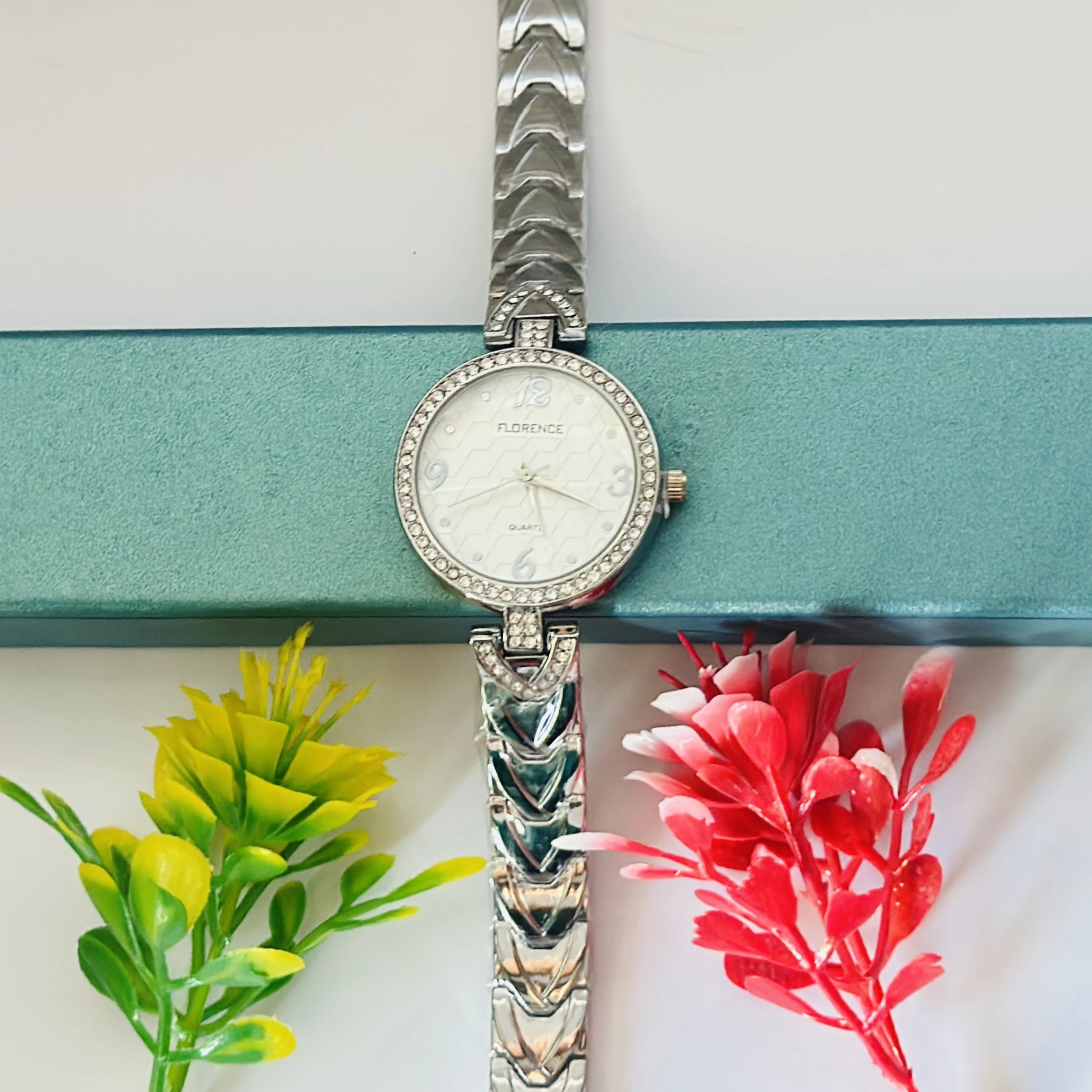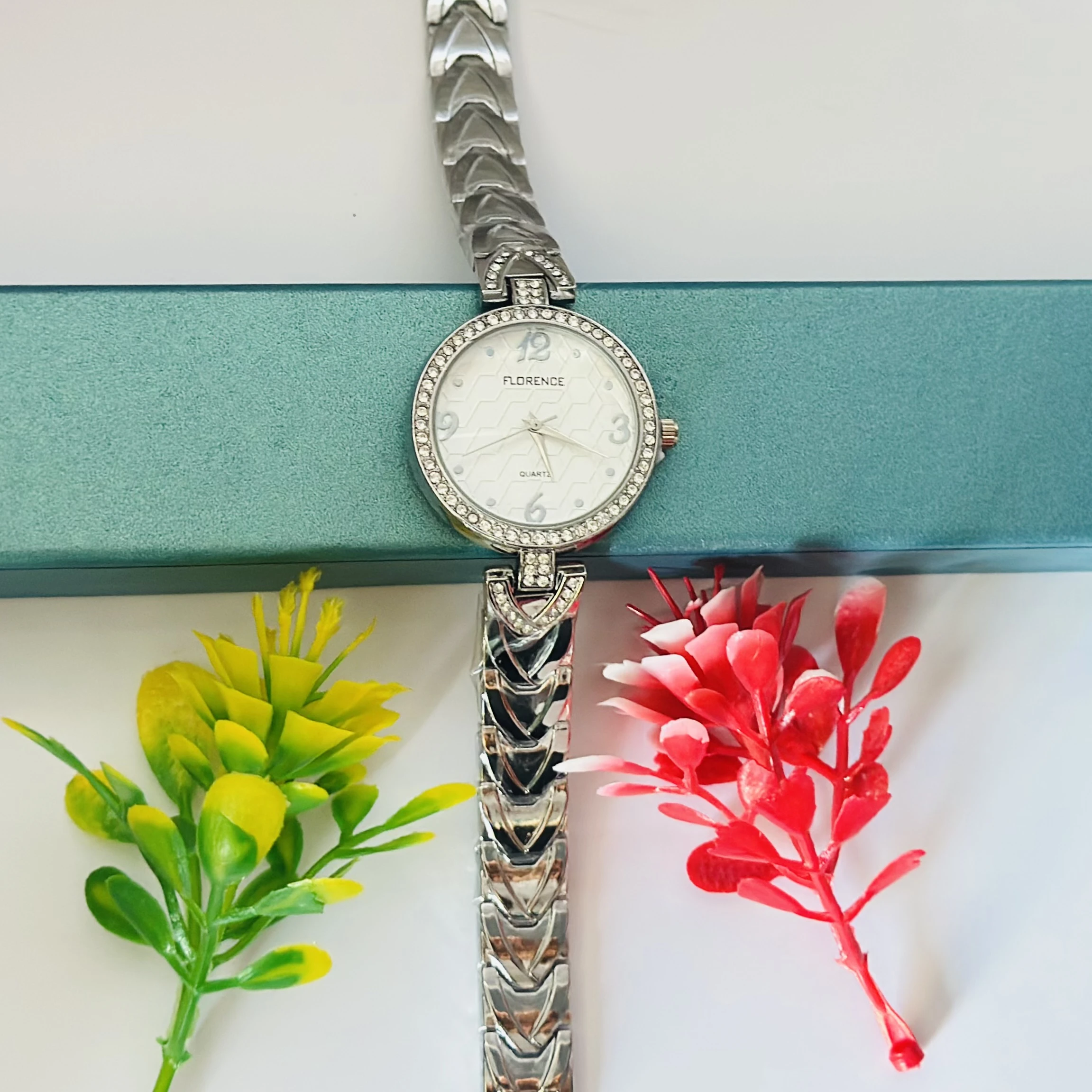 👉 Theme :- Gucio Quartz analog watch for women with a silver heart-link bracelet.
