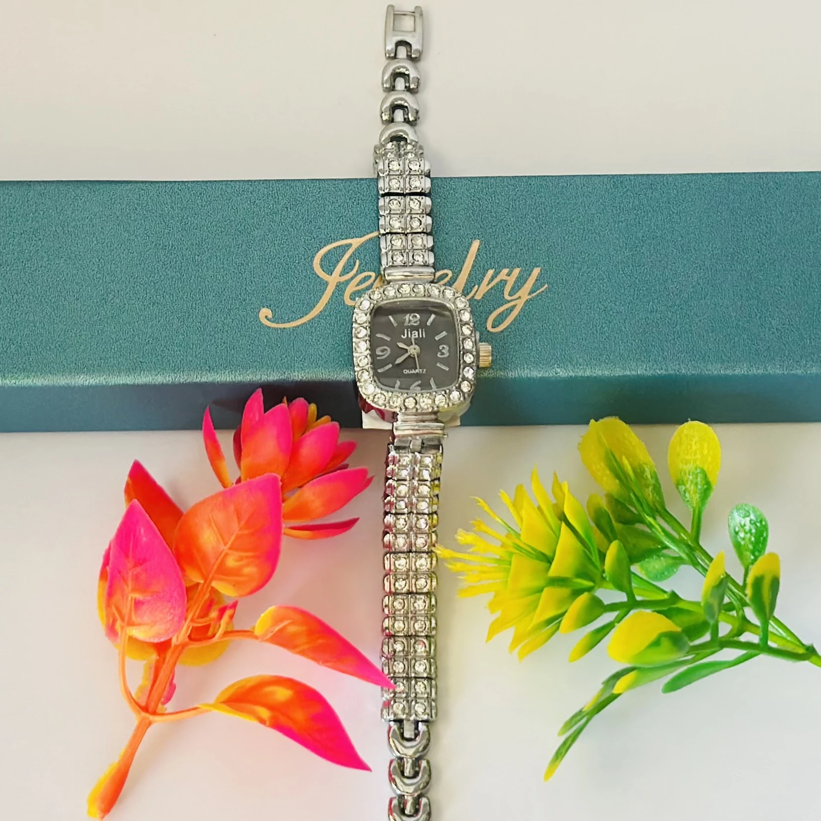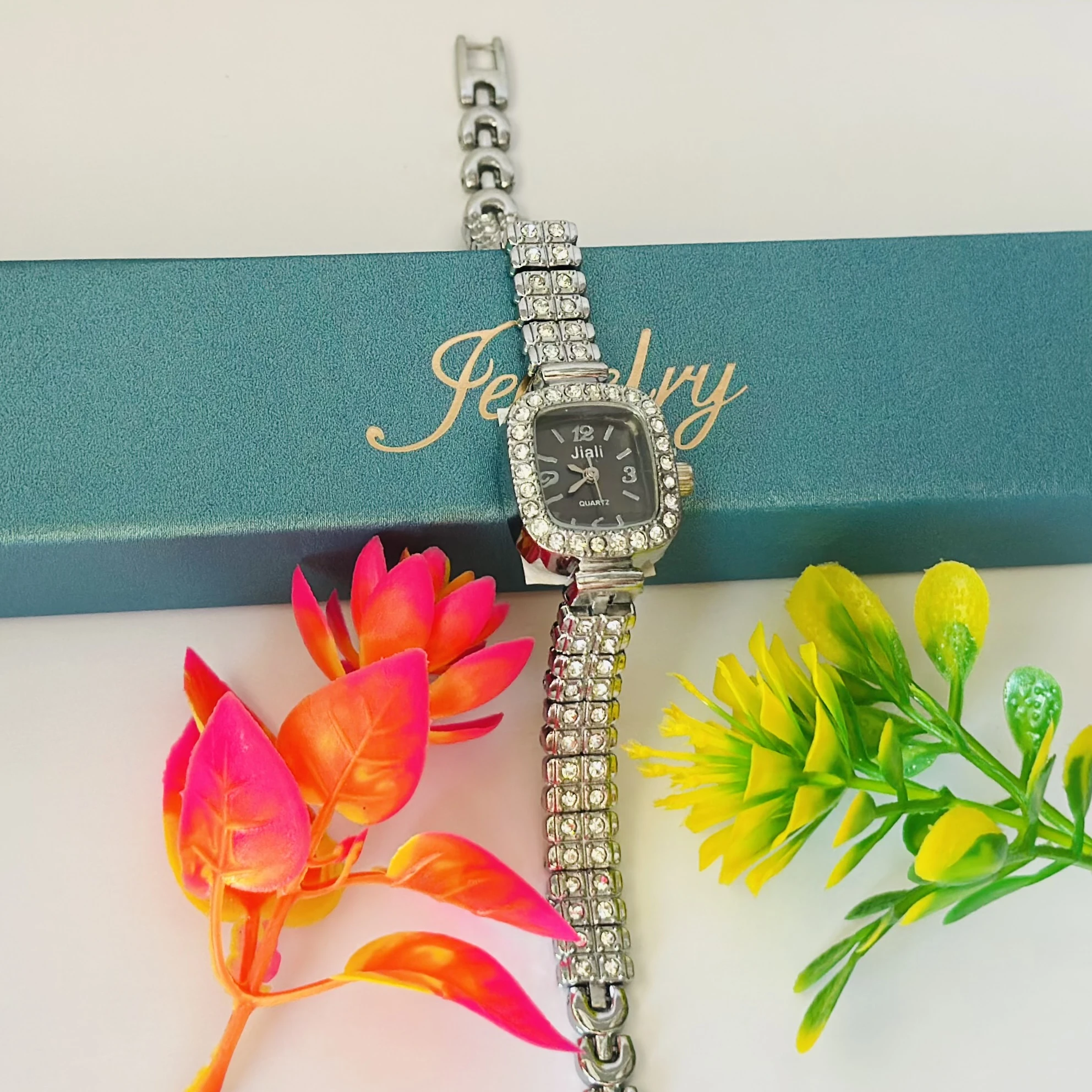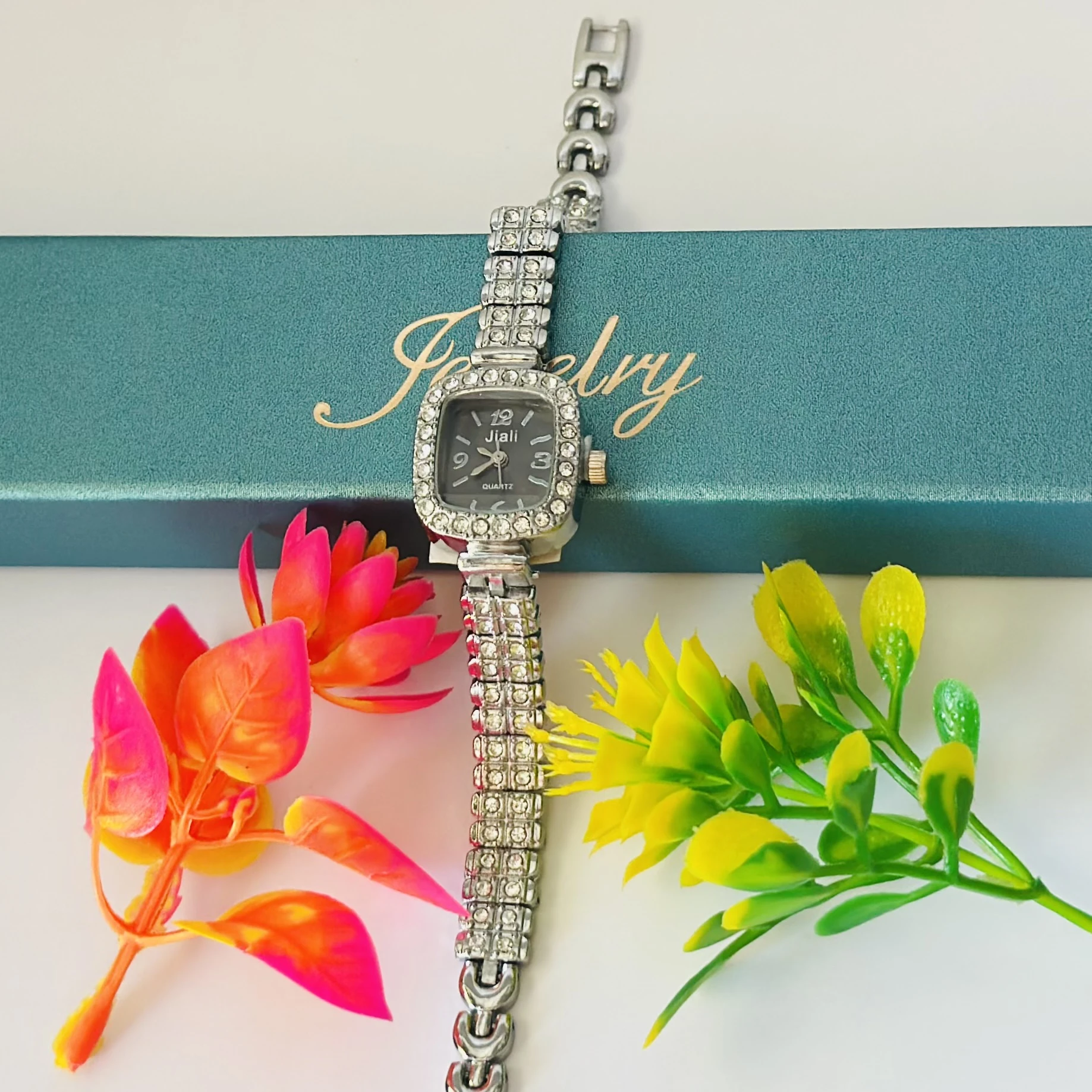 👉 Theme :- Quartz watch with a silver-tone rhinestone-encrusted case and a matching metal bracelet.