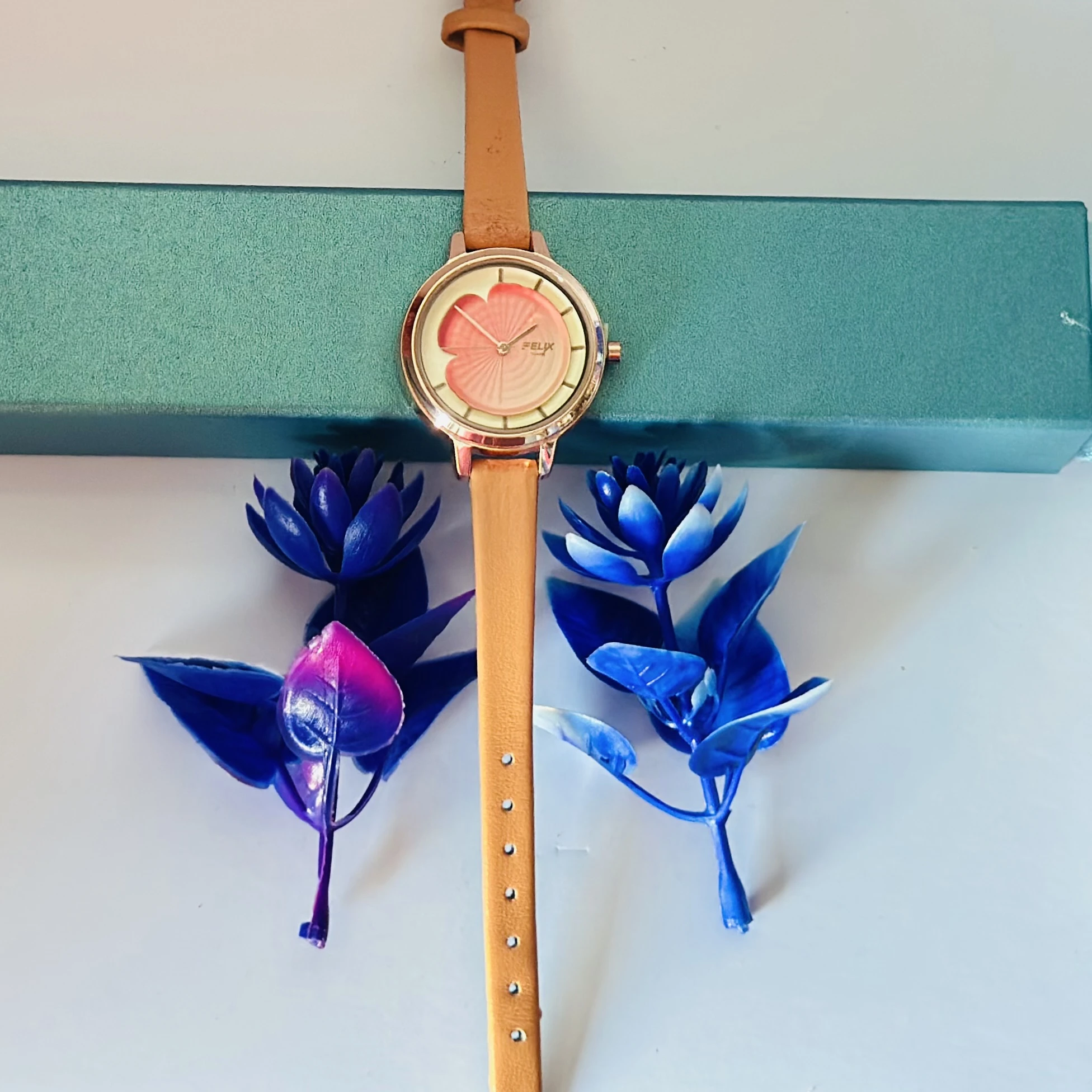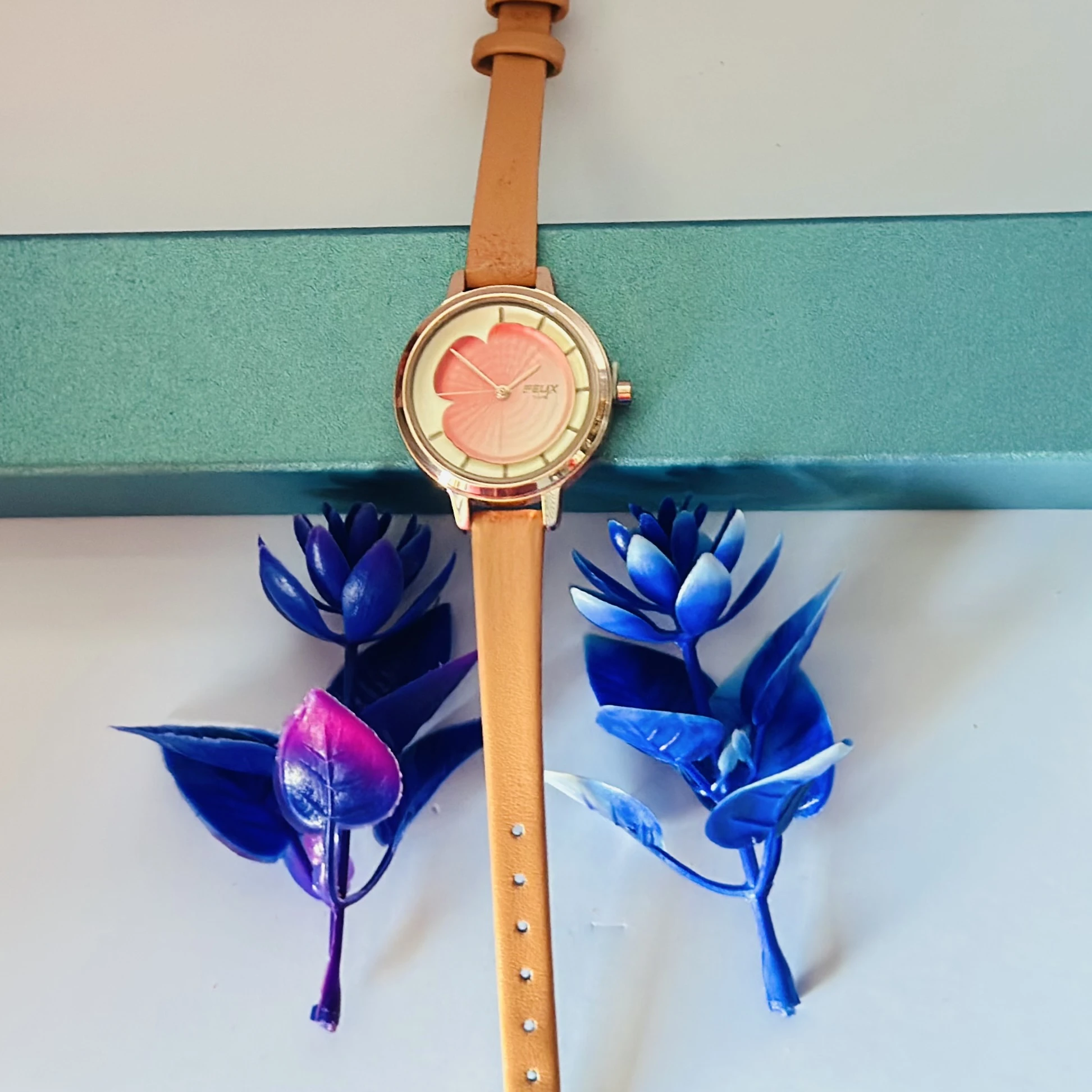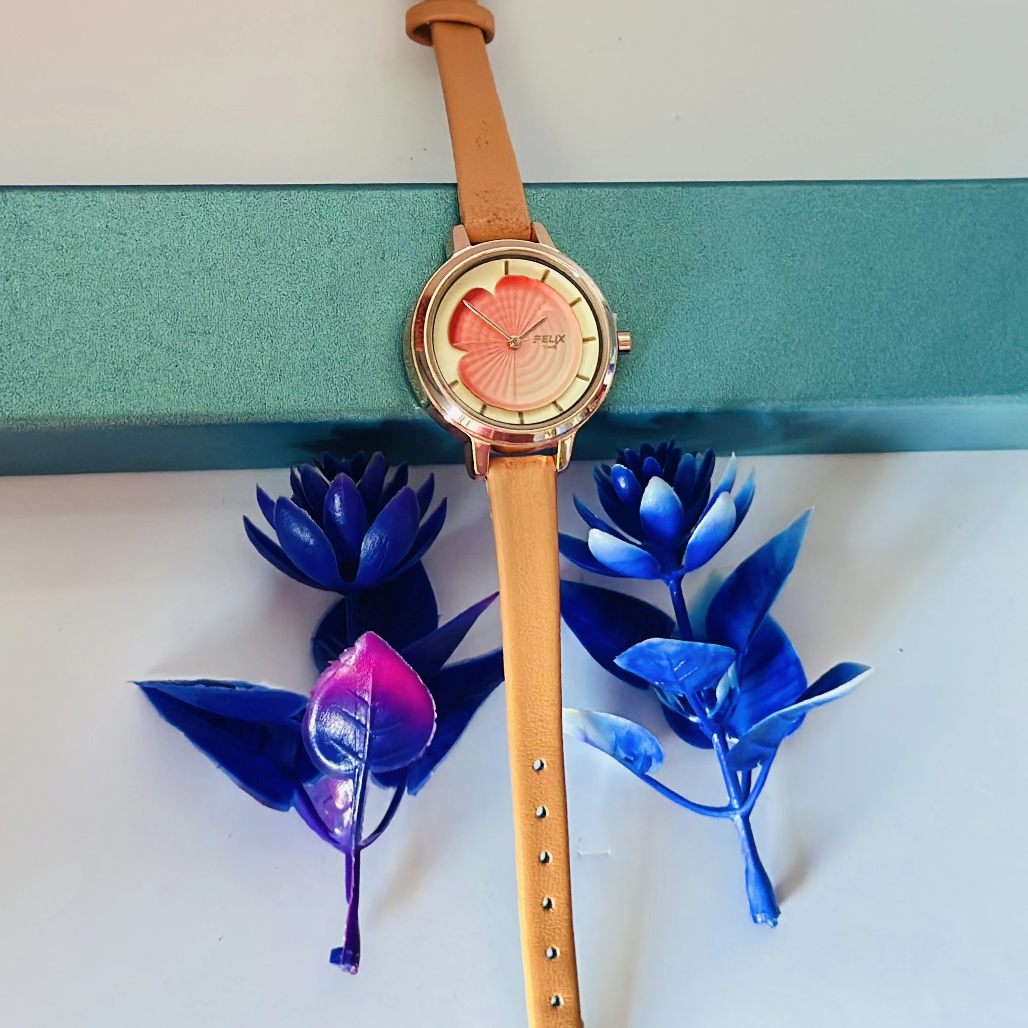 👉 Theme :- Quartz Analog watch for women with a multi-coloured dial and a pink leather strap.