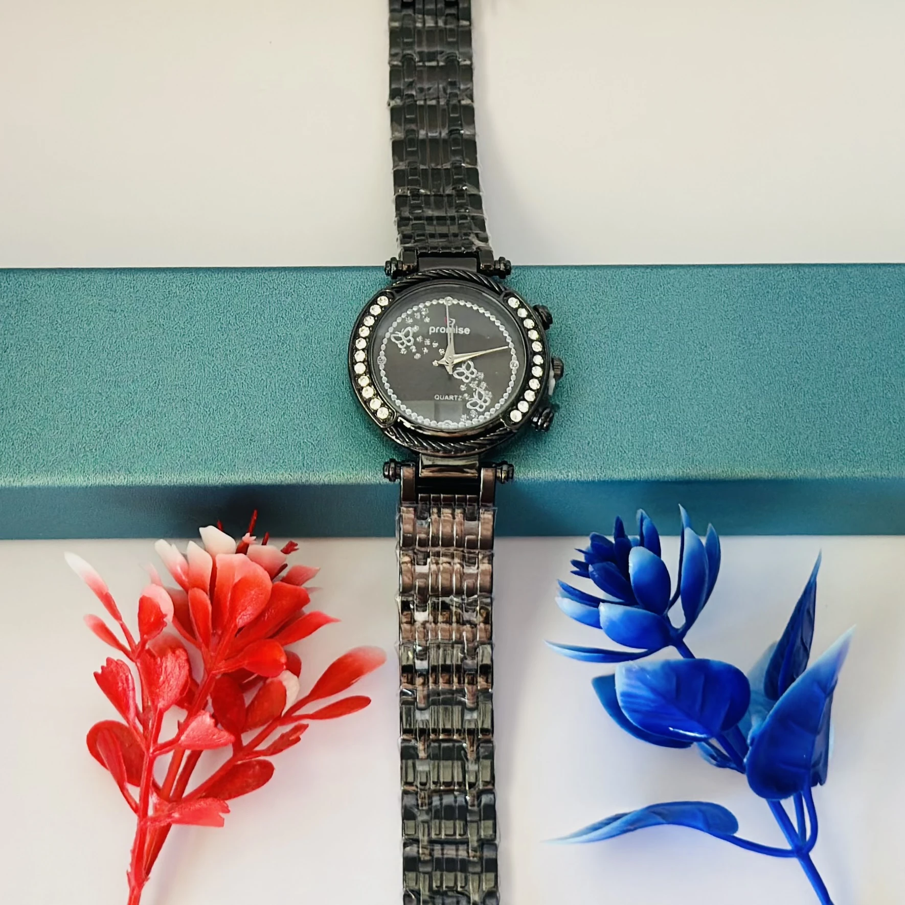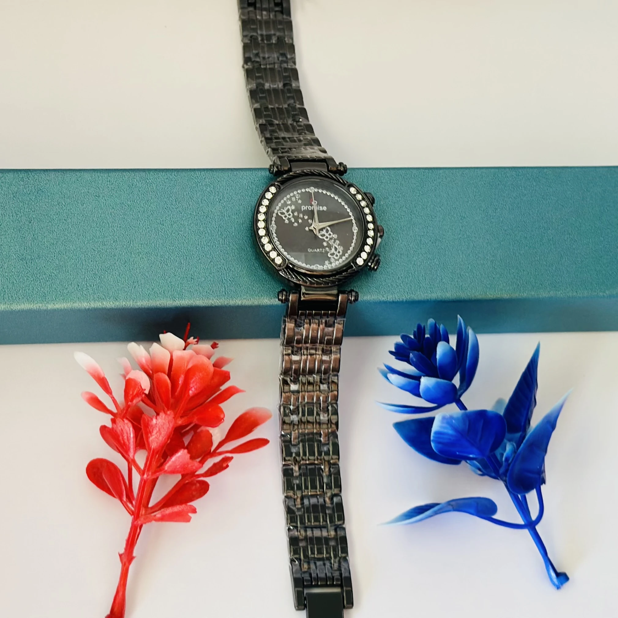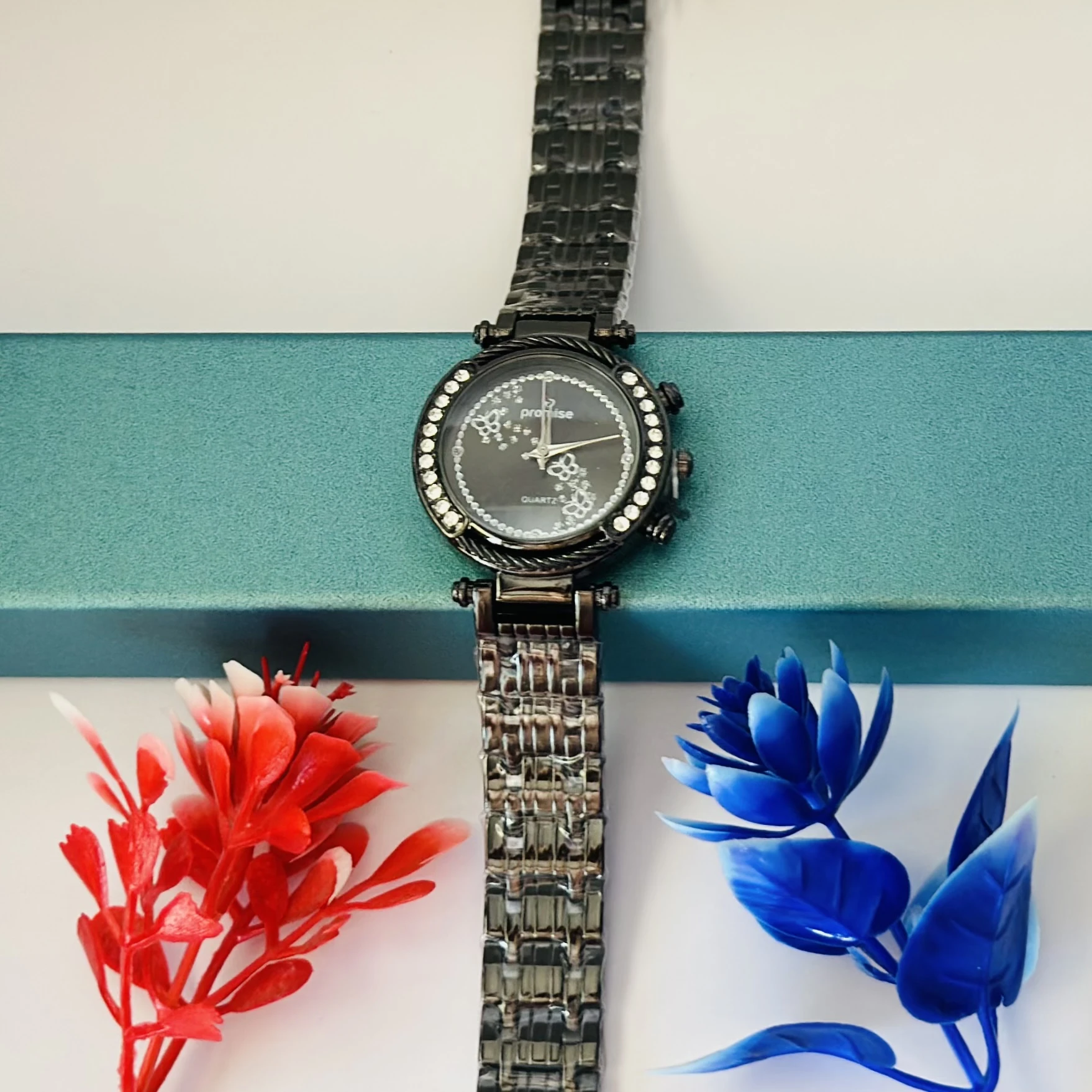 👉 Theme :- Quartz analog watch with a metal link strap and crystal accents on the bezel and dial.