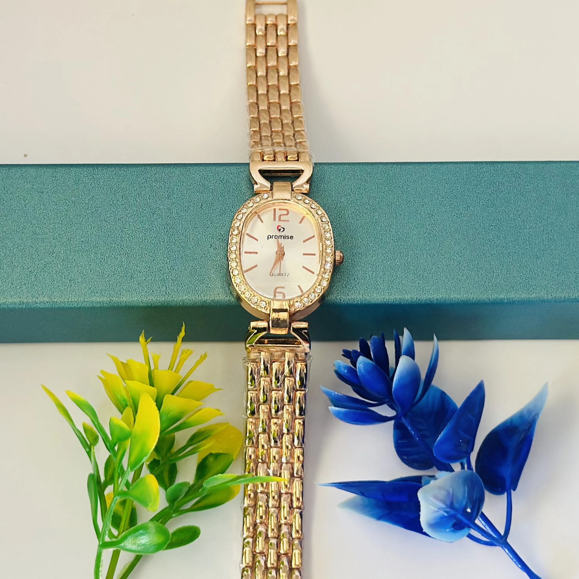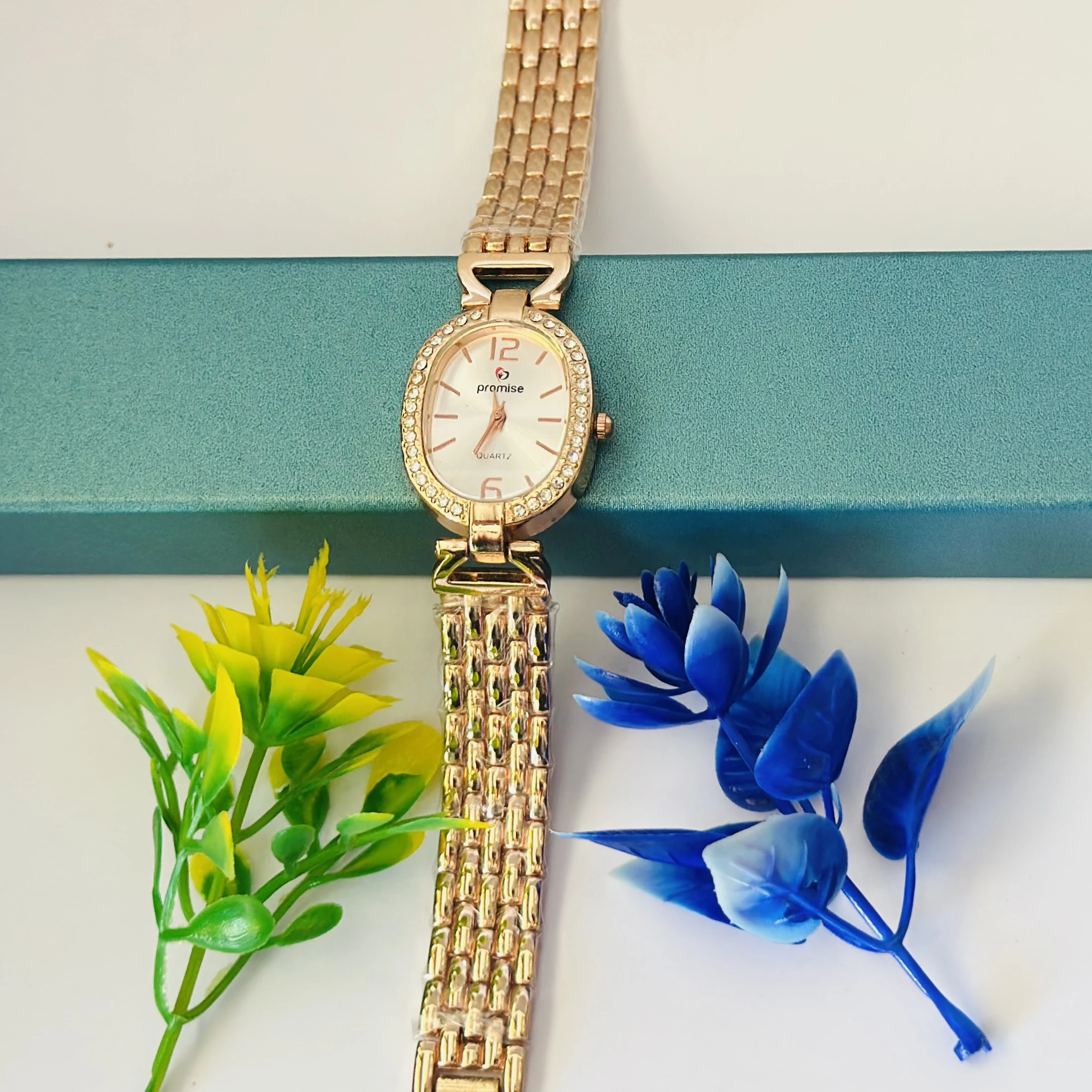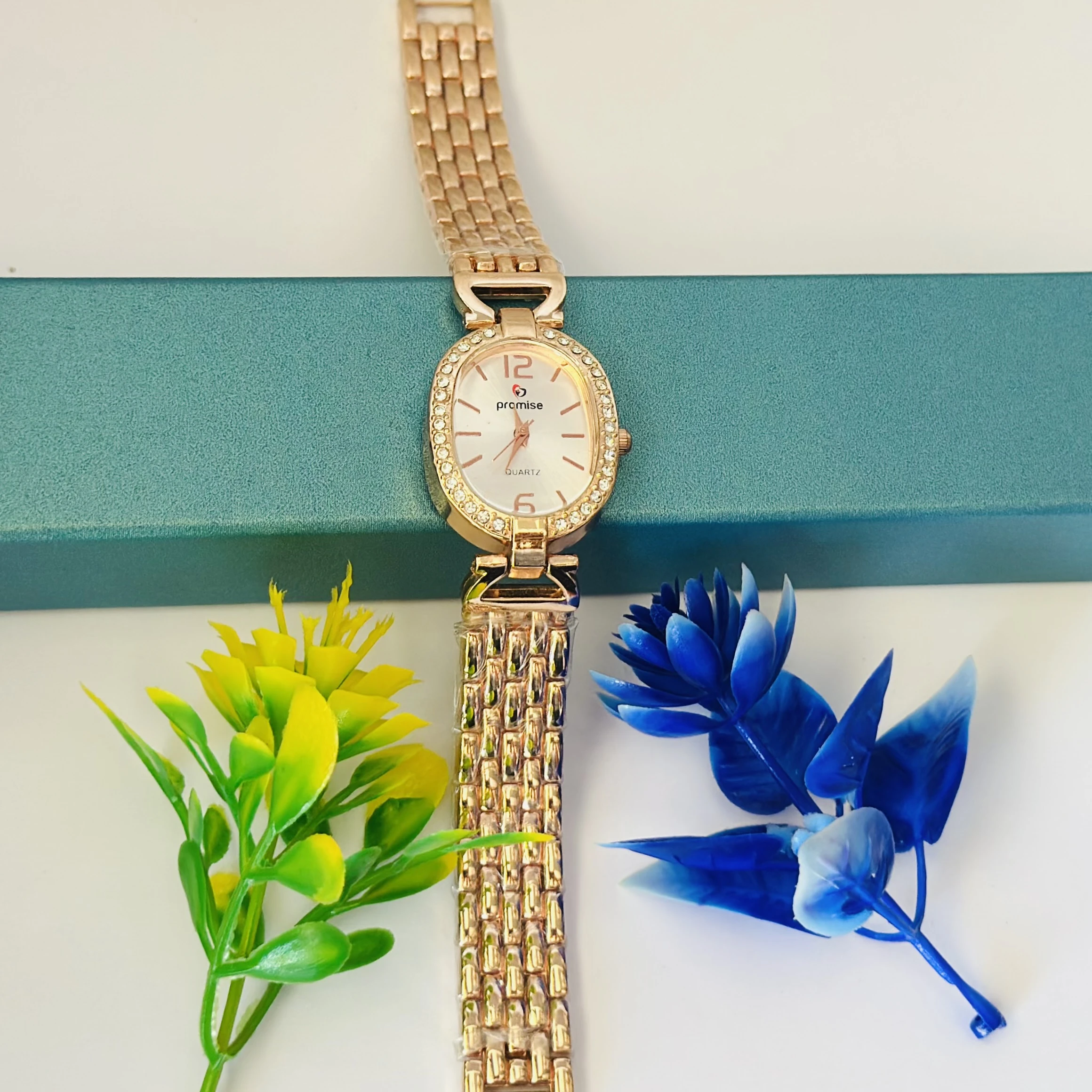 👉 Theme :- Quartz analog wrist watch with a rose gold-tone metal band and a white dial with crystal accents.