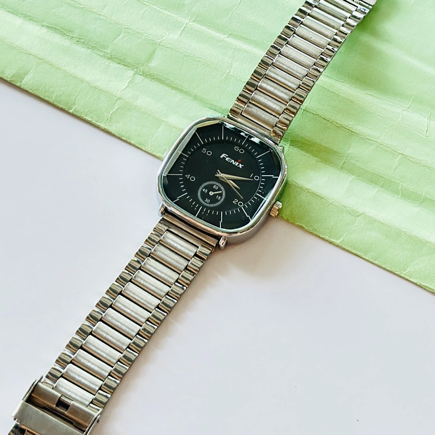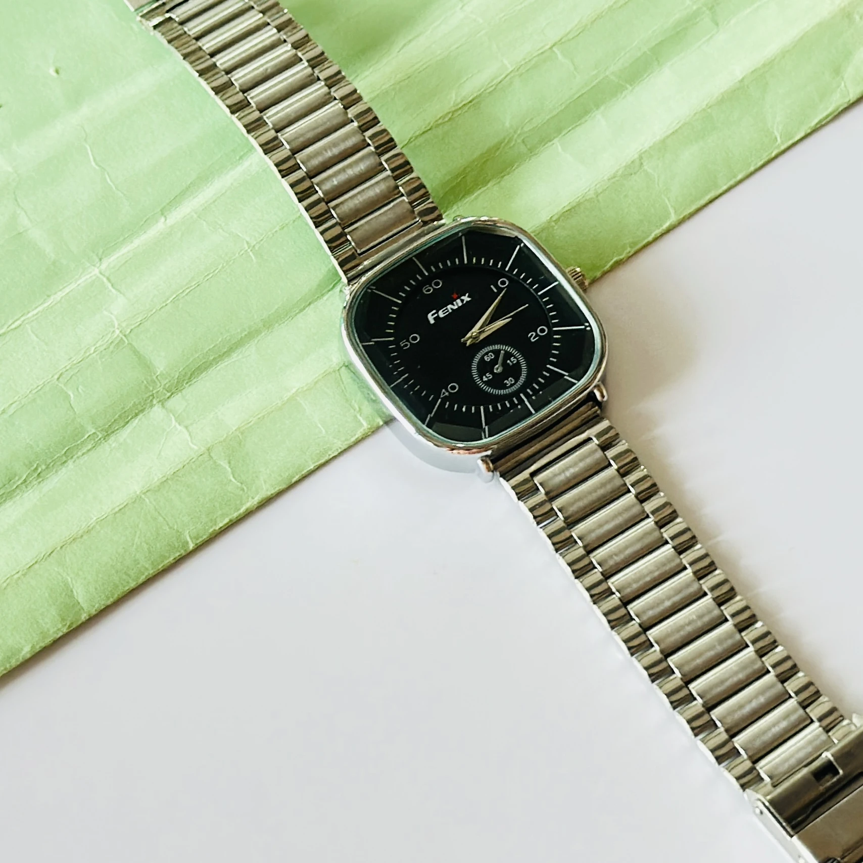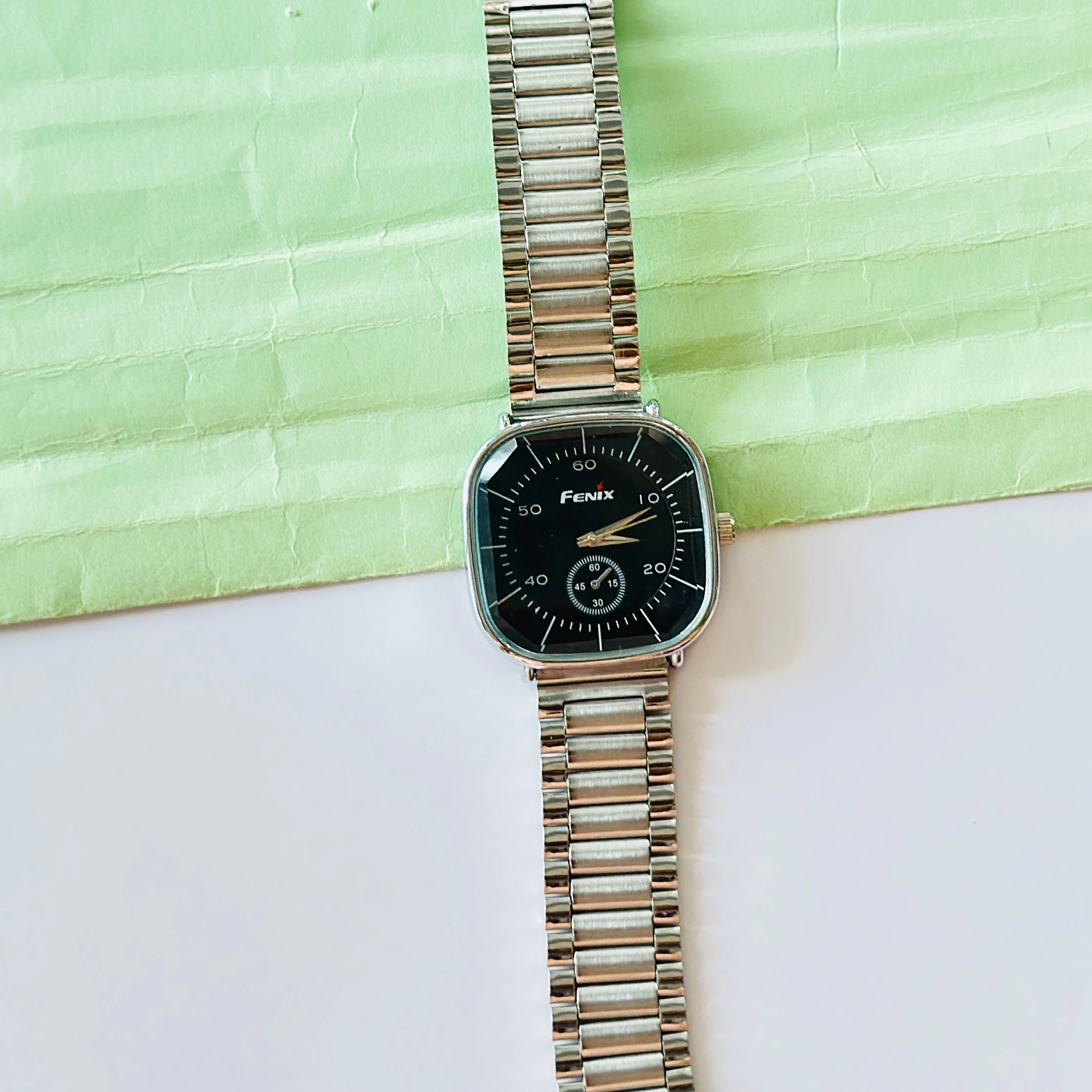 👉 Theme :- Fenix brand square-shaped analog wristwatch with a silver-toned metal strap.