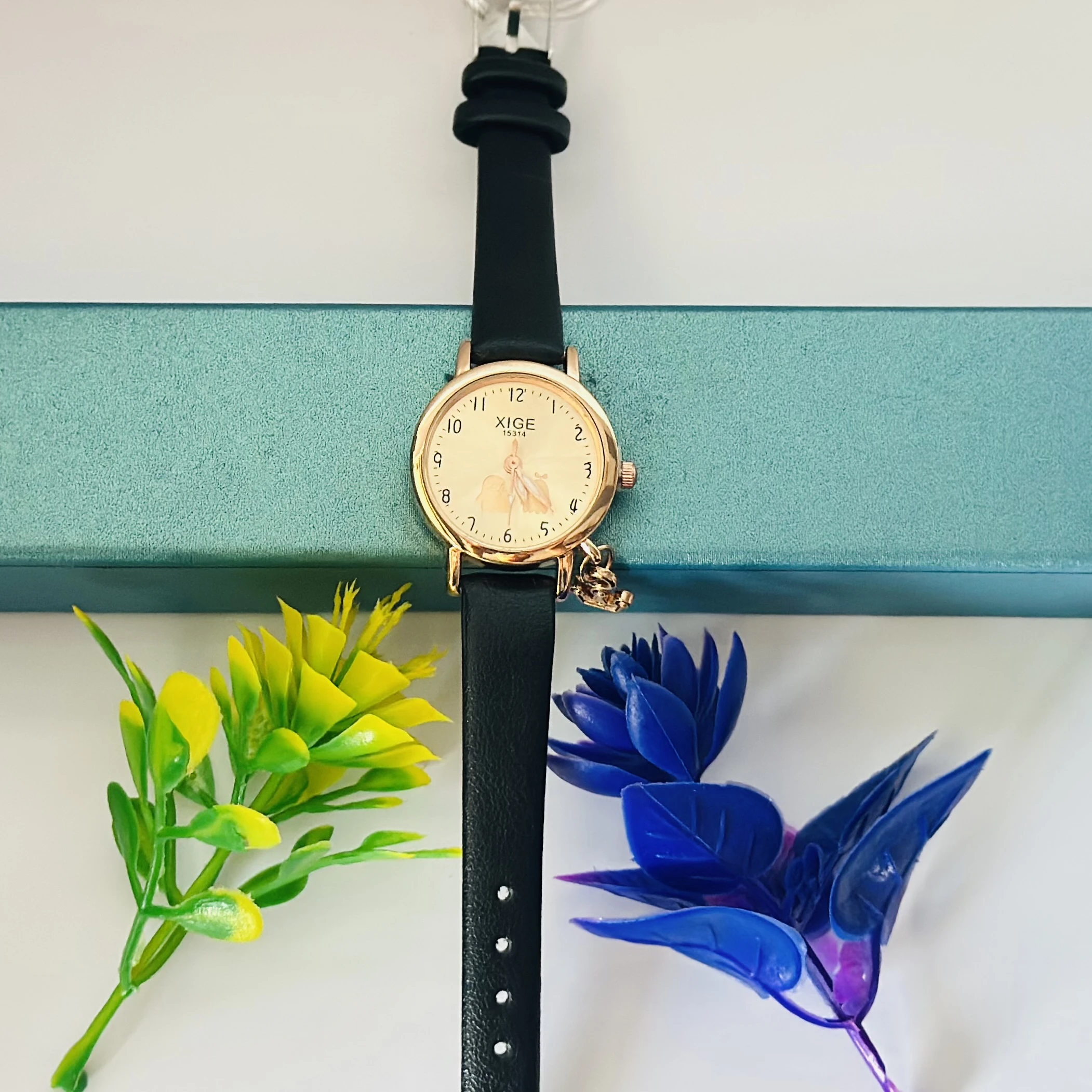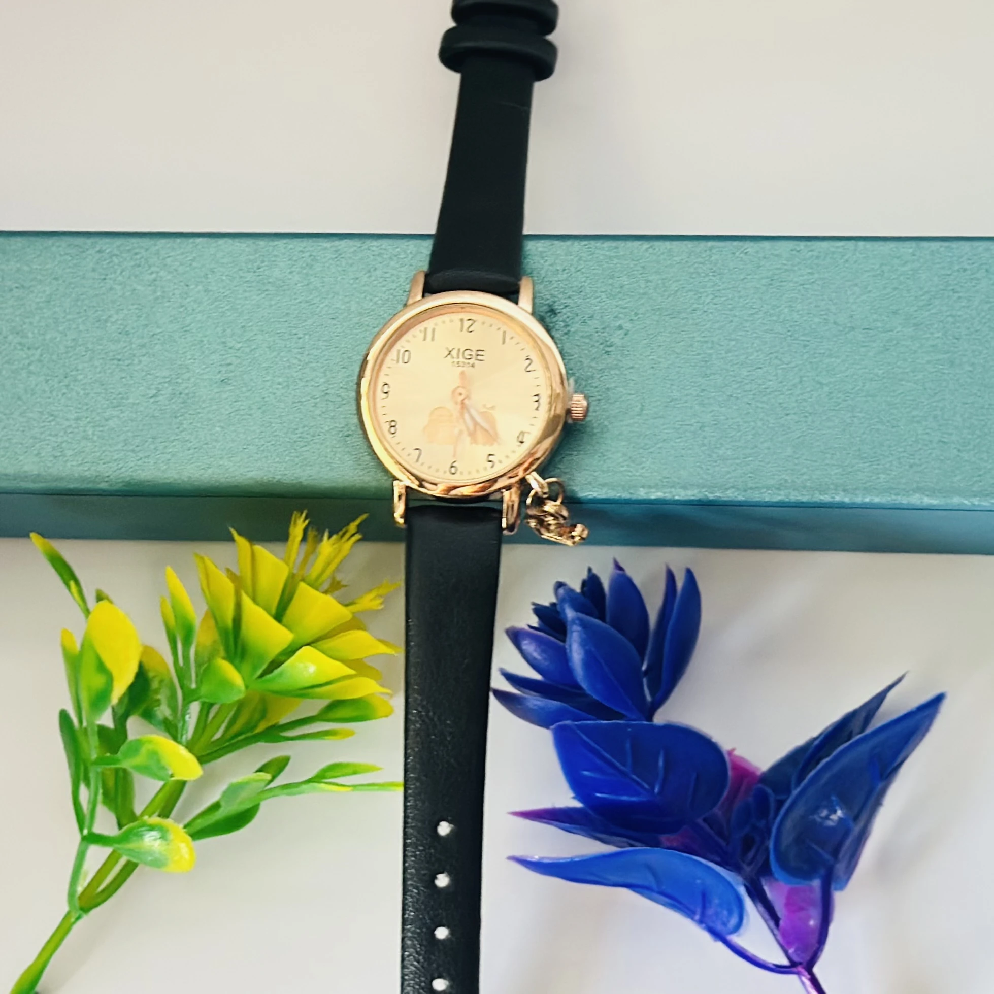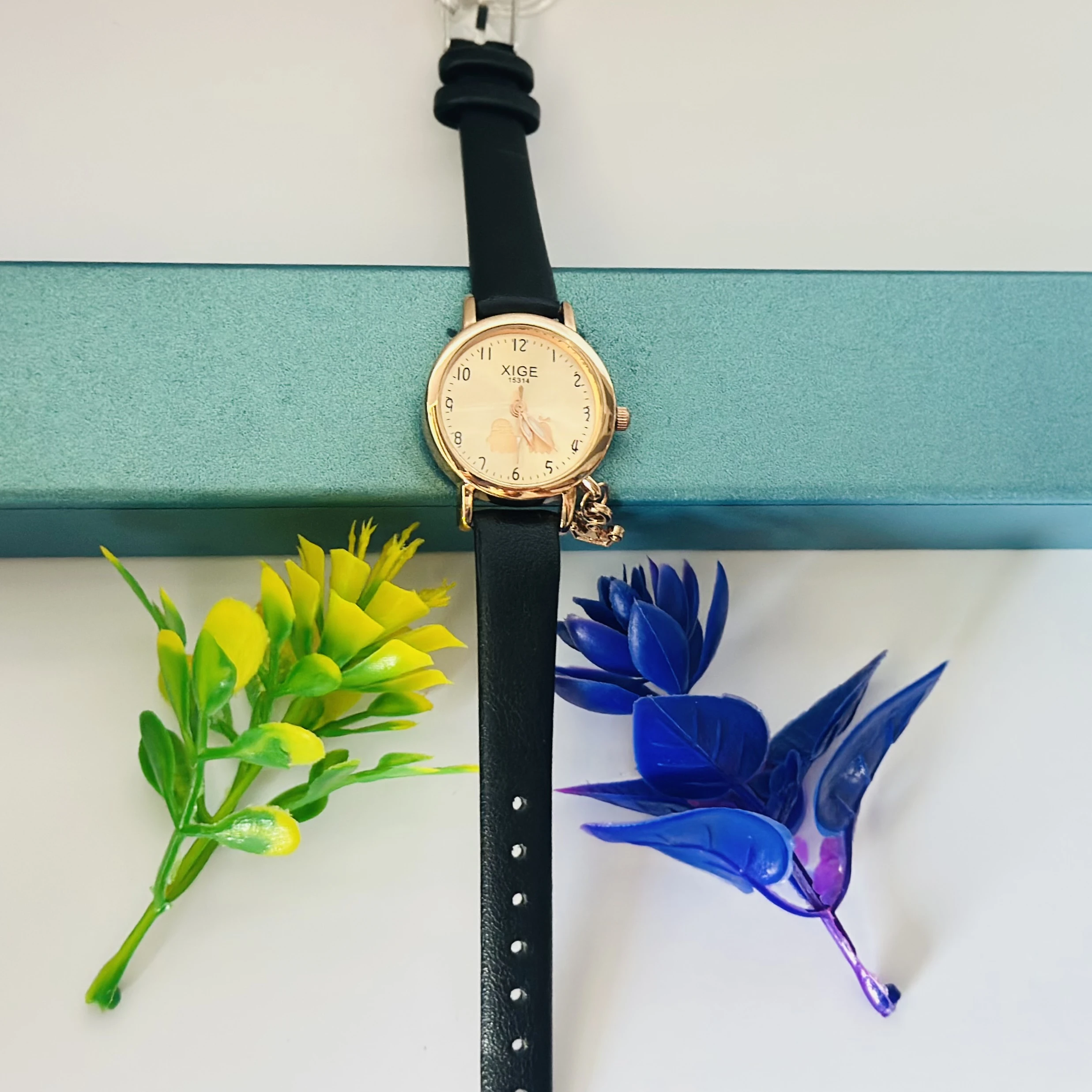 👉 Theme :- Quartz watch with a black leather band and a rose gold-tone case.
