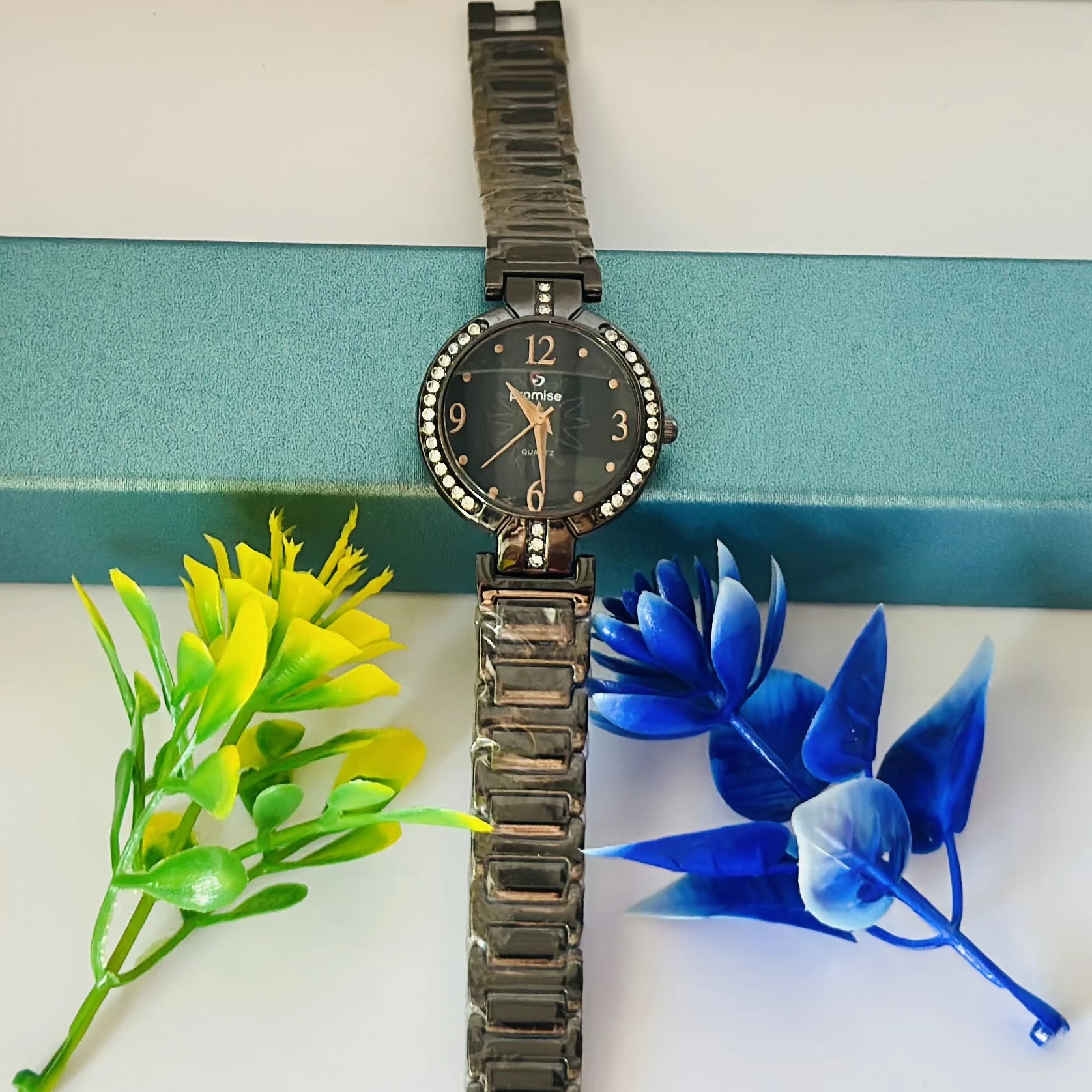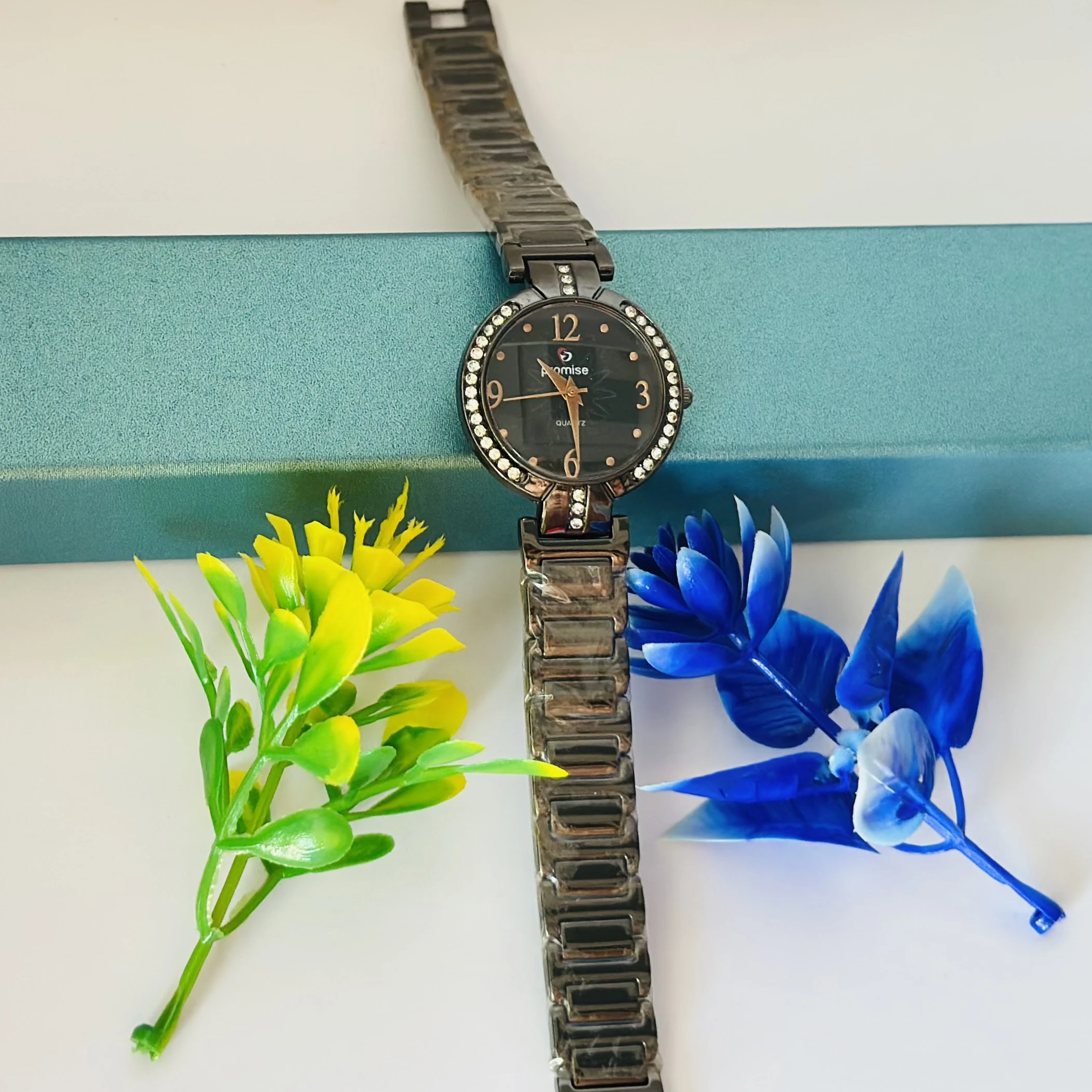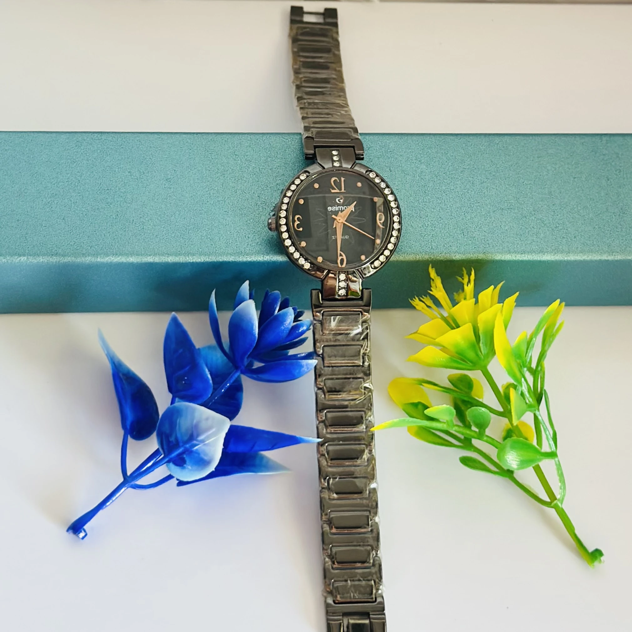 👉 Theme :- Quartz women's watch with a black dial, rhinestone-studded bezel, and a gunmetal-tone metal strap.
