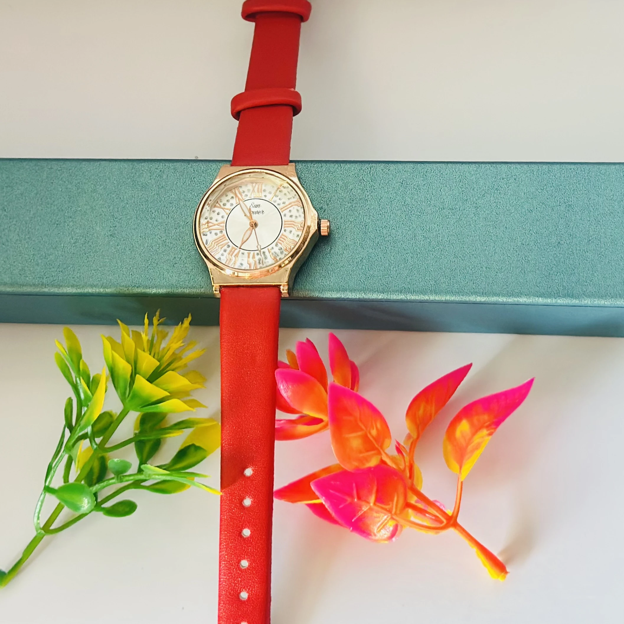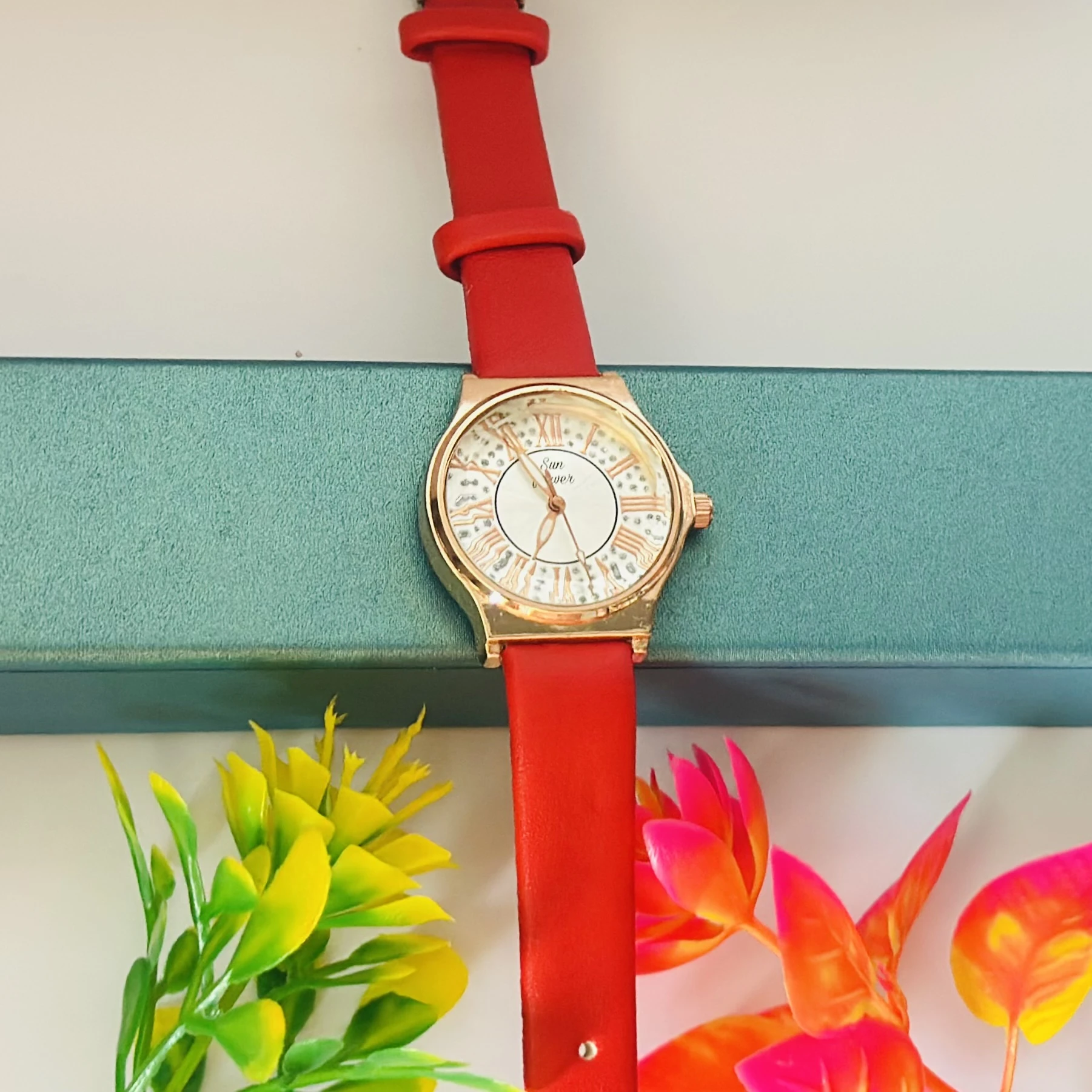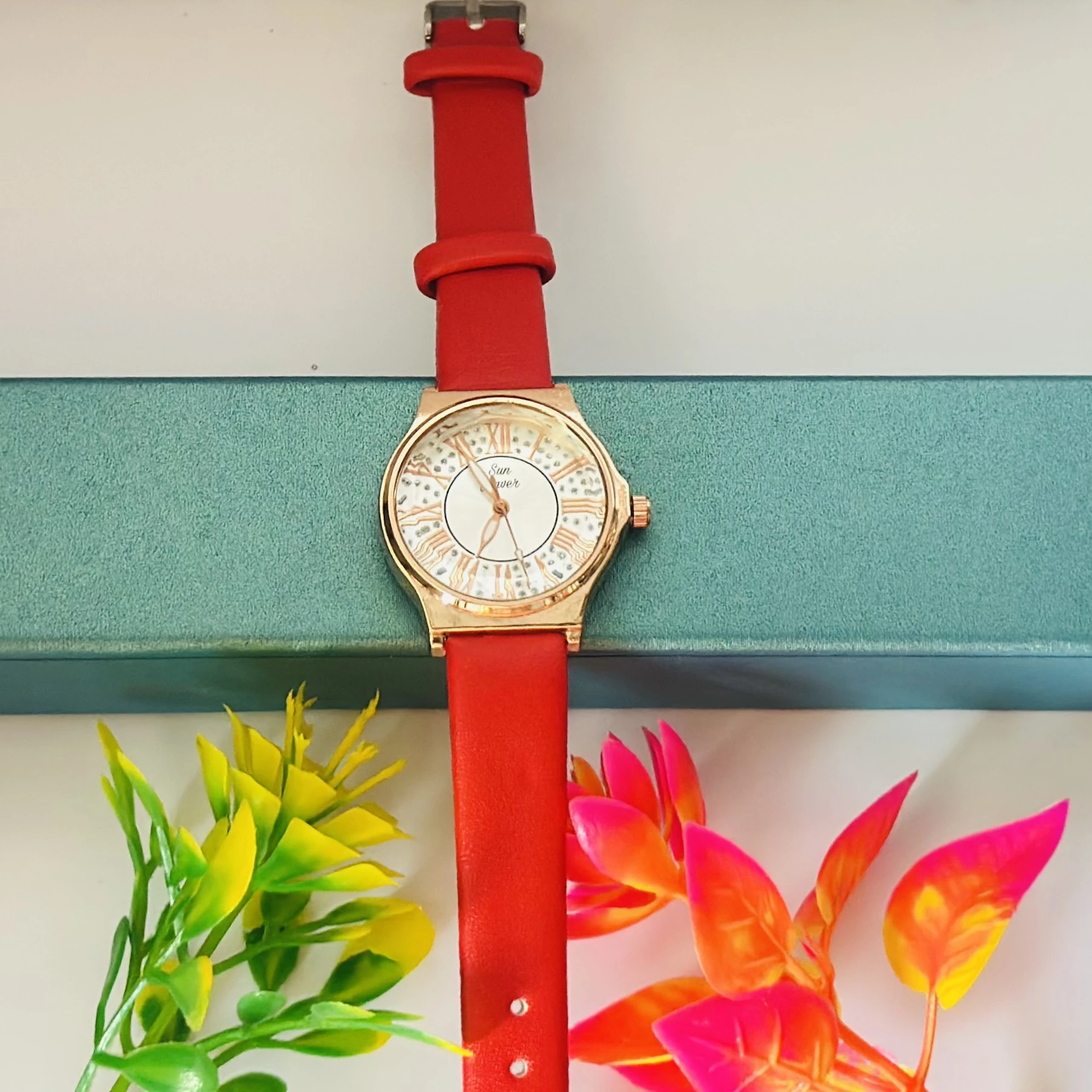 👉 Theme :- Red analog watch with a rose gold-tone case and a white mother-of-pearl dial featuring Roman numerals.