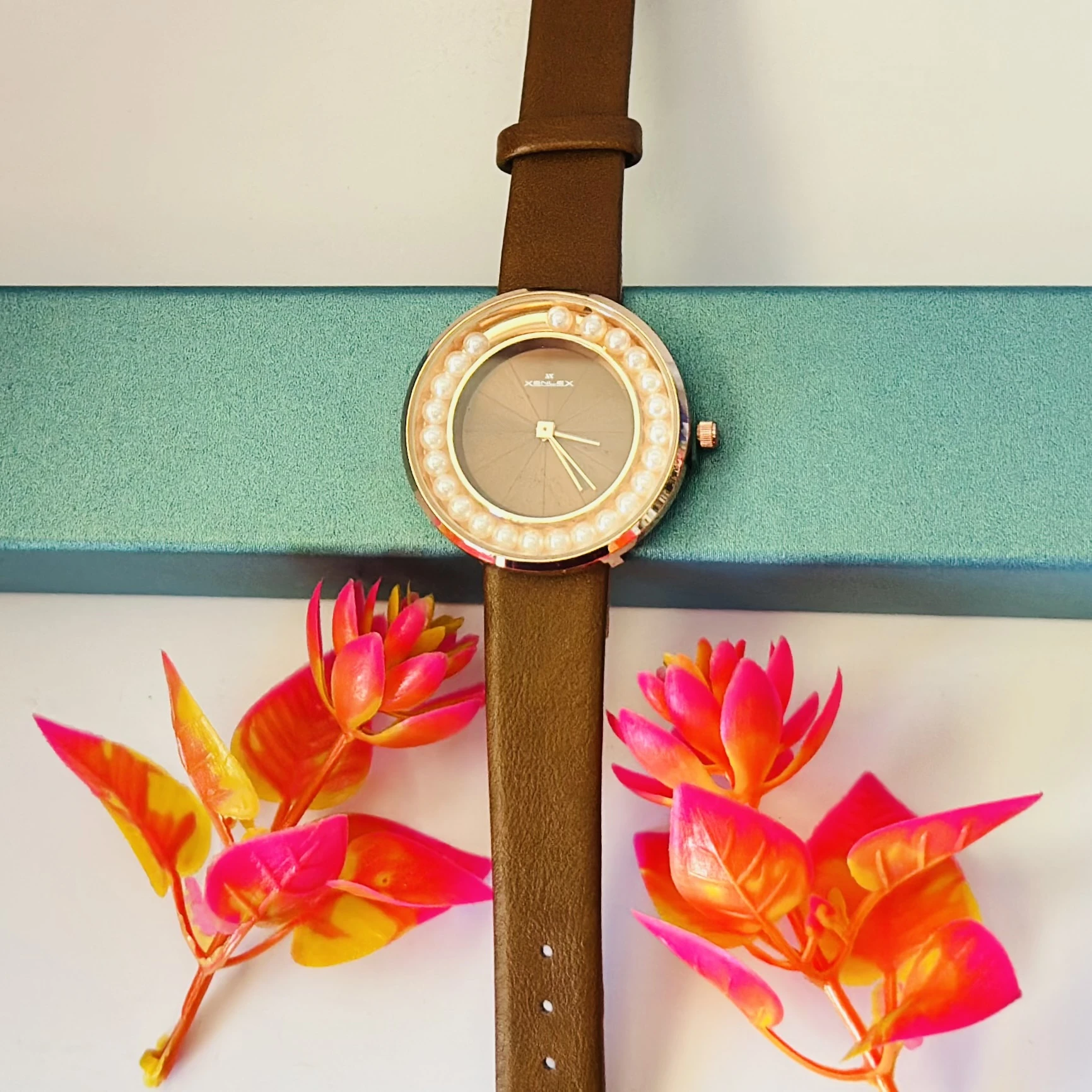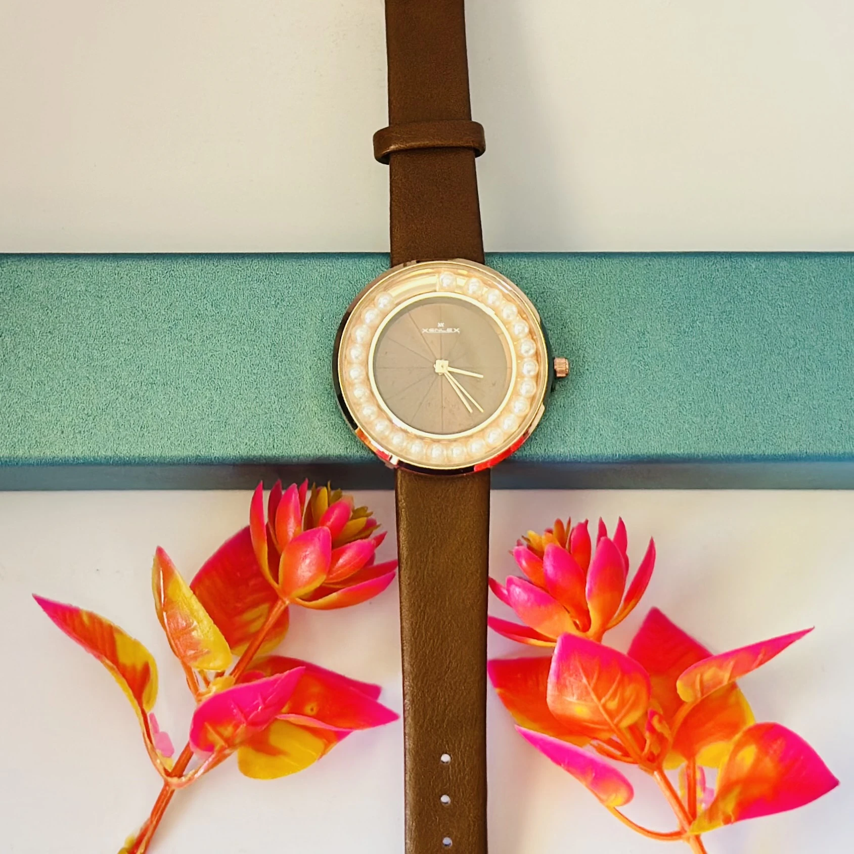 👉 Theme :- Rhodenwald & Söhne women's analog Japan quartz watch with a brown genuine leather band and a pearl-decorated dial.