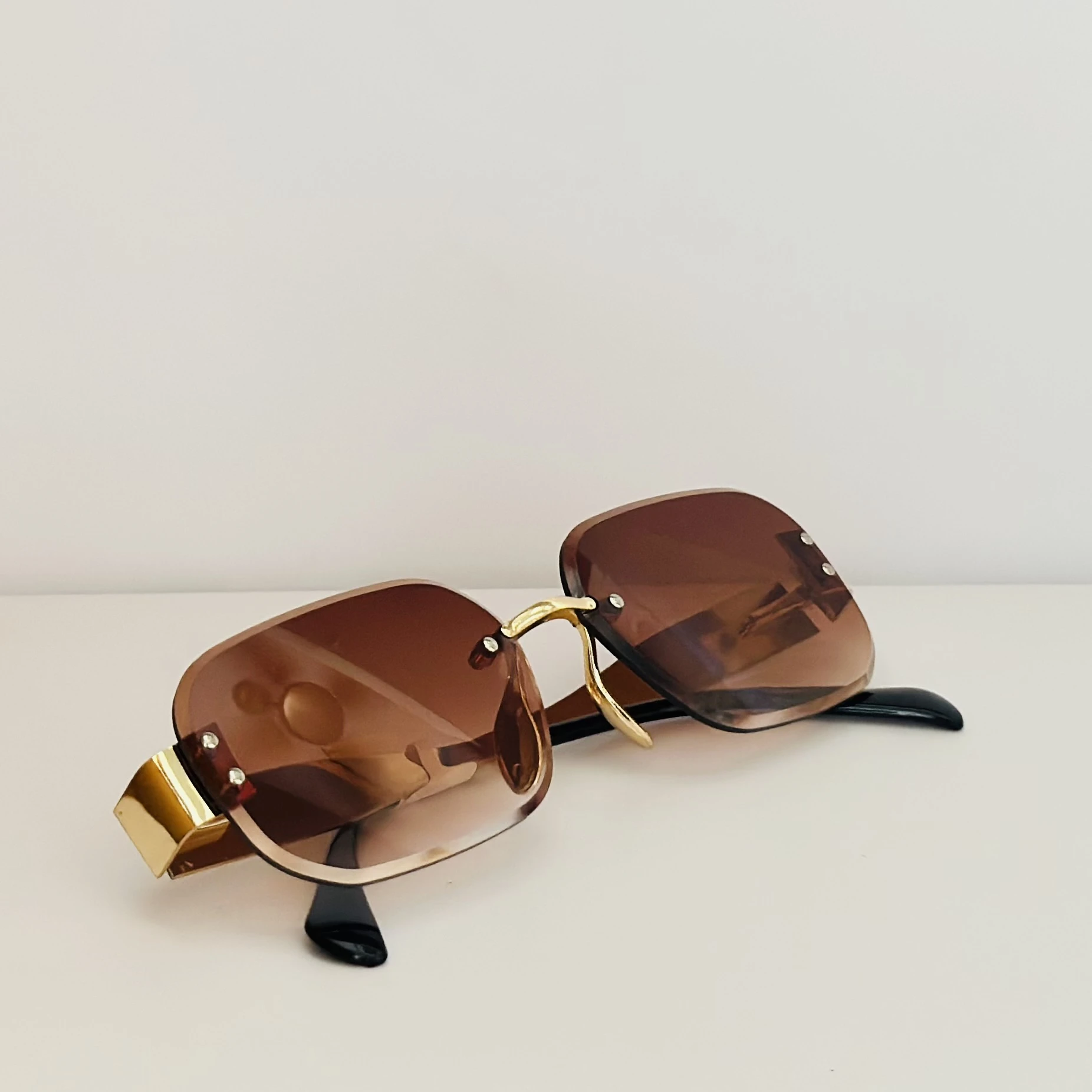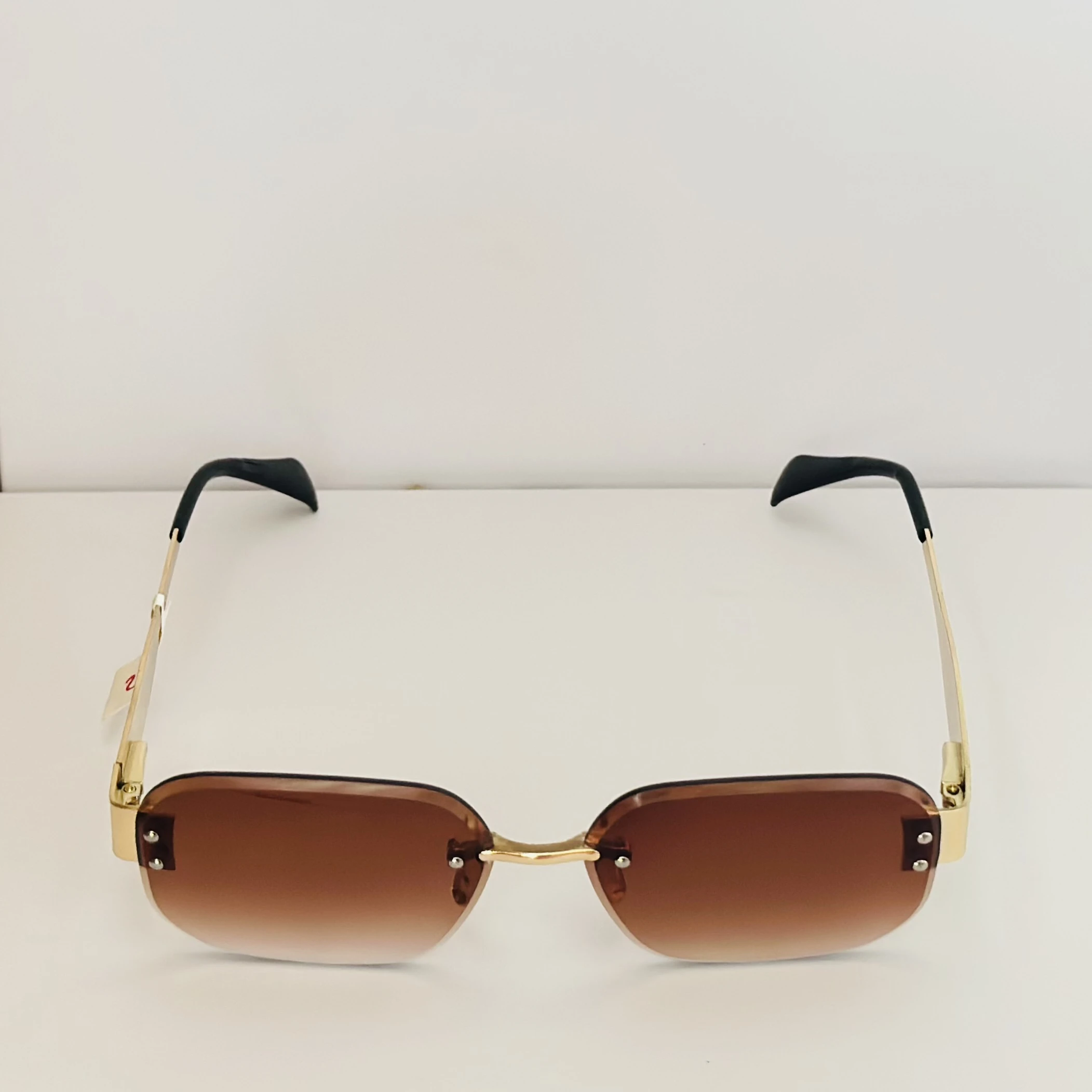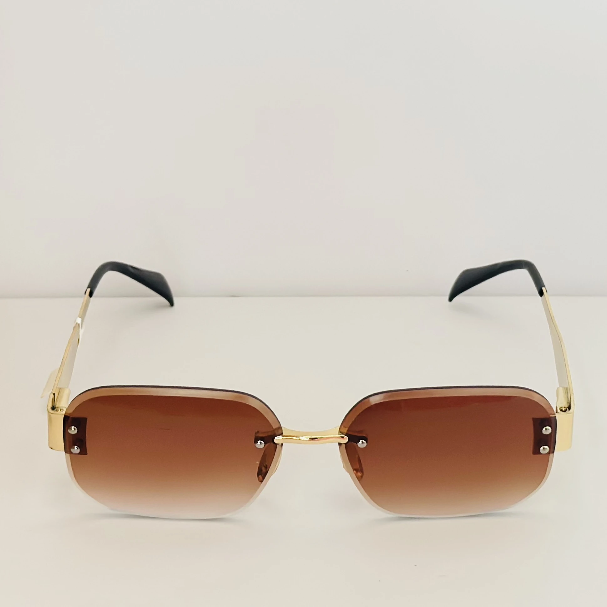 👉 Theme :- Cartier Santos de Cartier CT0460S rimless rectangular sunglasses with gold-finish metal frames and gray lenses.