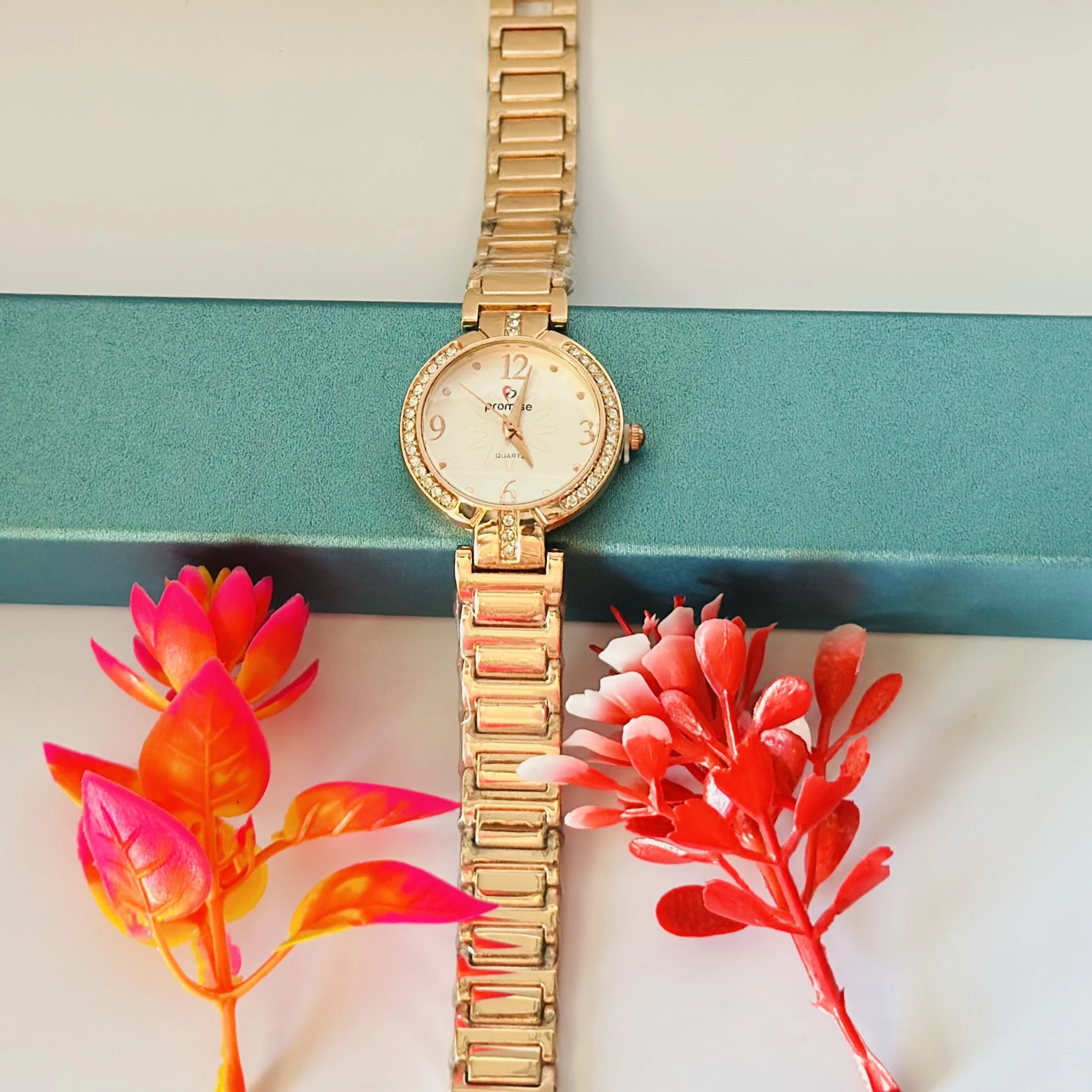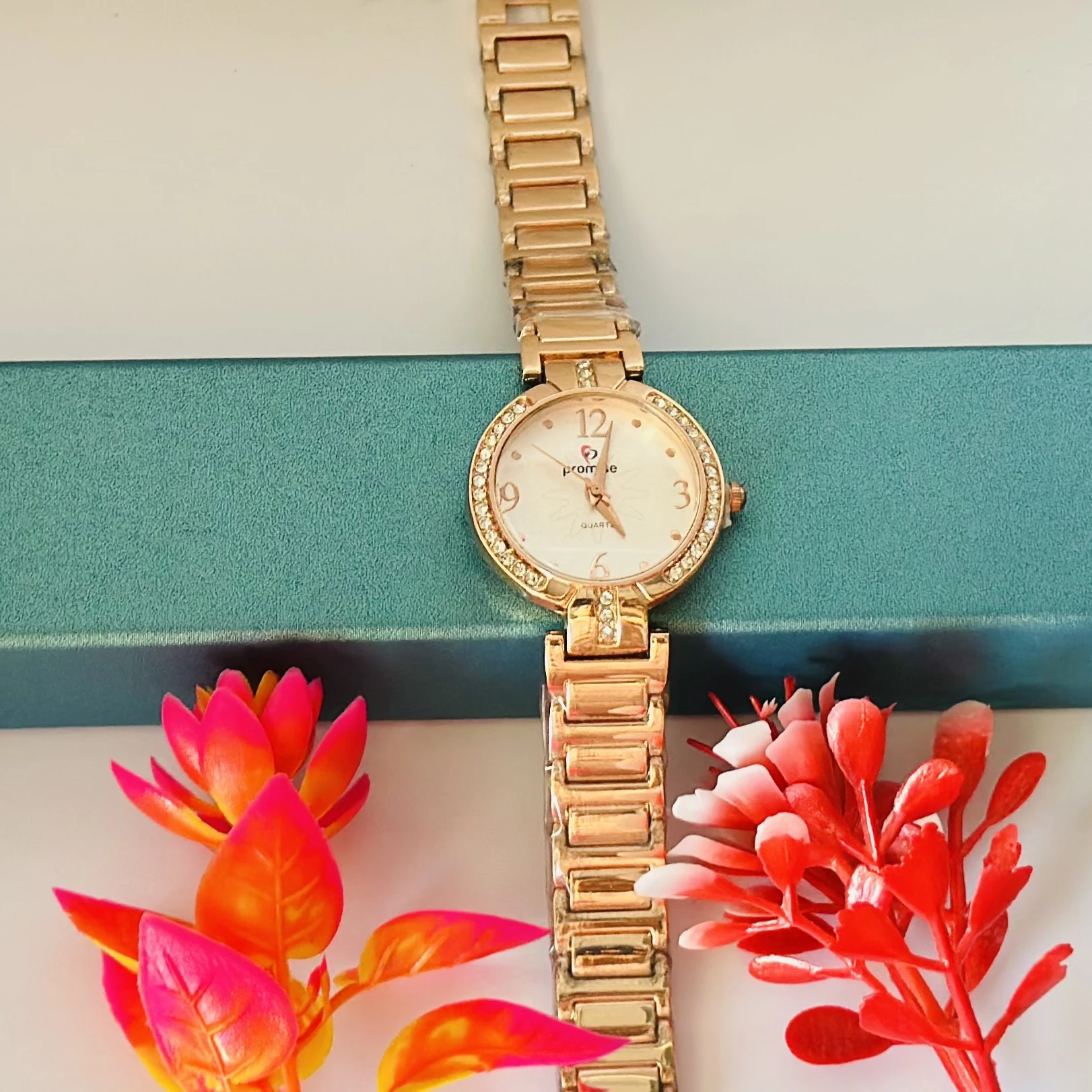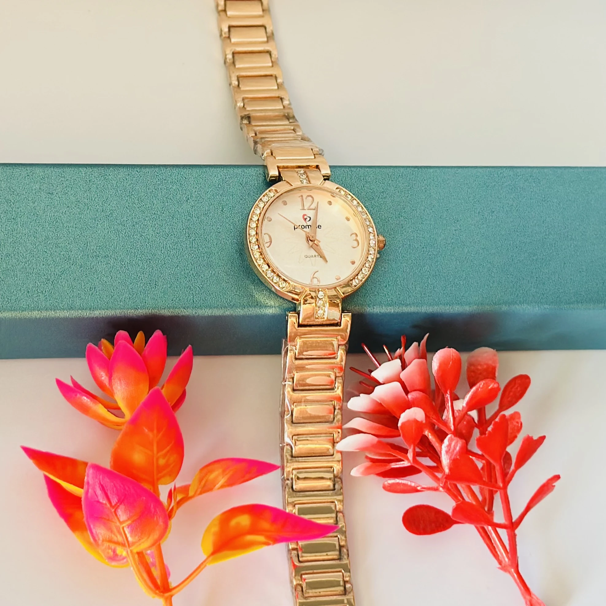 👉 Theme :- Rose gold-plated women's quartz watch with a square dial and a crystal-embellished link bracelet.