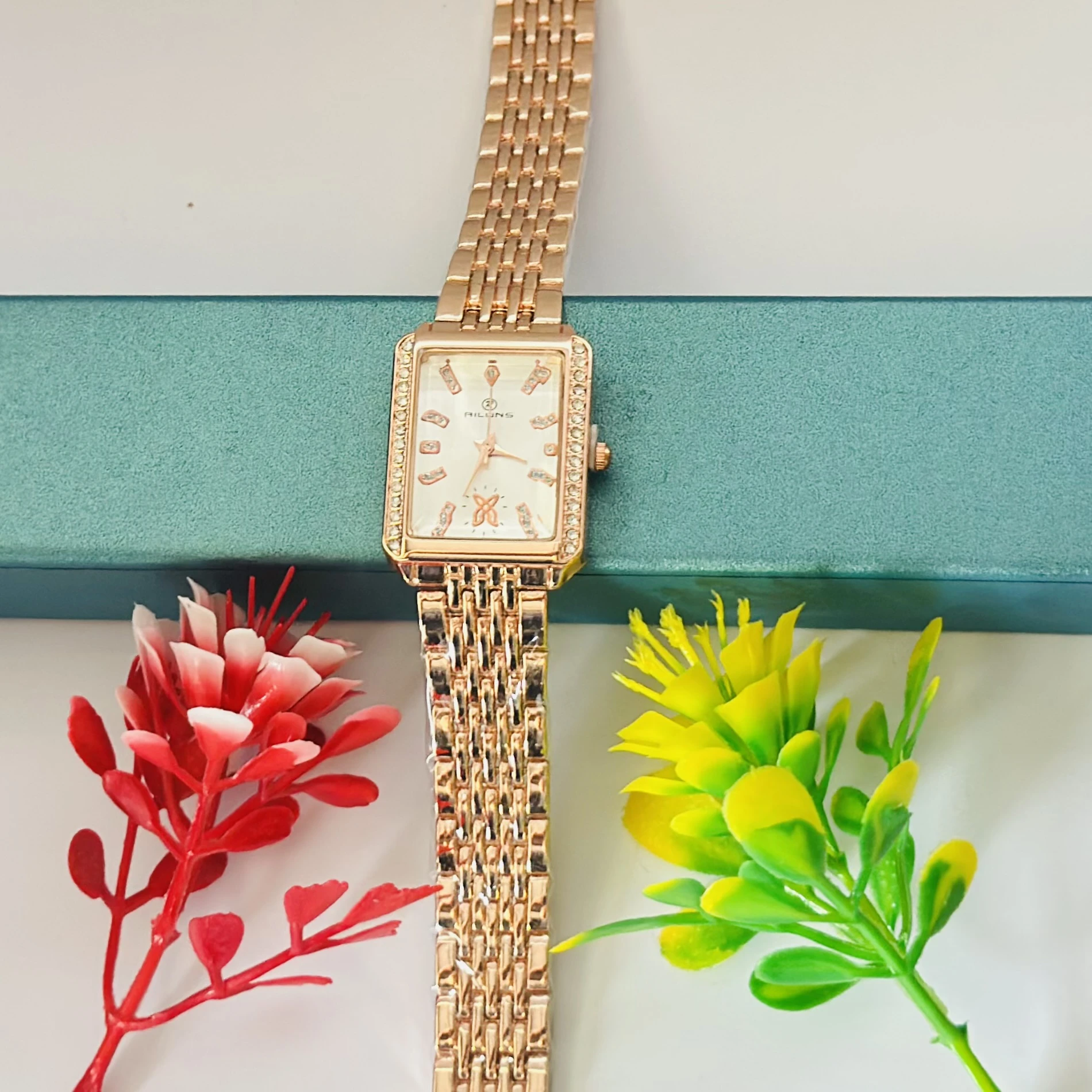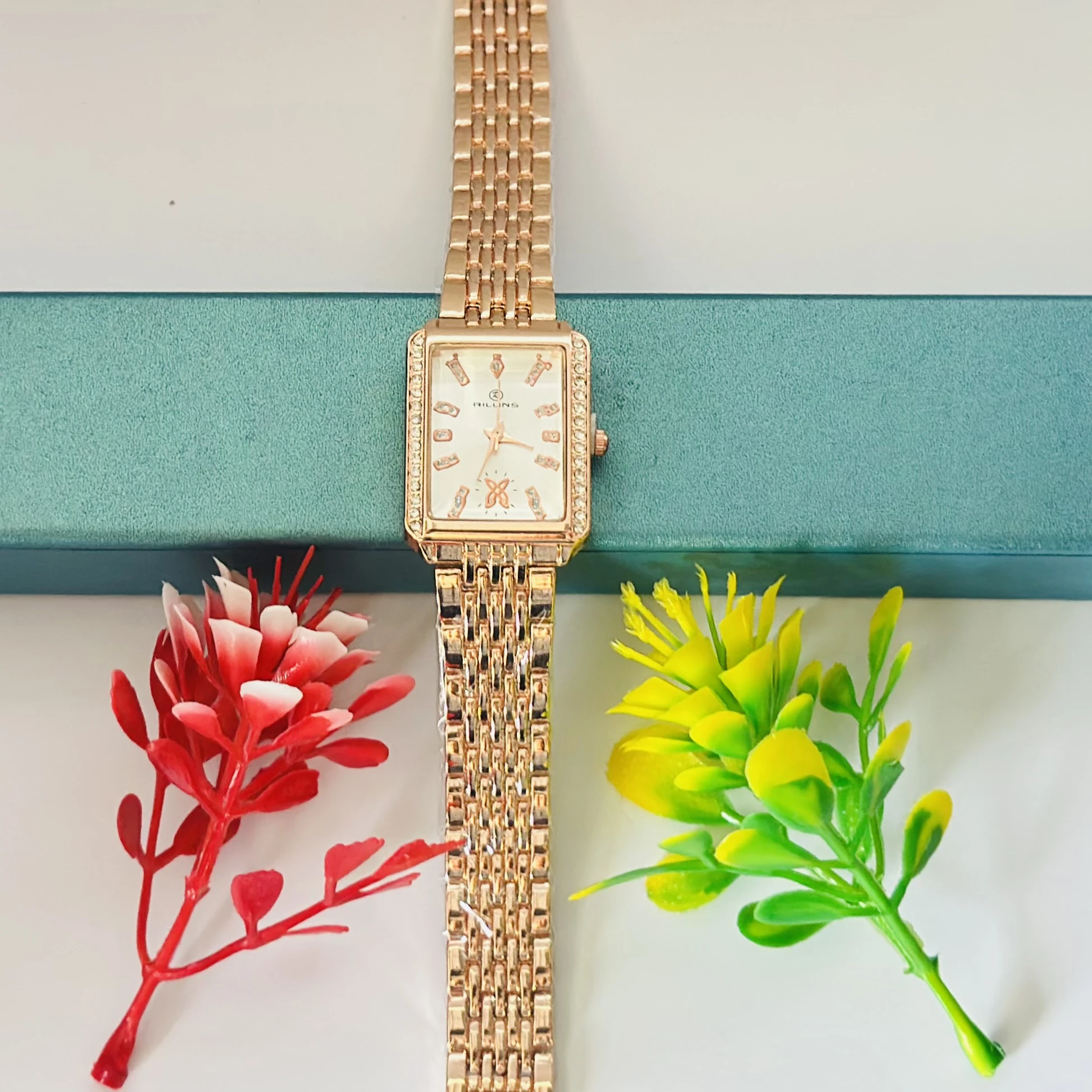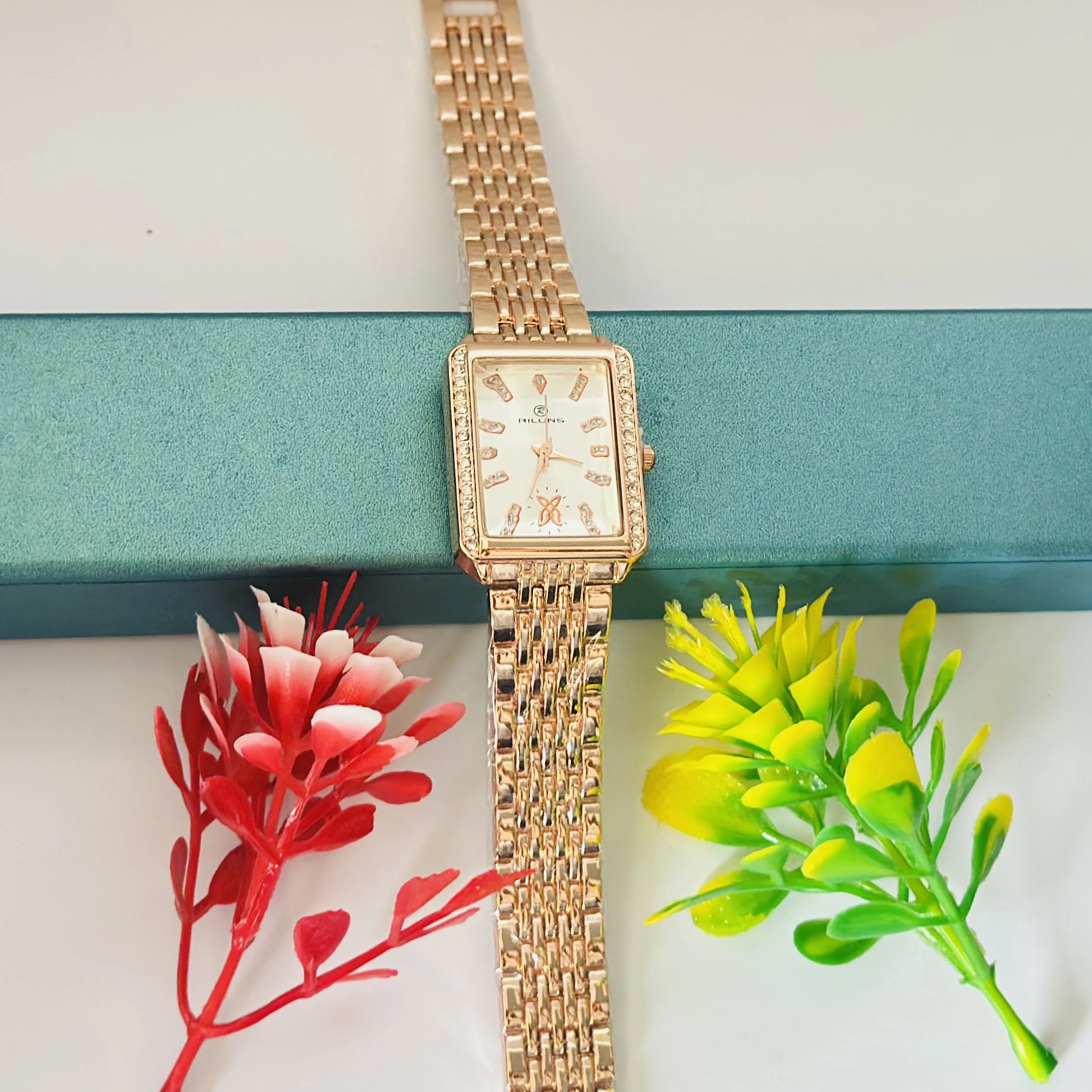 👉 Theme :- watch with a stainless steel rose gold case and crystal embellishment