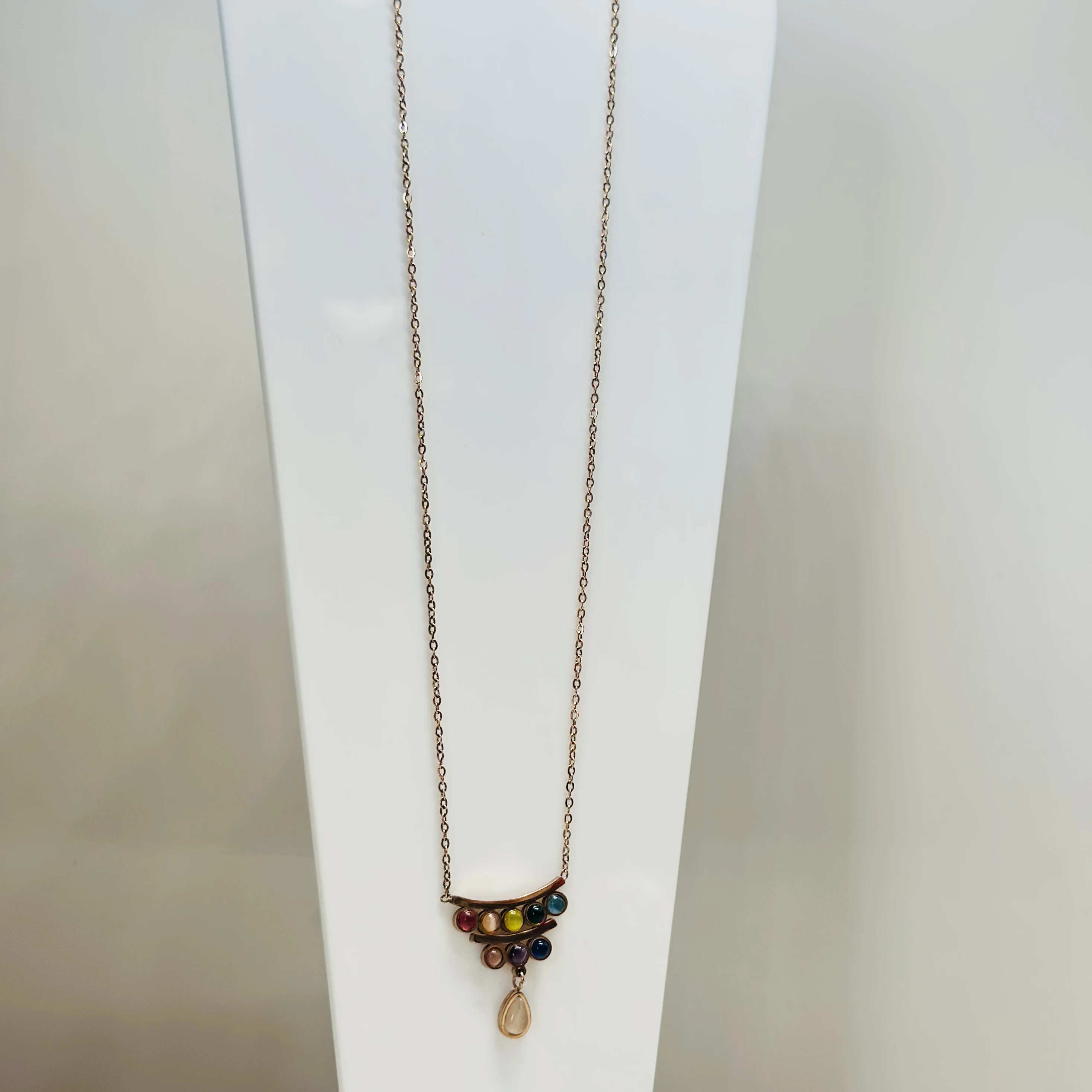 👉Theme :- Rose gold-toned fashion necklace featuring a curved bar pendant with multi-colored cabochon stones and a teardrop-shaped drop pendant.