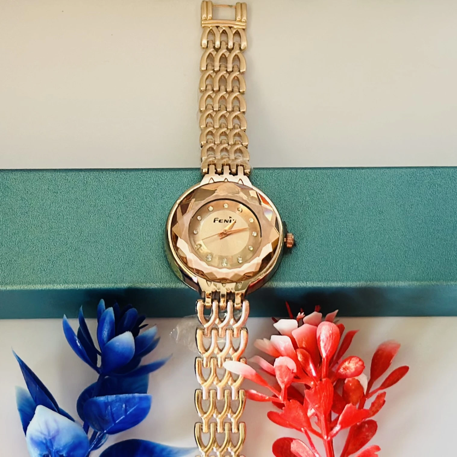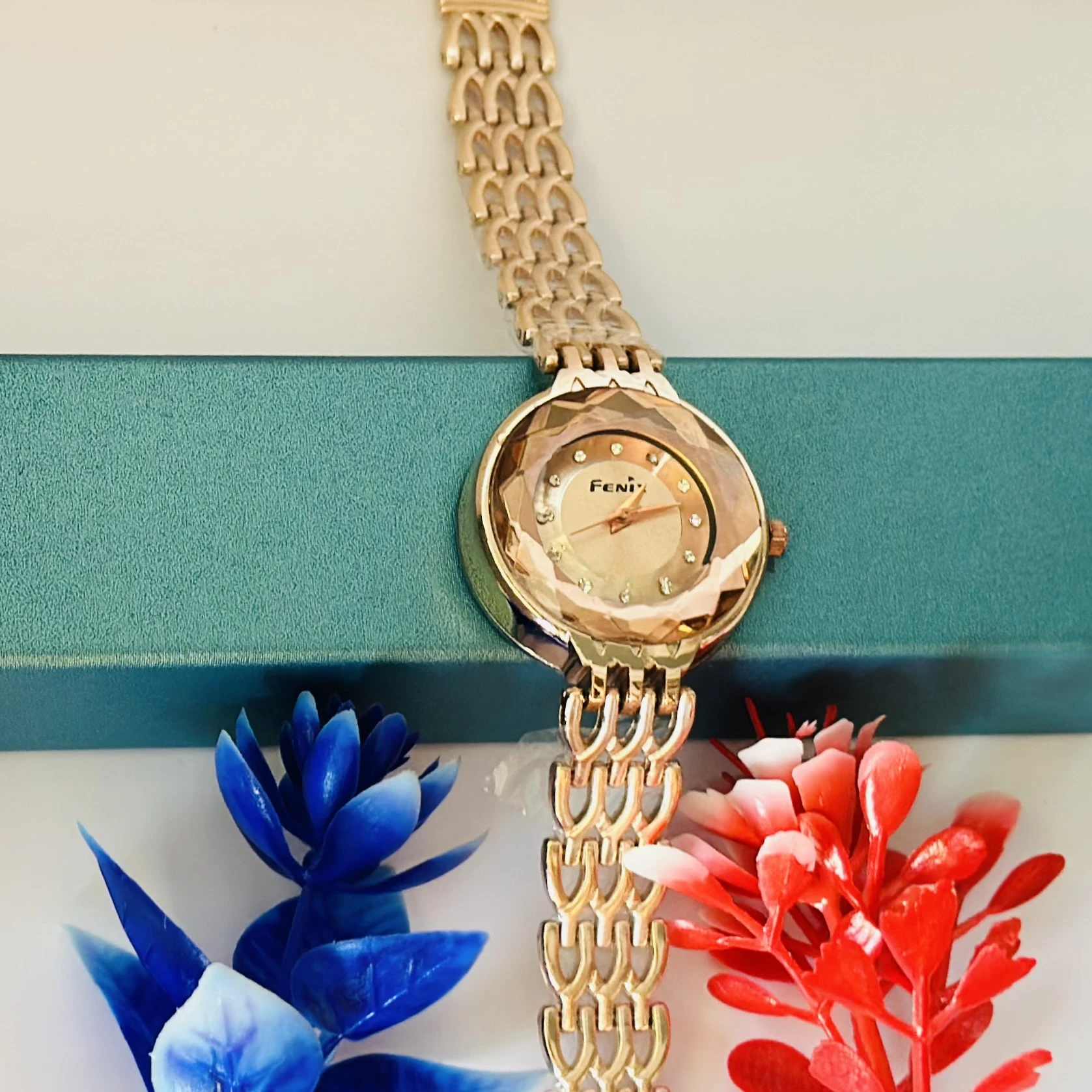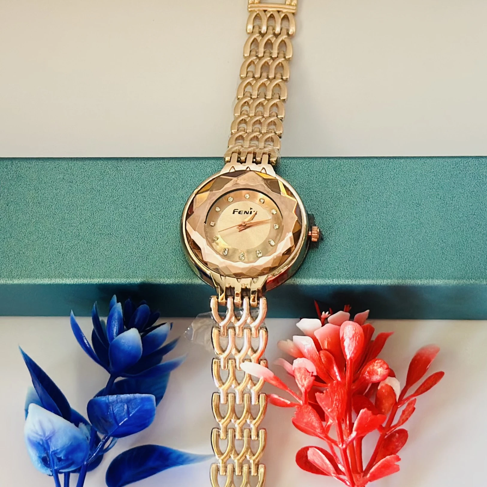 👉 Theme :- rose gold-tone women's analog watch with a faceted crystal and a bracelet-style metal