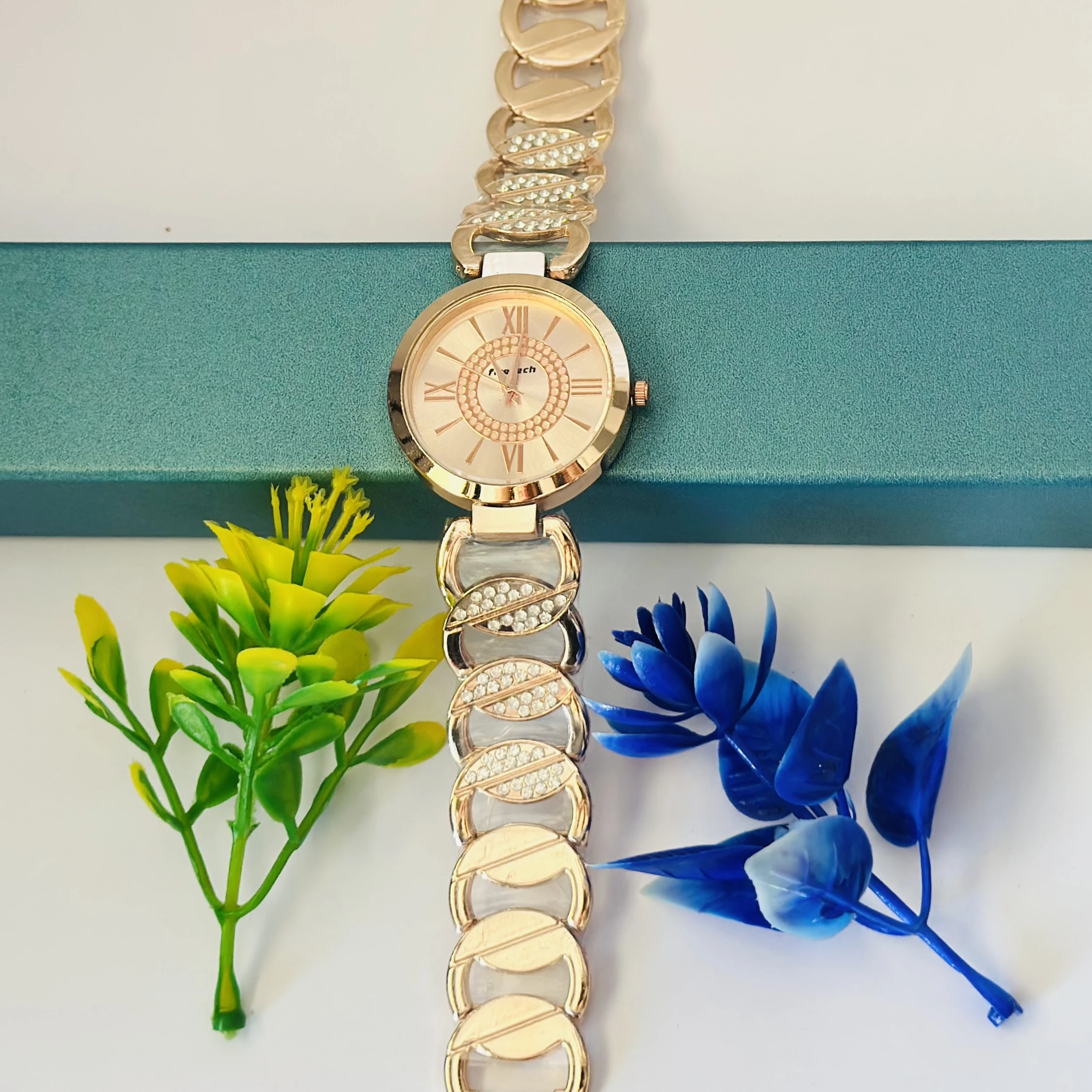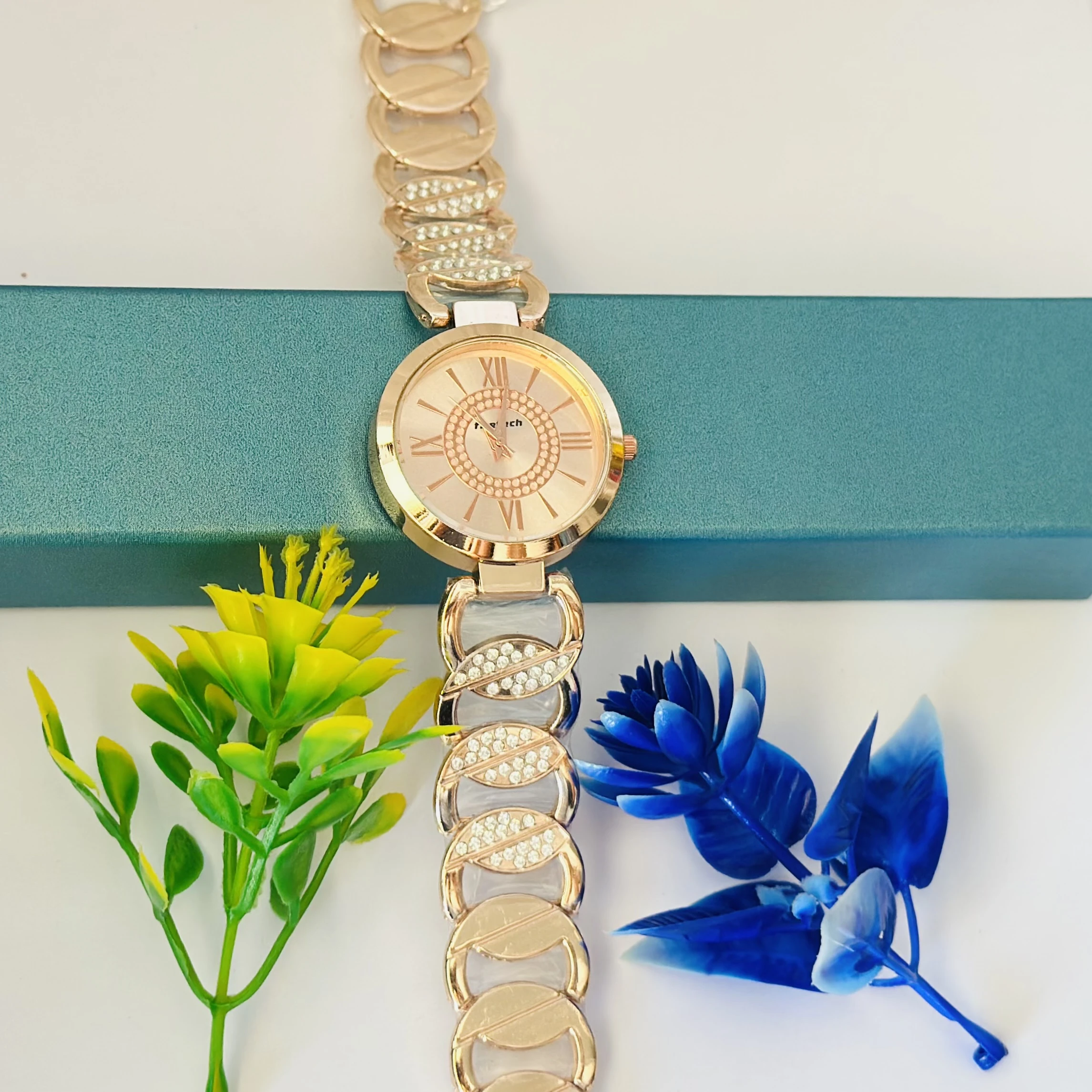 👉 Theme :- Rose gold-toned crystal link round face watch.