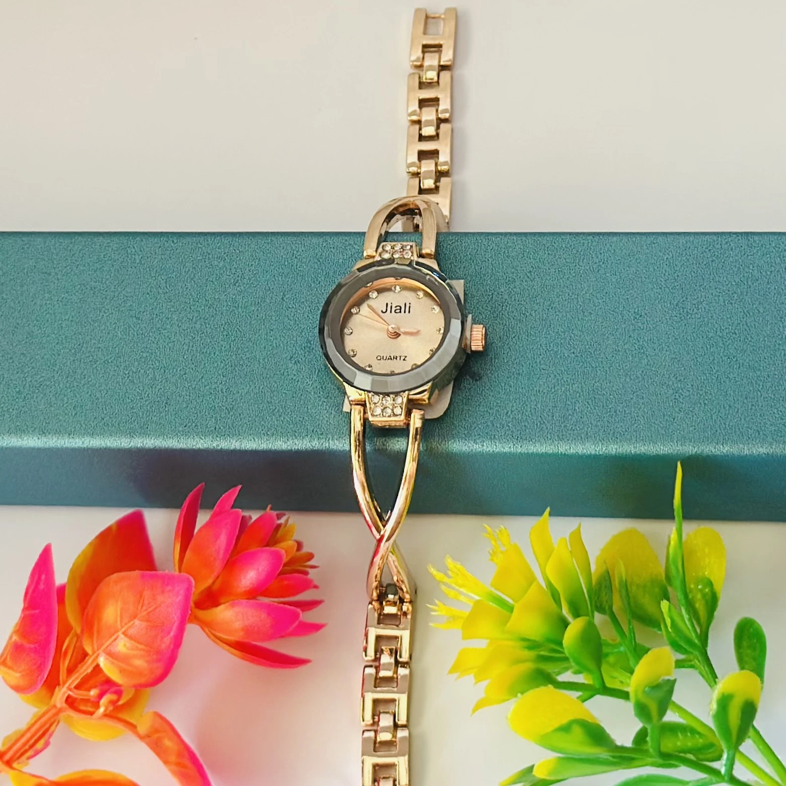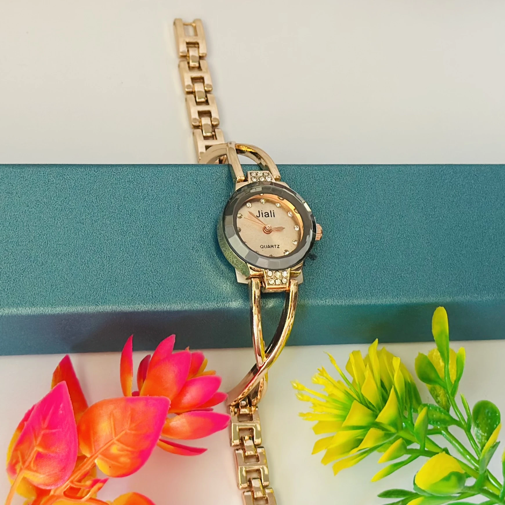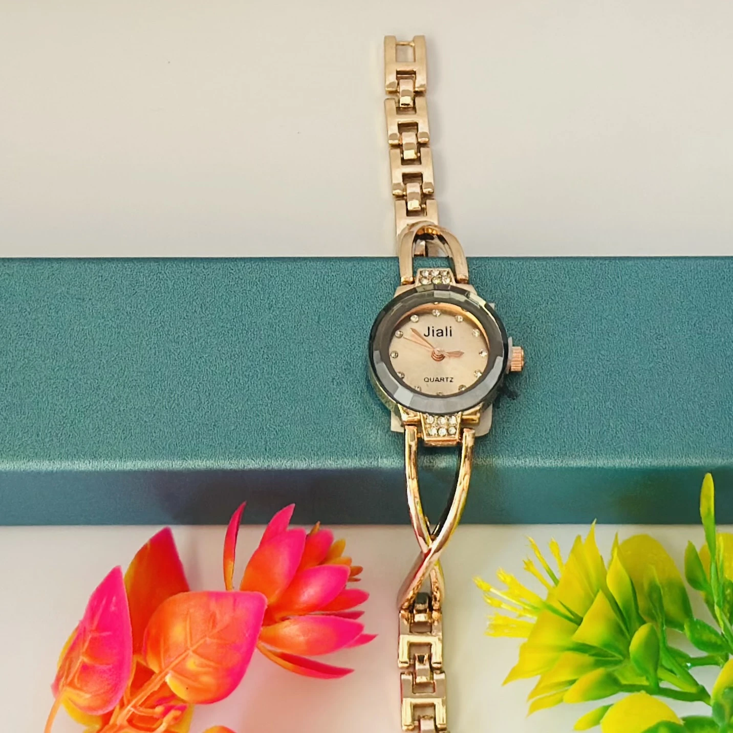 👉 Theme :- Rose gold-toned women's bracelet watch with a crystal-accented dial.