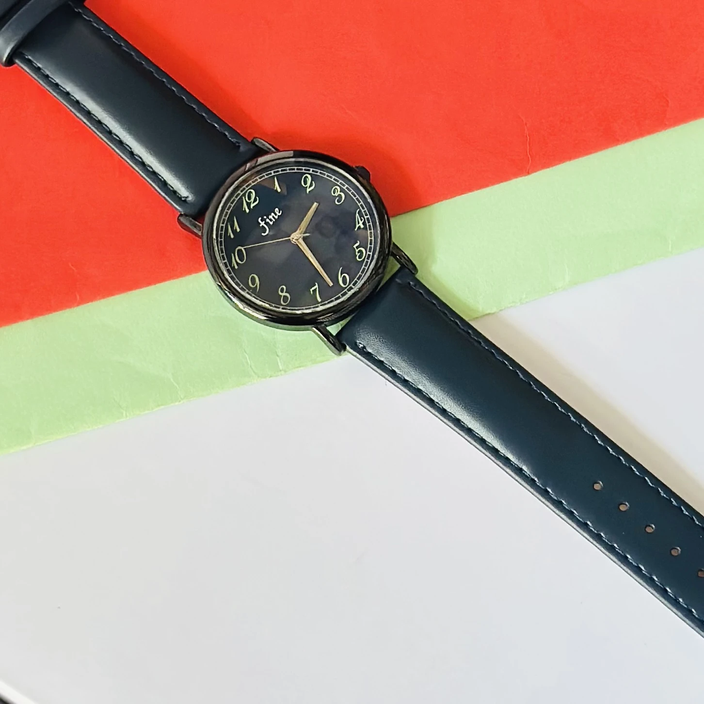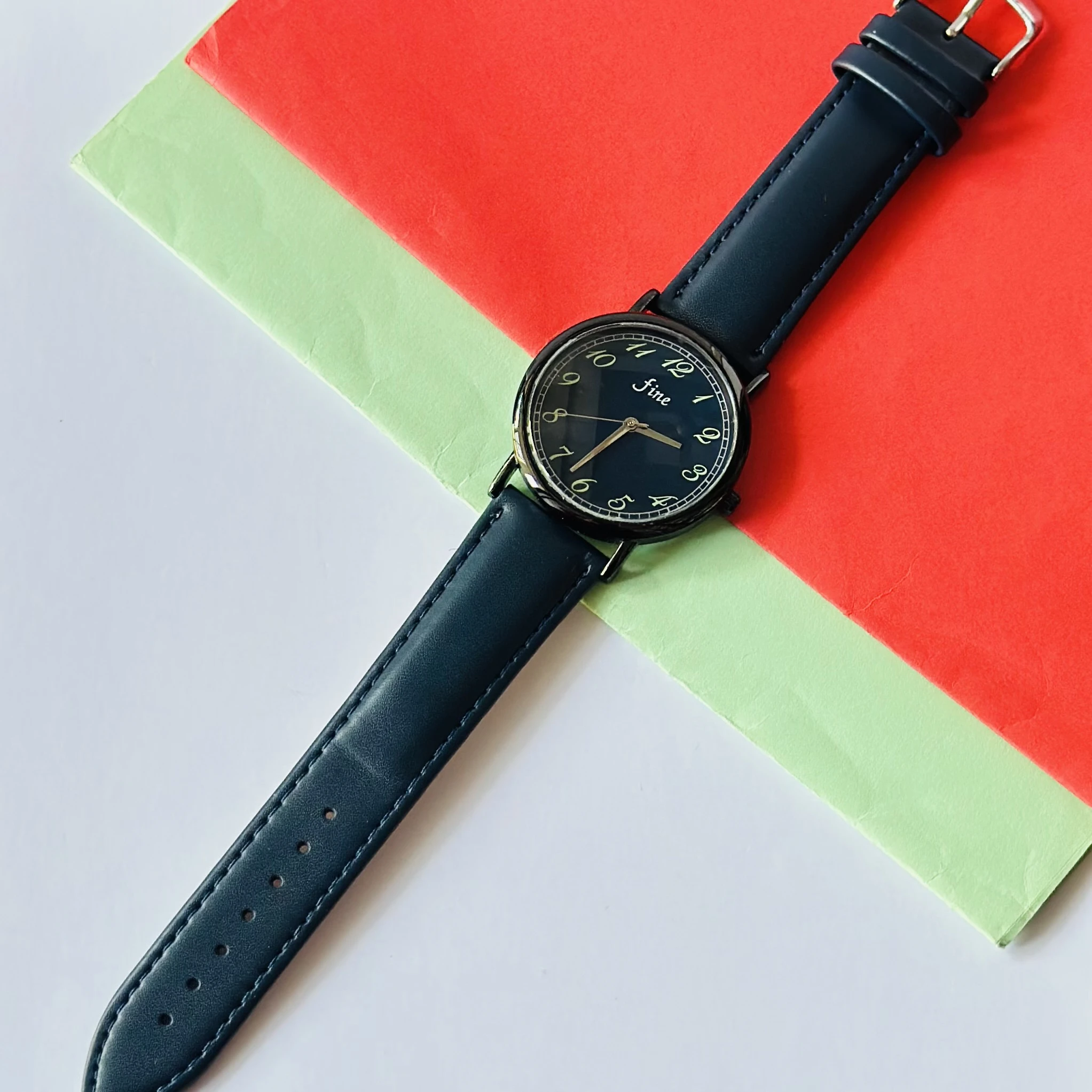 👉 Theme :- Round analog watch with a dark blue dial and a faux leather strap.