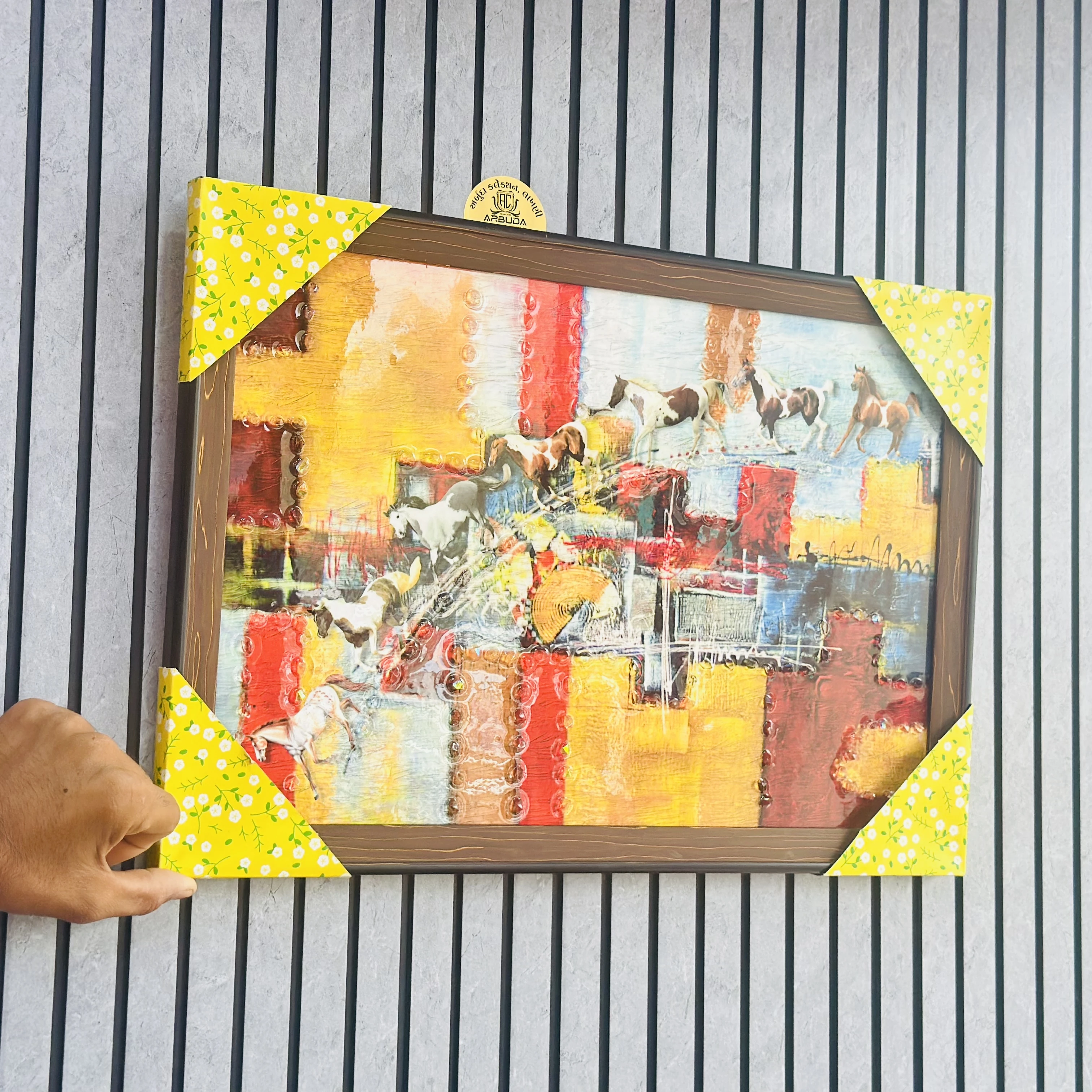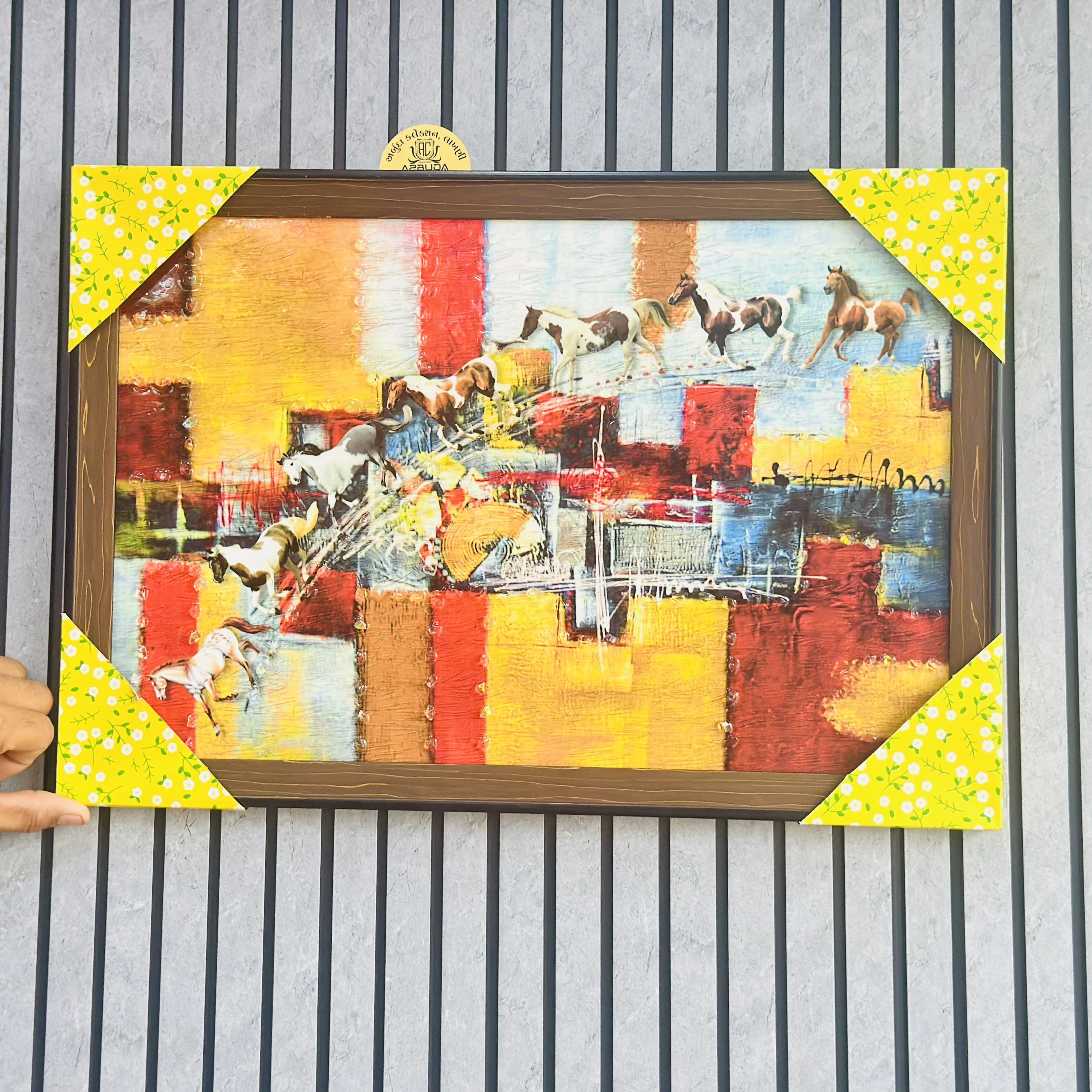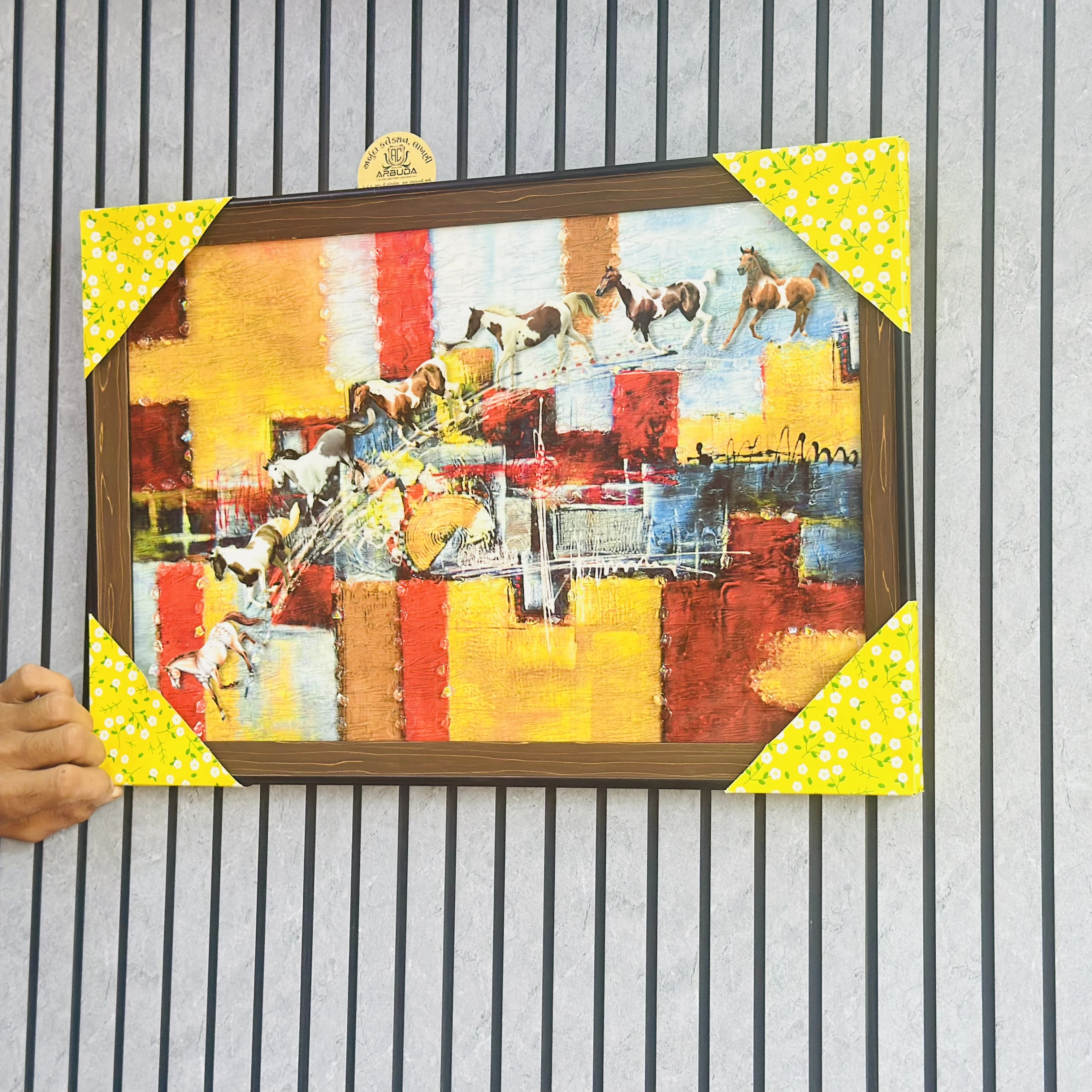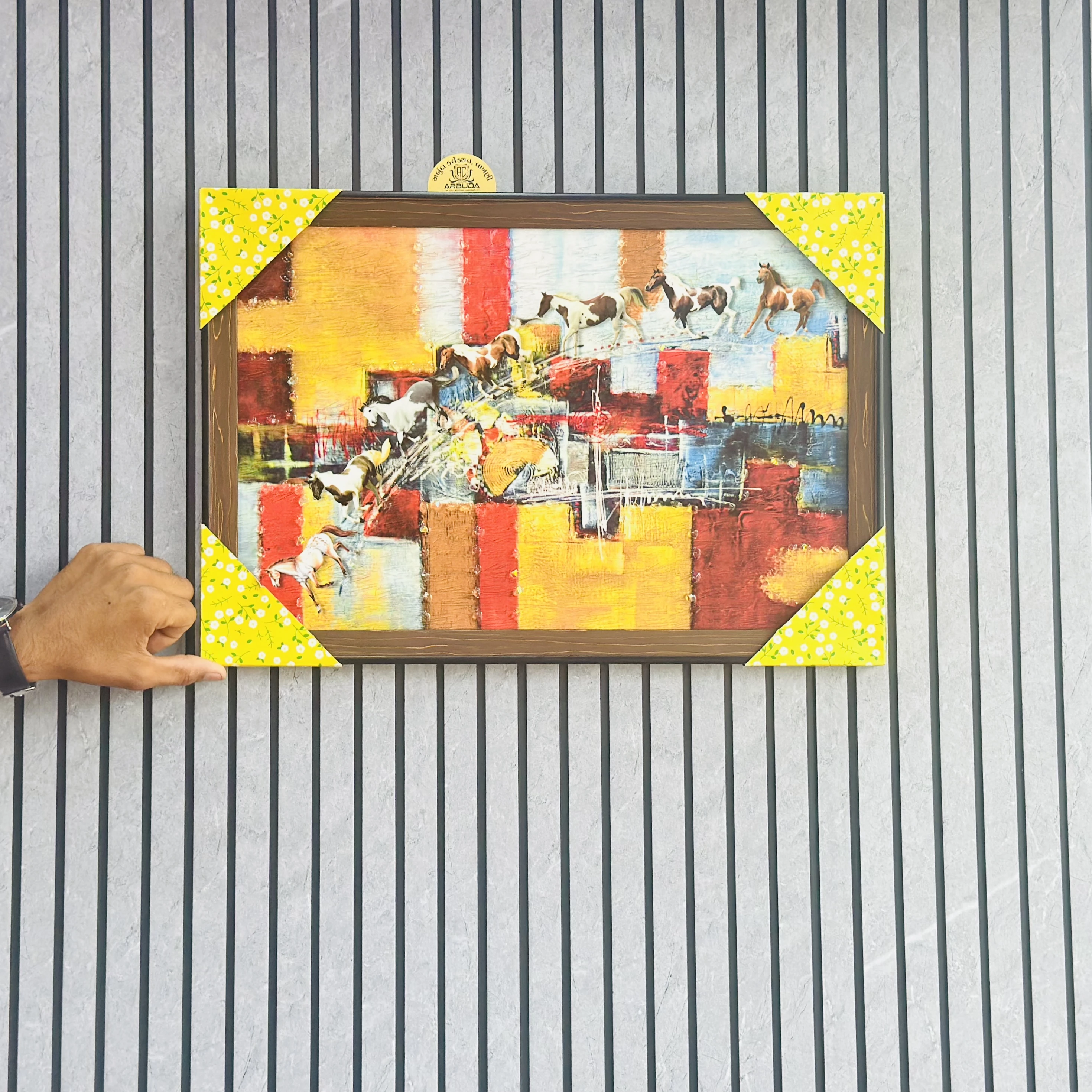 👉 Theme :- This is an abstract painting depicting seven running horses. The painting has a vibrant, multi-colored background with a textured appearance. The horses are shown in motion, creating a sense of energy and dynamism.