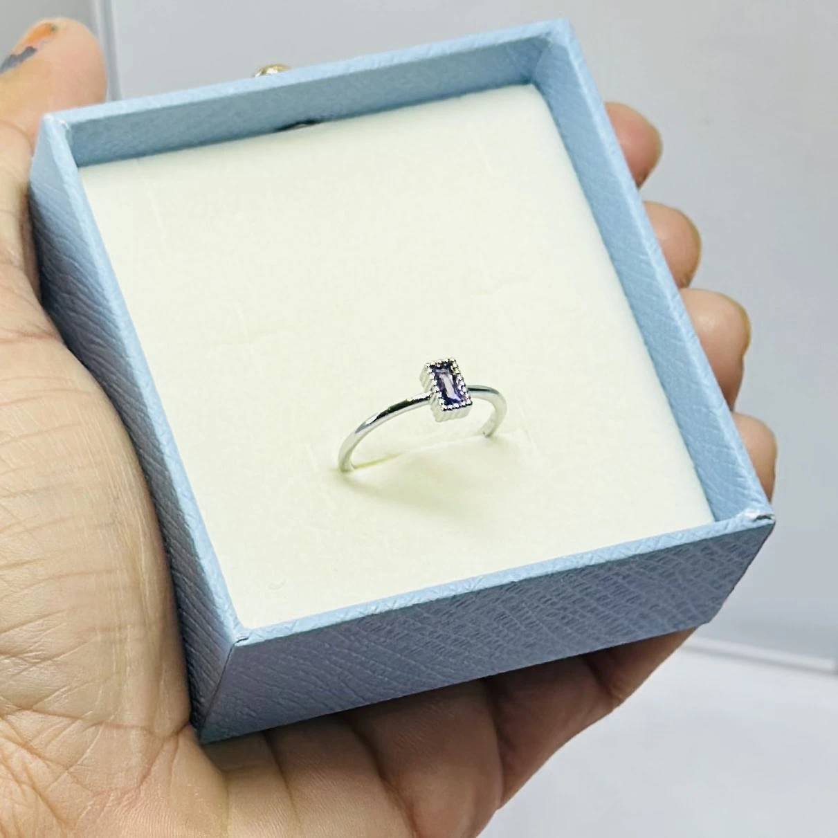 👉 Theme :- silver-toned adjustable ring featuring a triangle-shaped crystal, presented in a blue rose gift box.