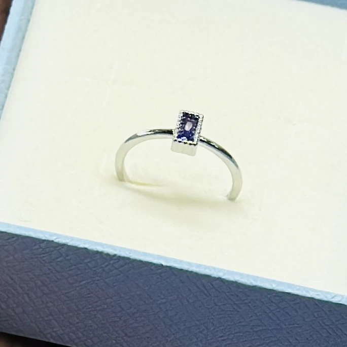 silver tanzanite gemstone ring featuring a triangle cut stone.