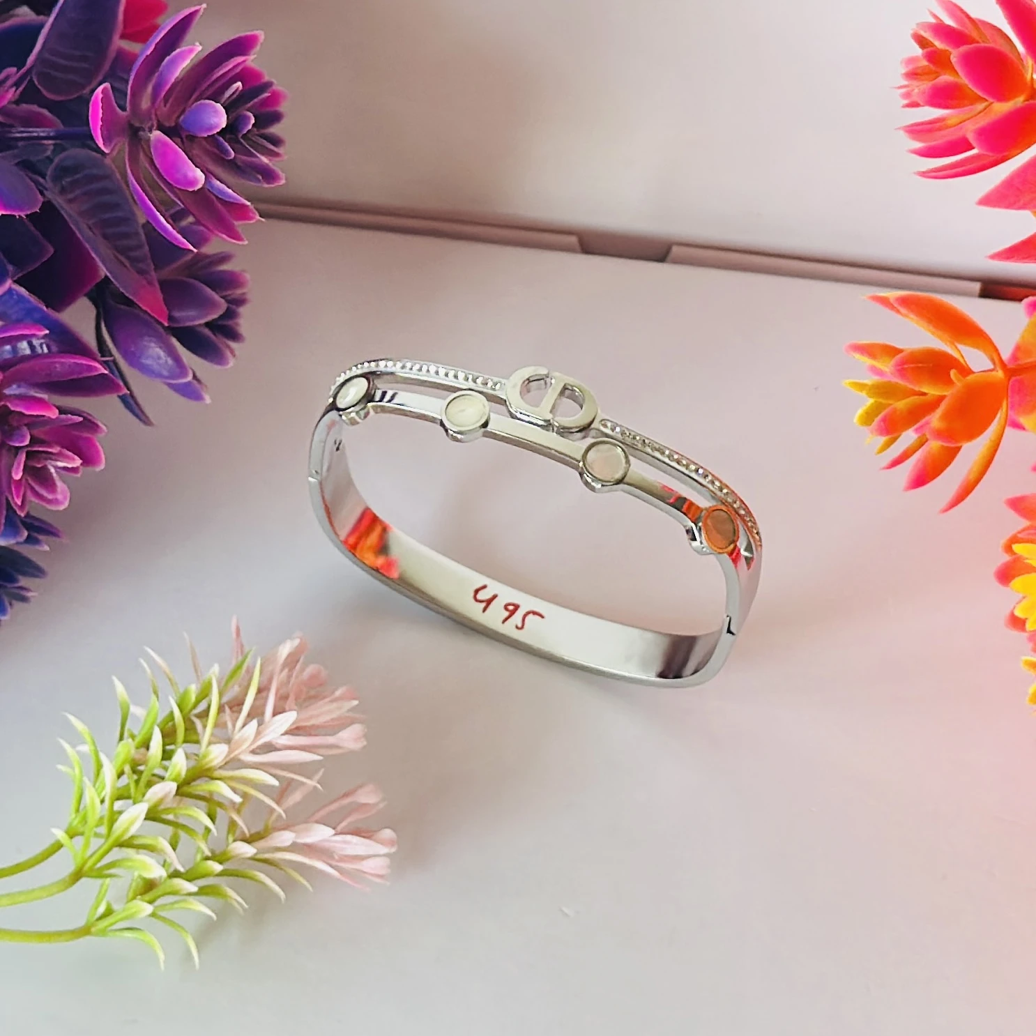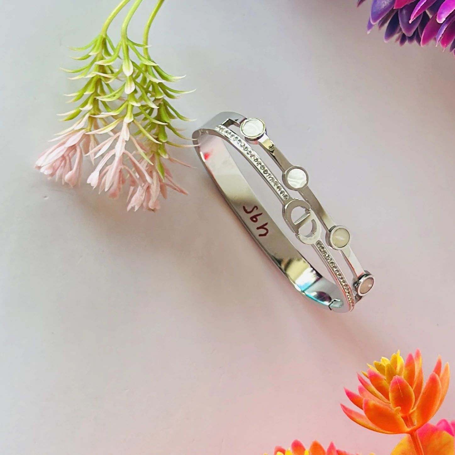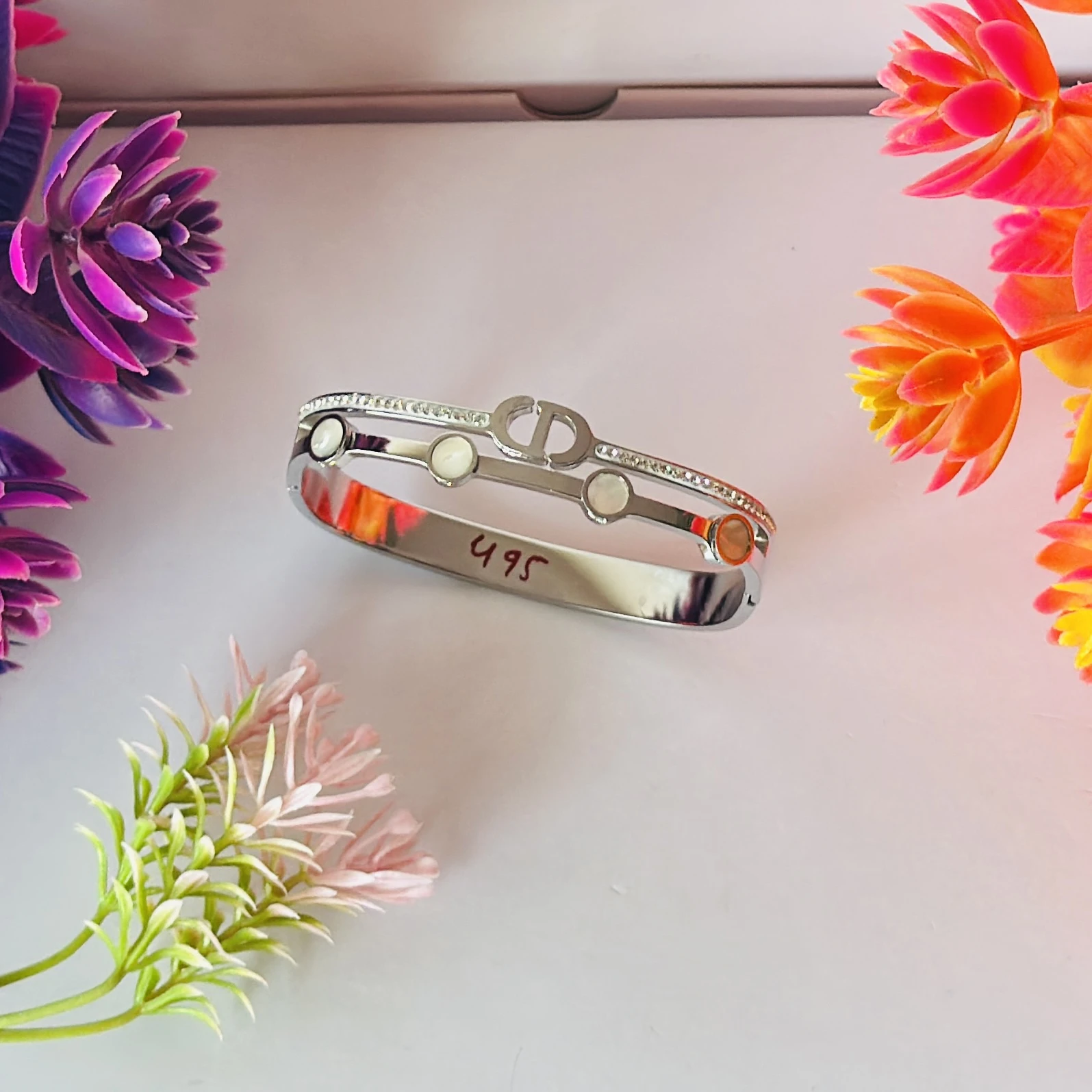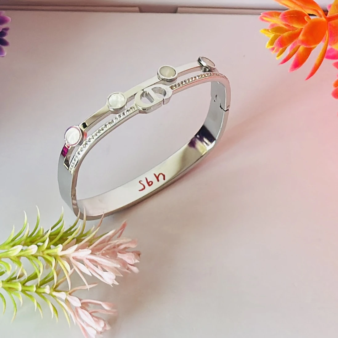 👉Theme :- silver-toned cuff bracelet with a "CD" logo design and mother-of-pearl or white stone embellishments.