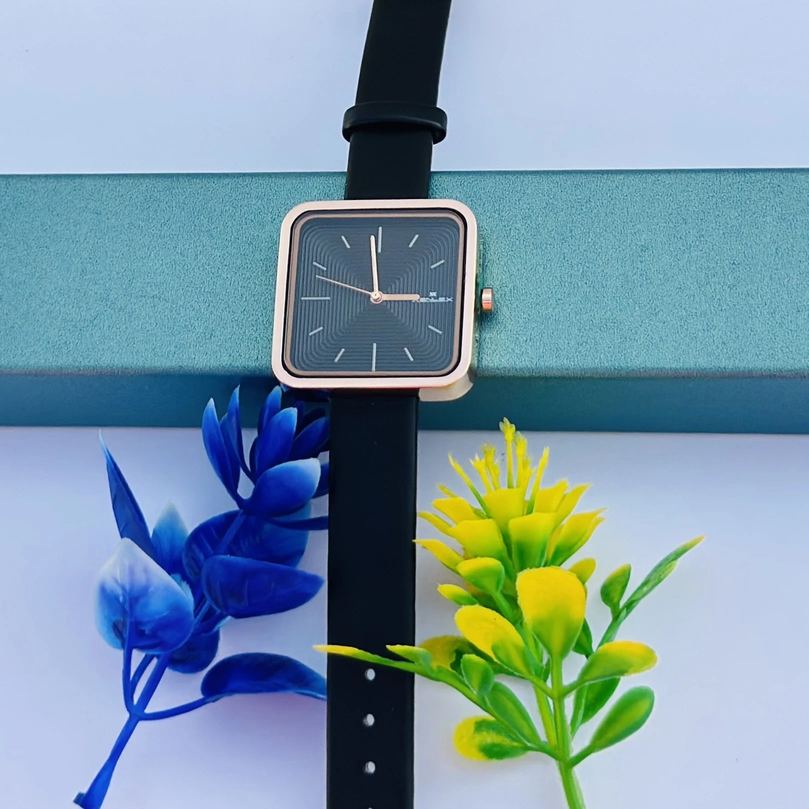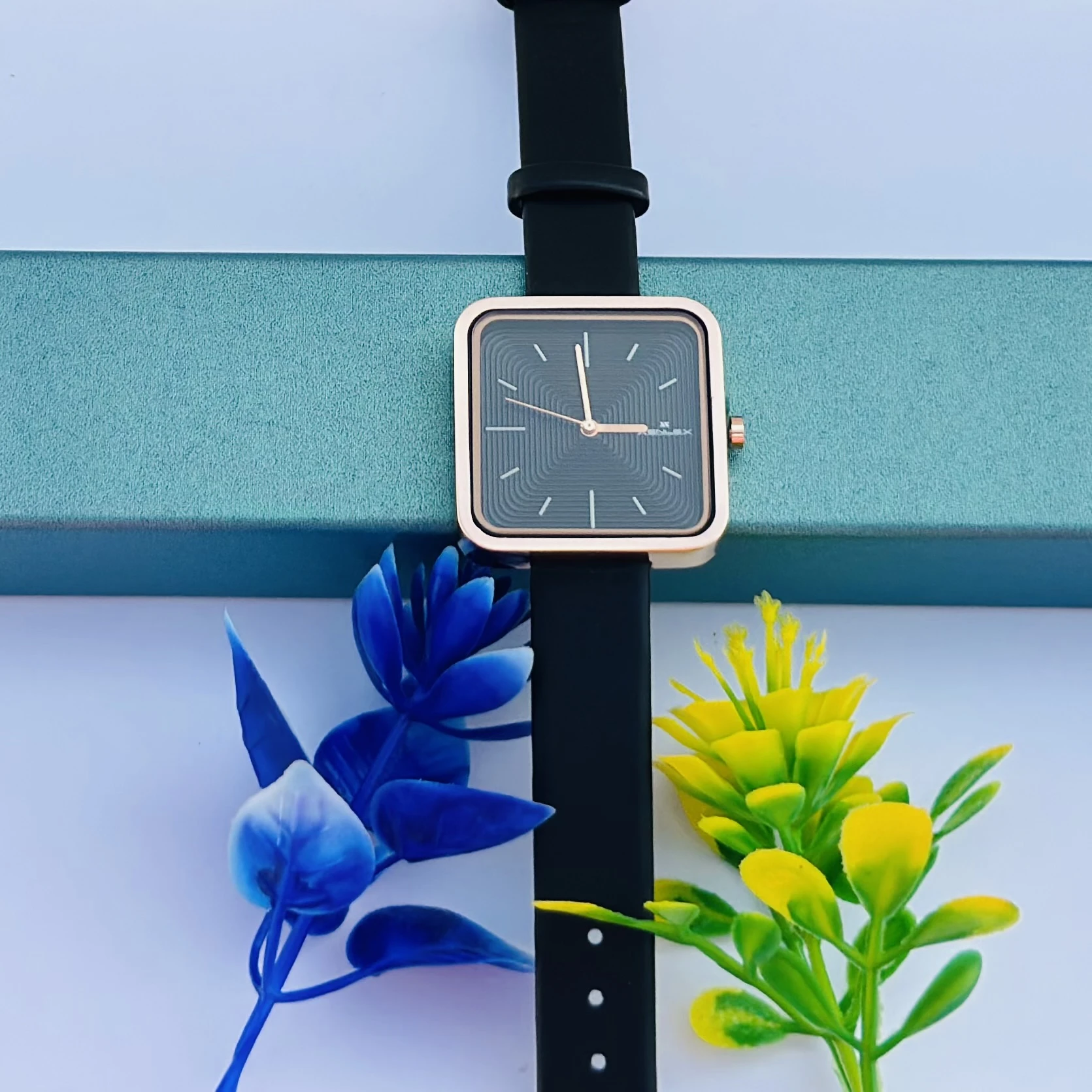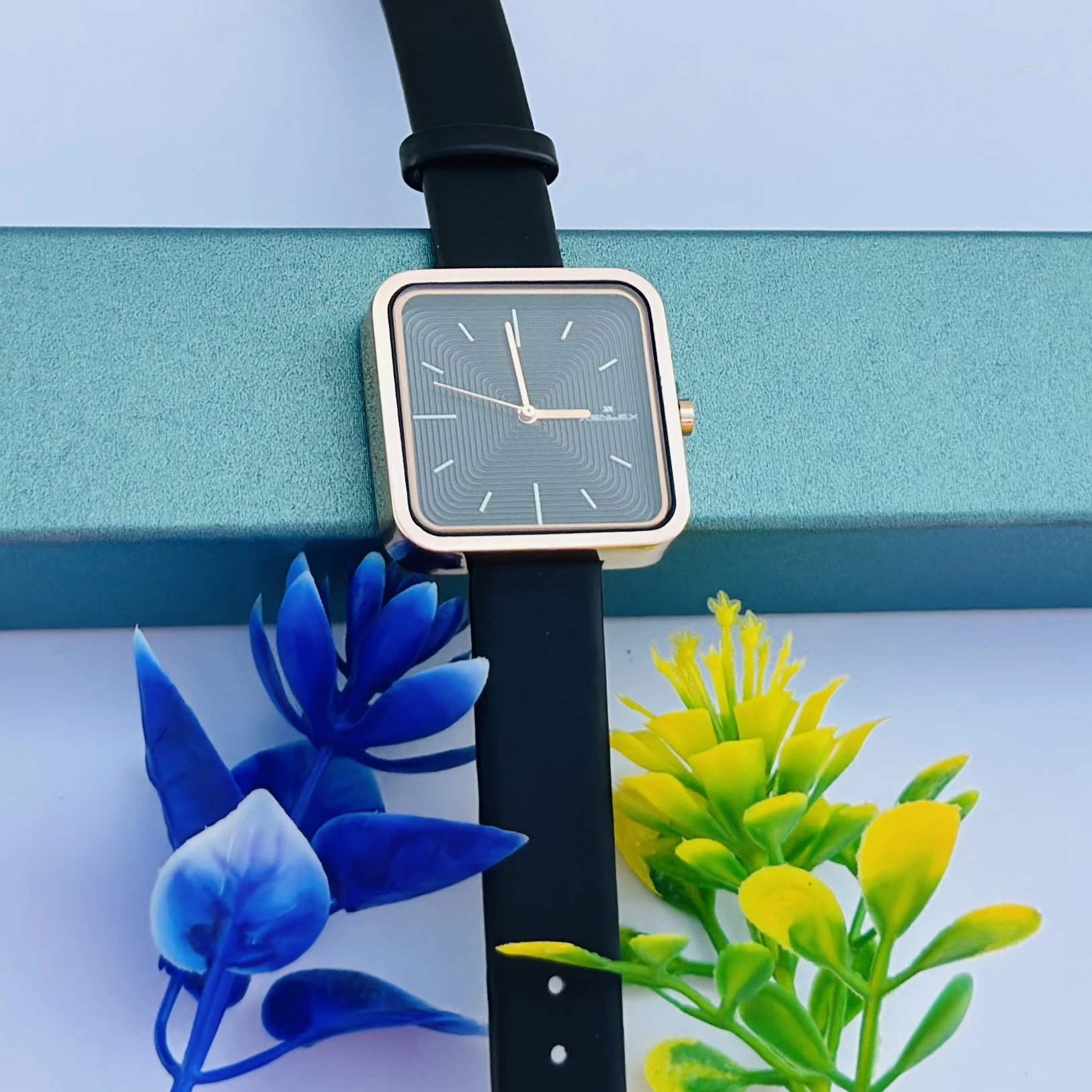 👉 Theme :- square-dial women's watch with a black strap and rose gold-tone case.