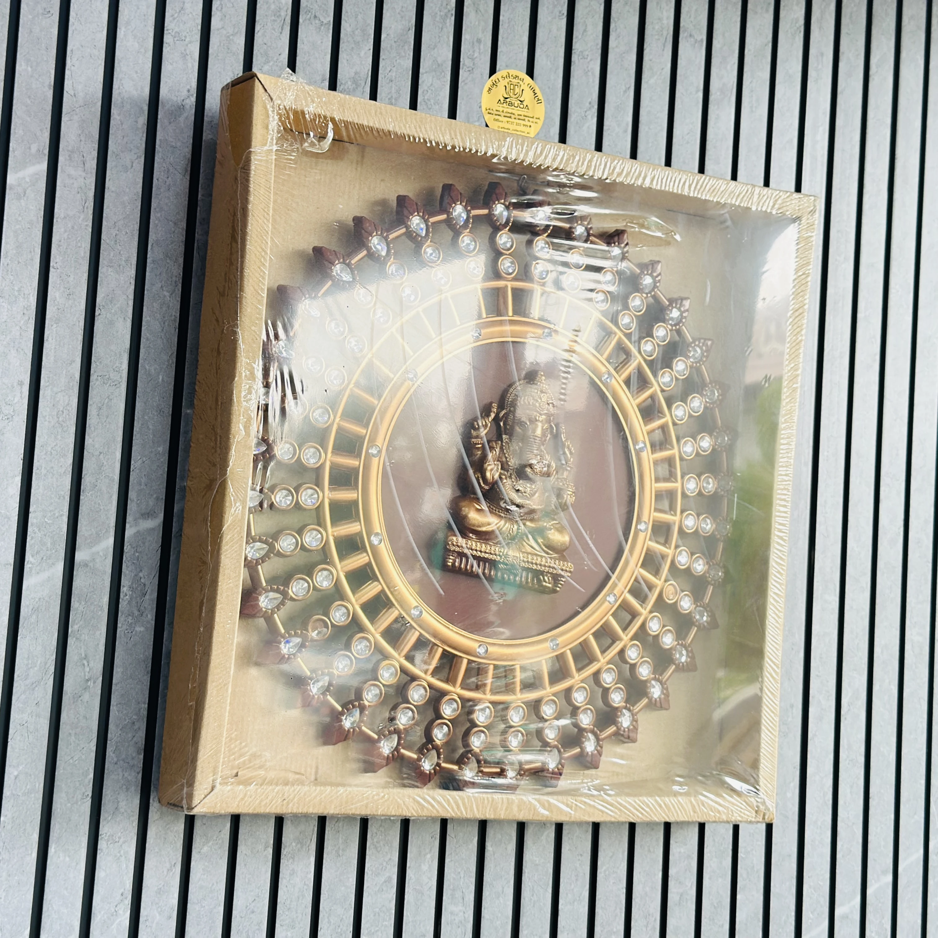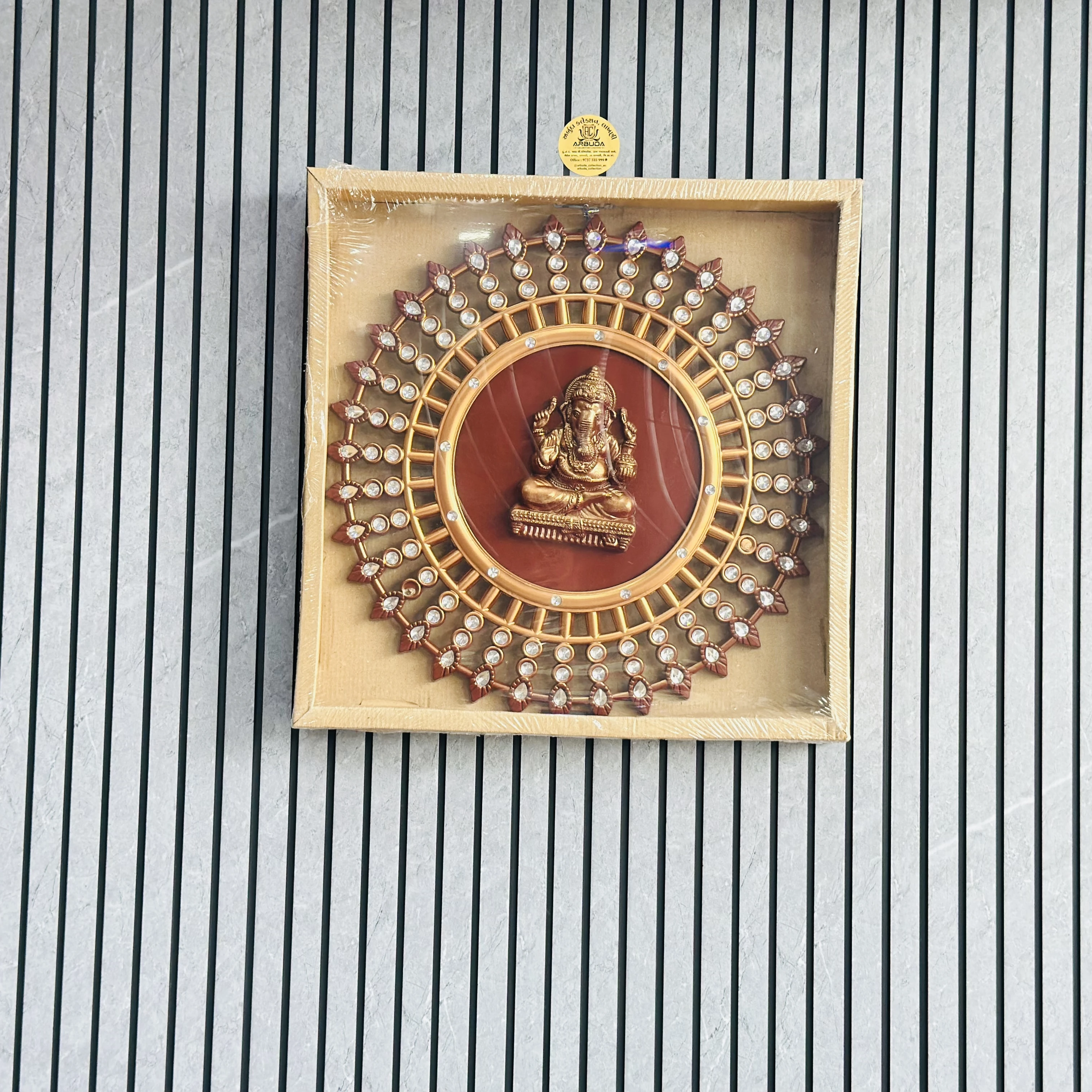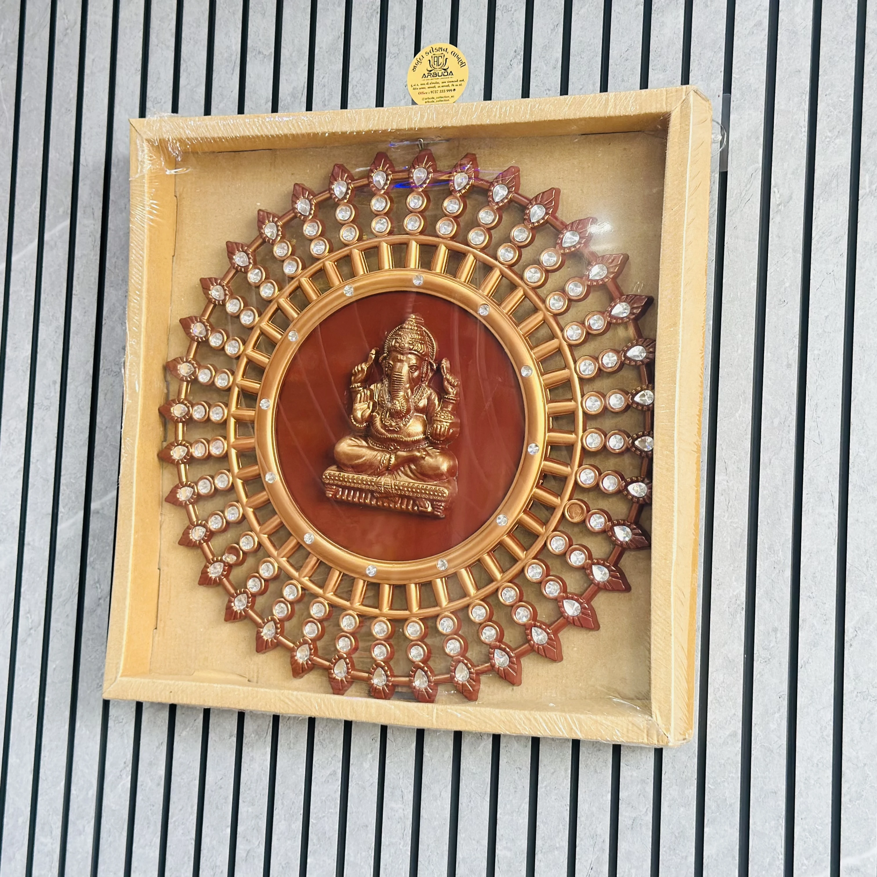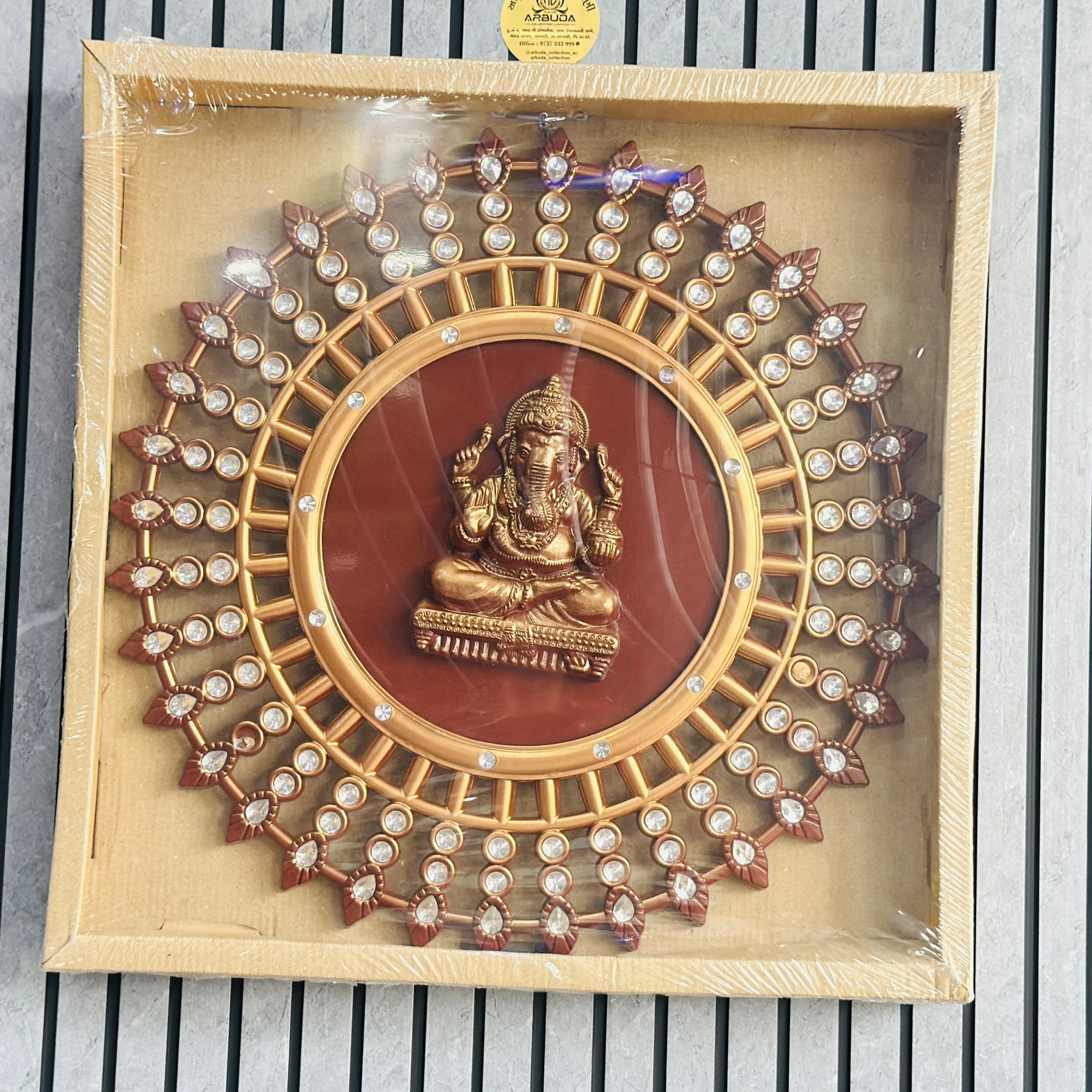 👉 Theme :- decorative wall hanging featuring a statue of Lord Ganesha in the center of a circular, ornate frame.