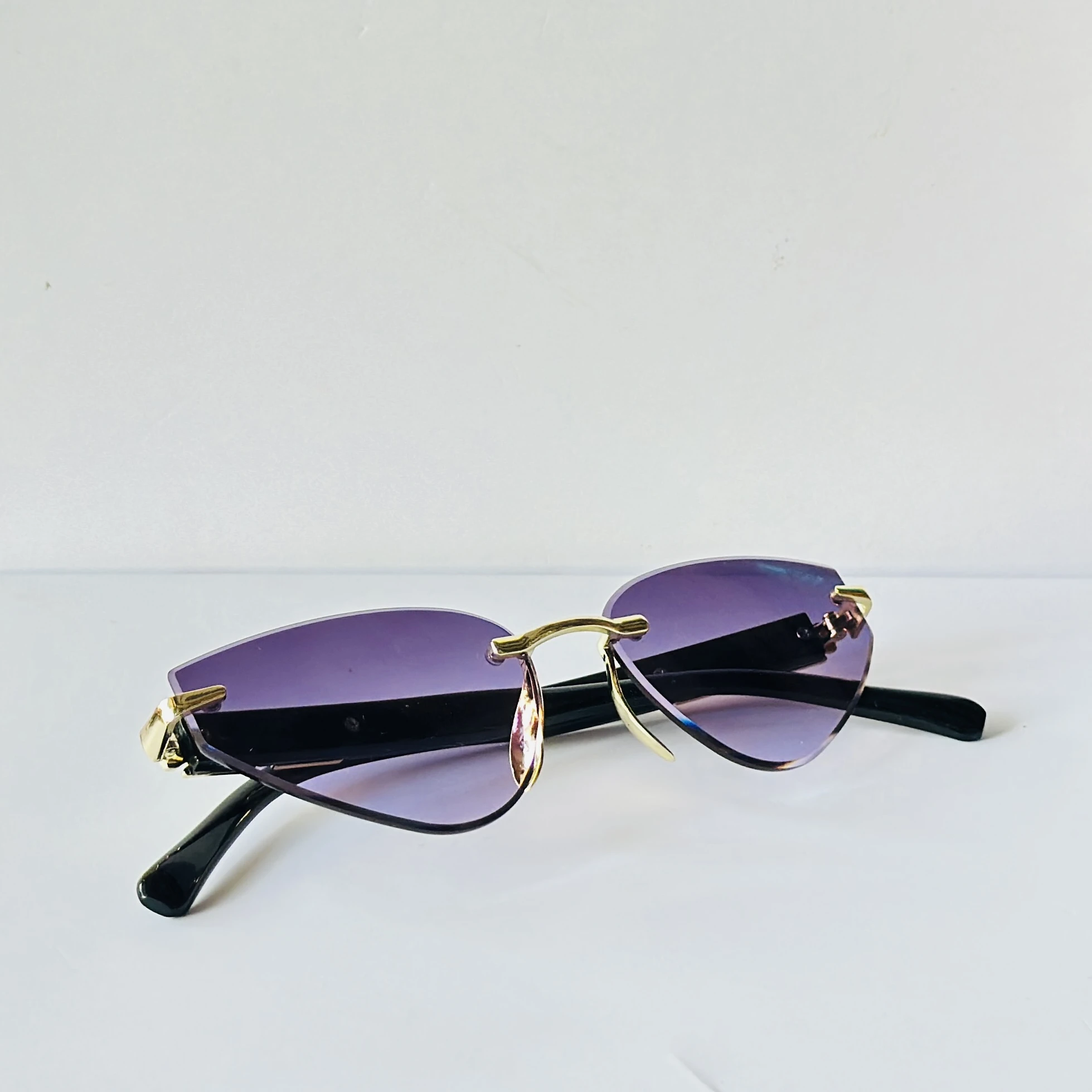 👉 Theme :- appears to be similar to rimless cat-eye sunglasses featuring a gold-tone frame and gradient lenses,.