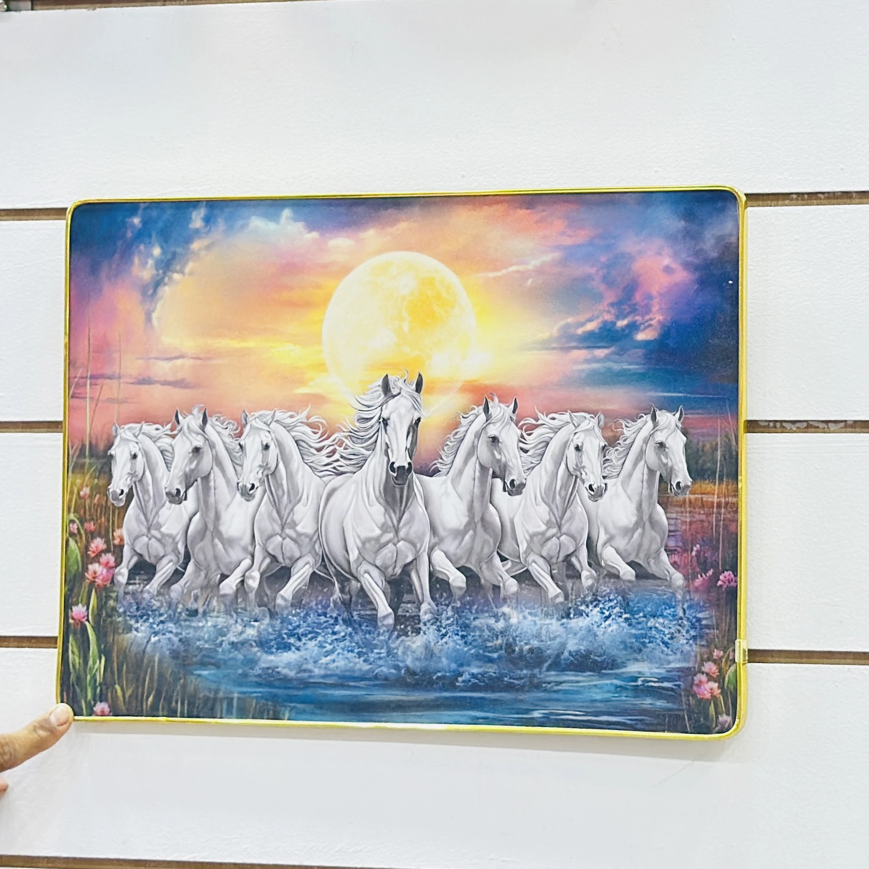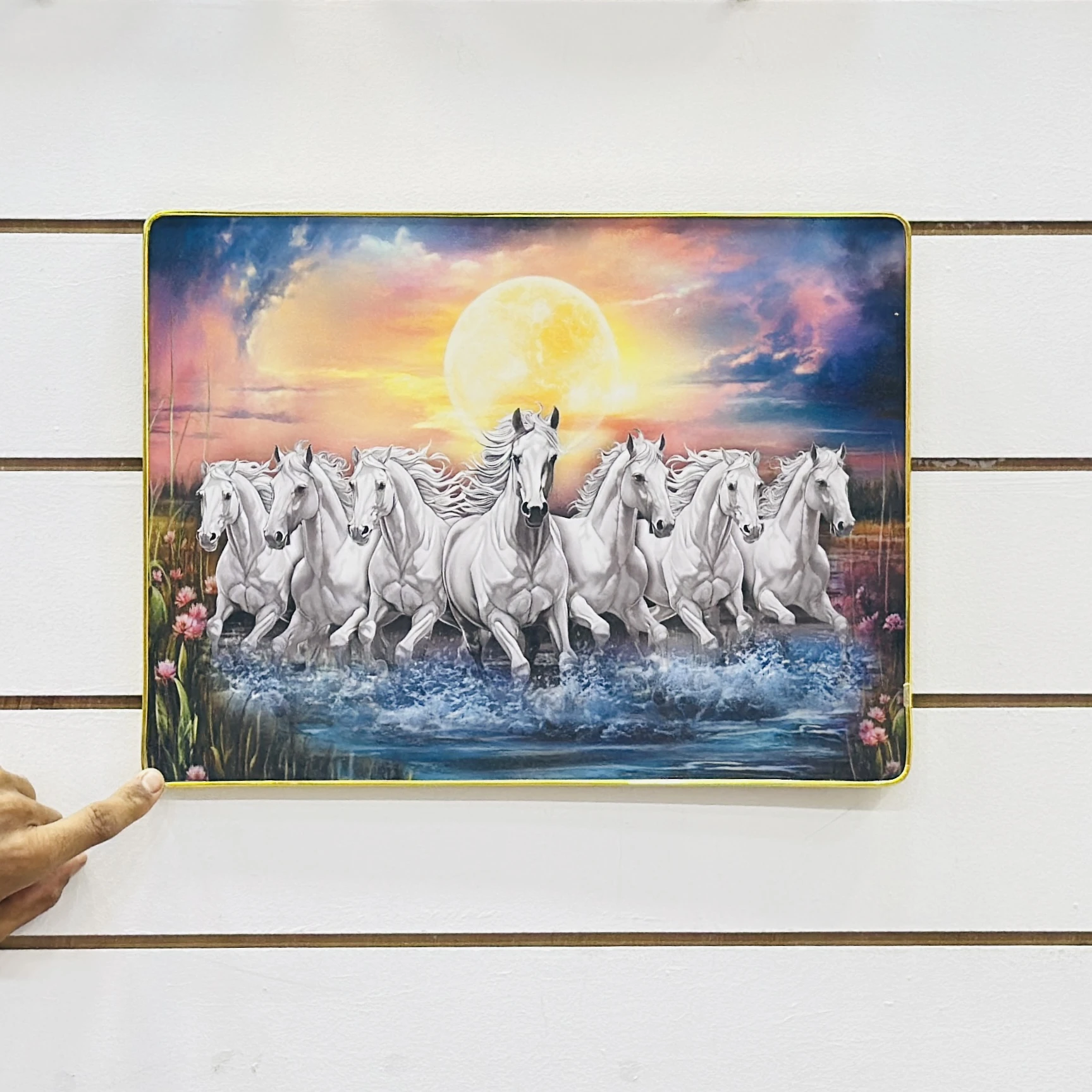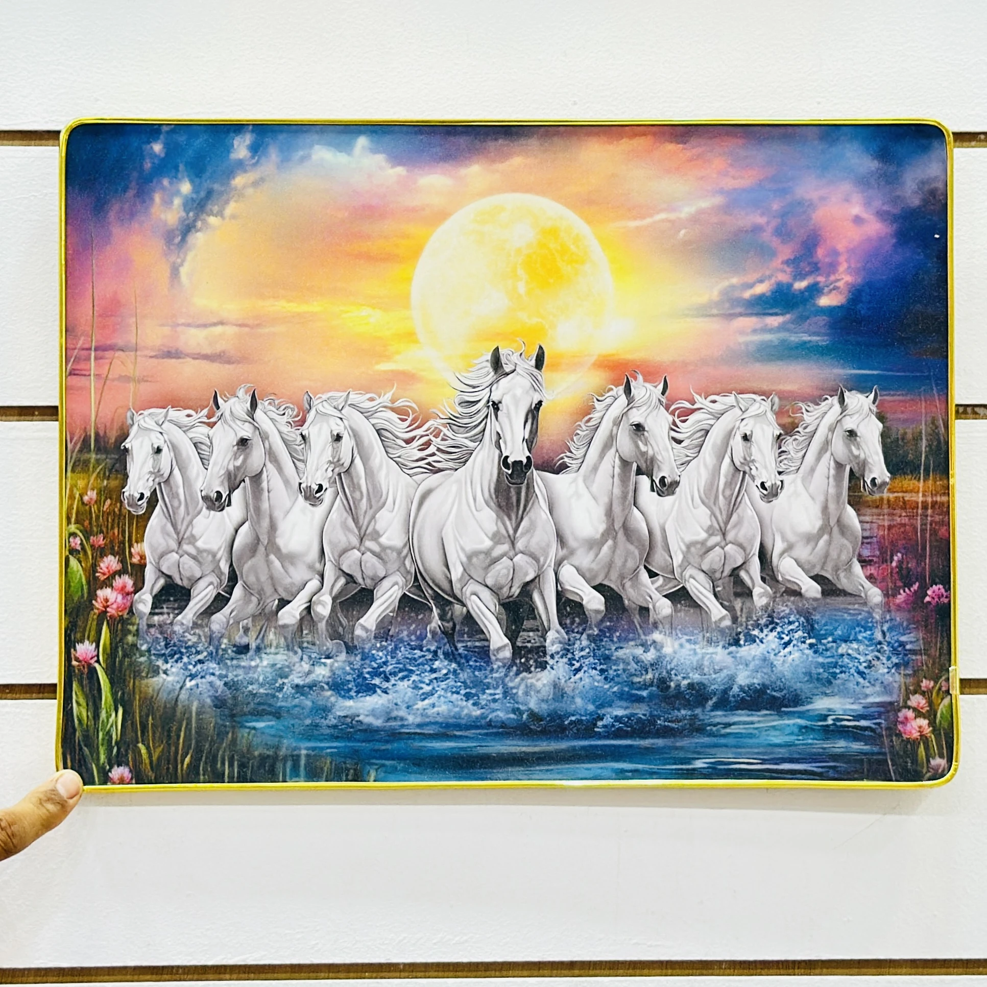 Sunrise White Lucky Seven Running Horses glass wall art…..MUIUCB