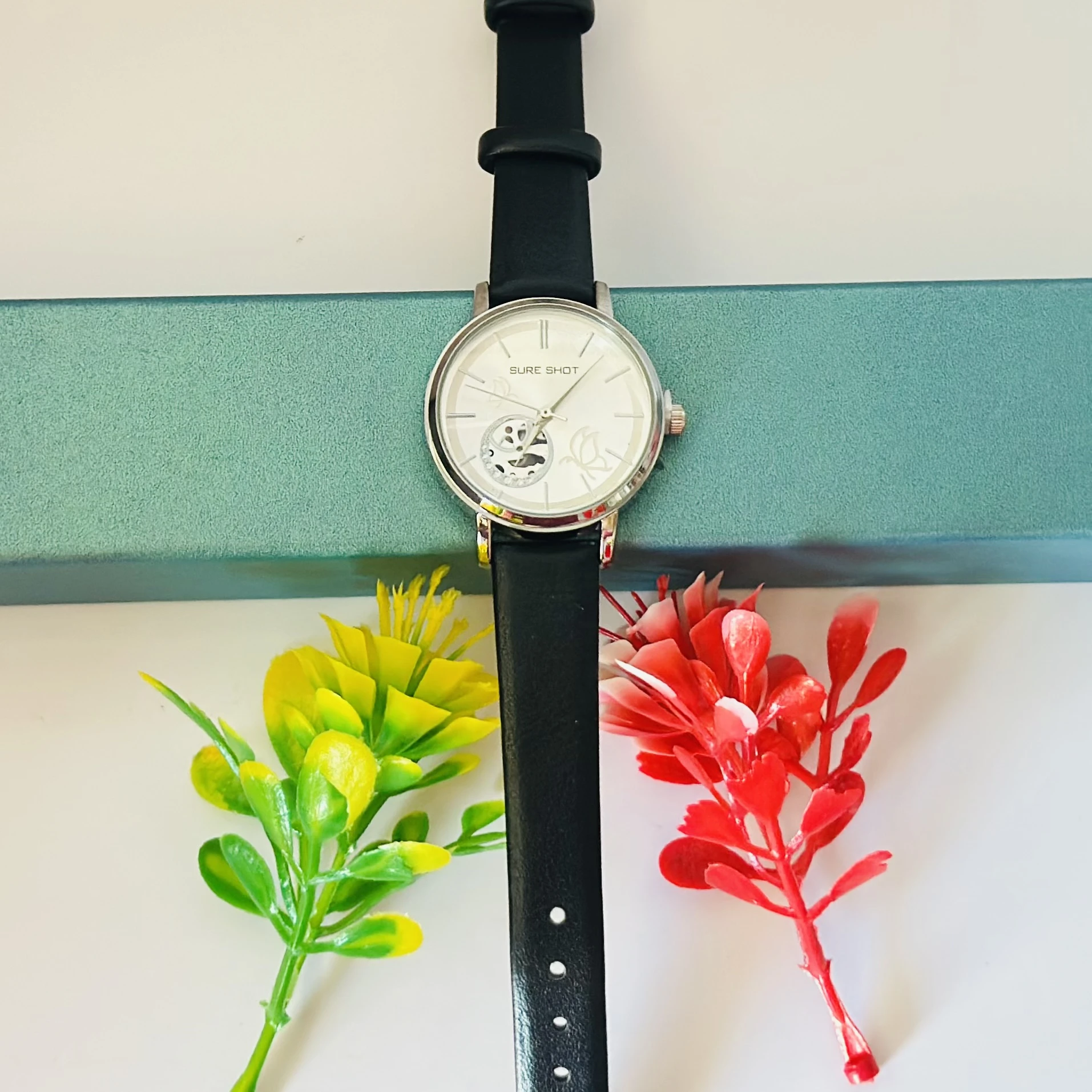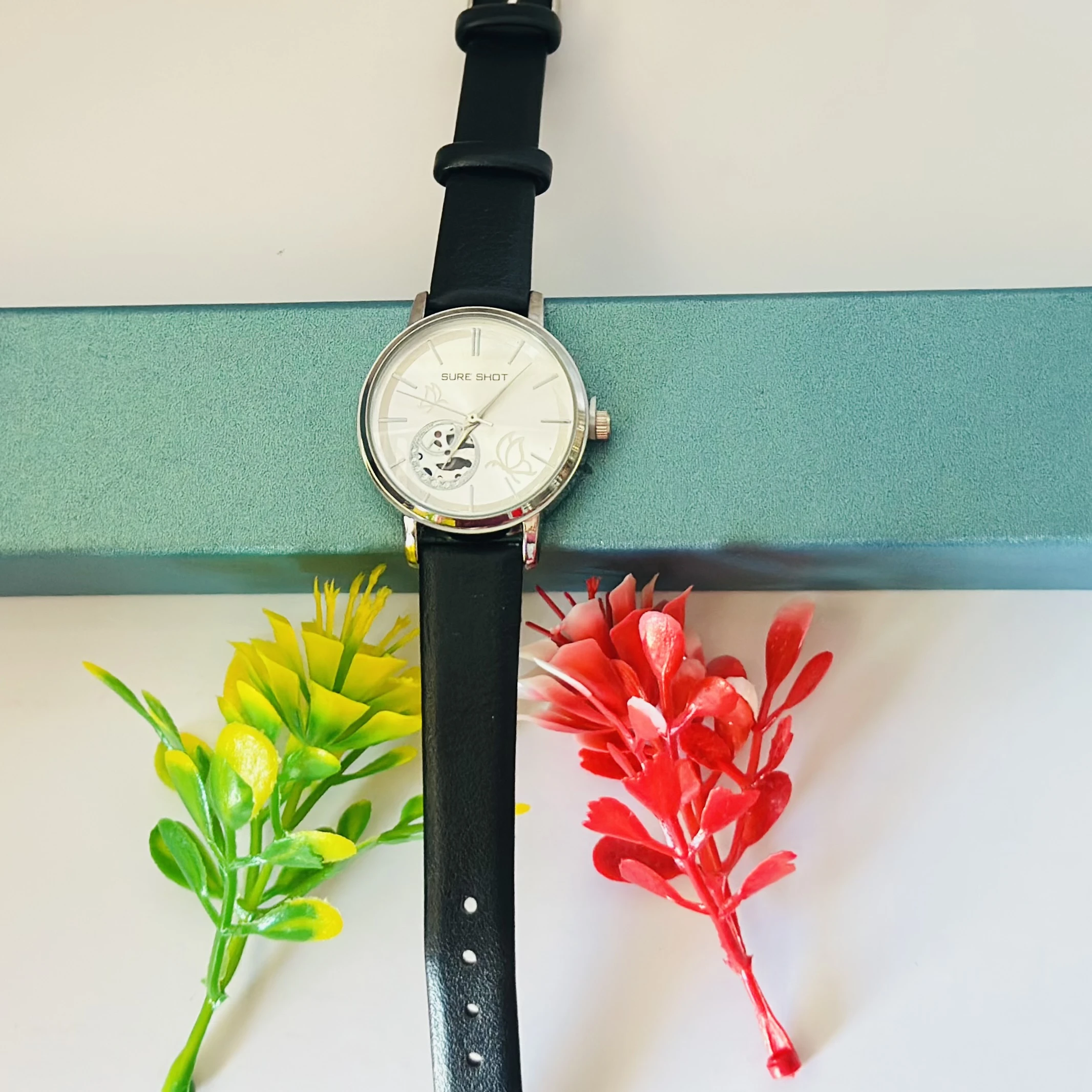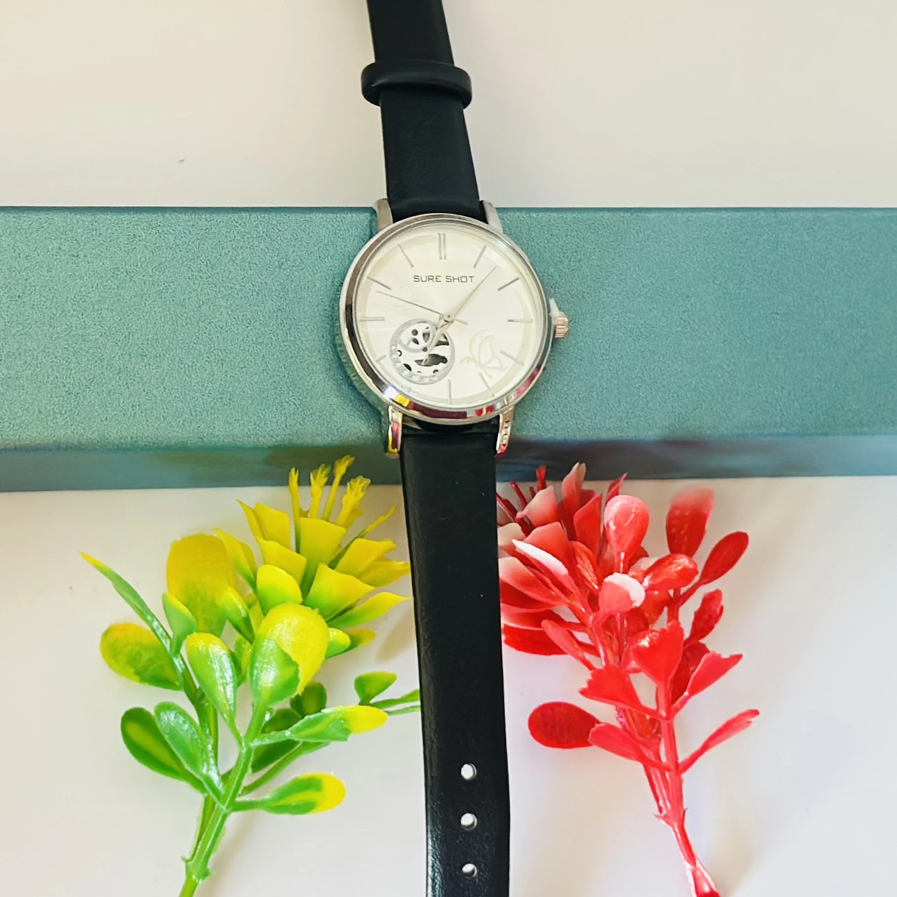 👉 Theme :- Sure Shot analog watch with a black leather band and silver-tone case.