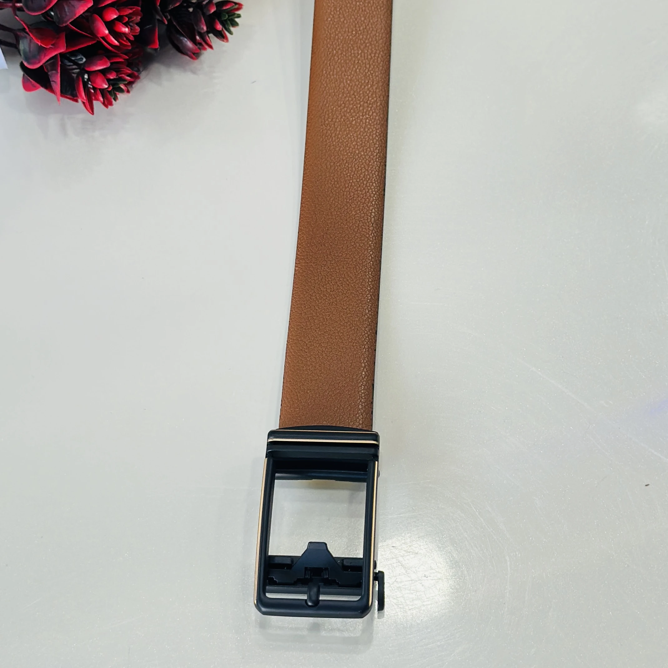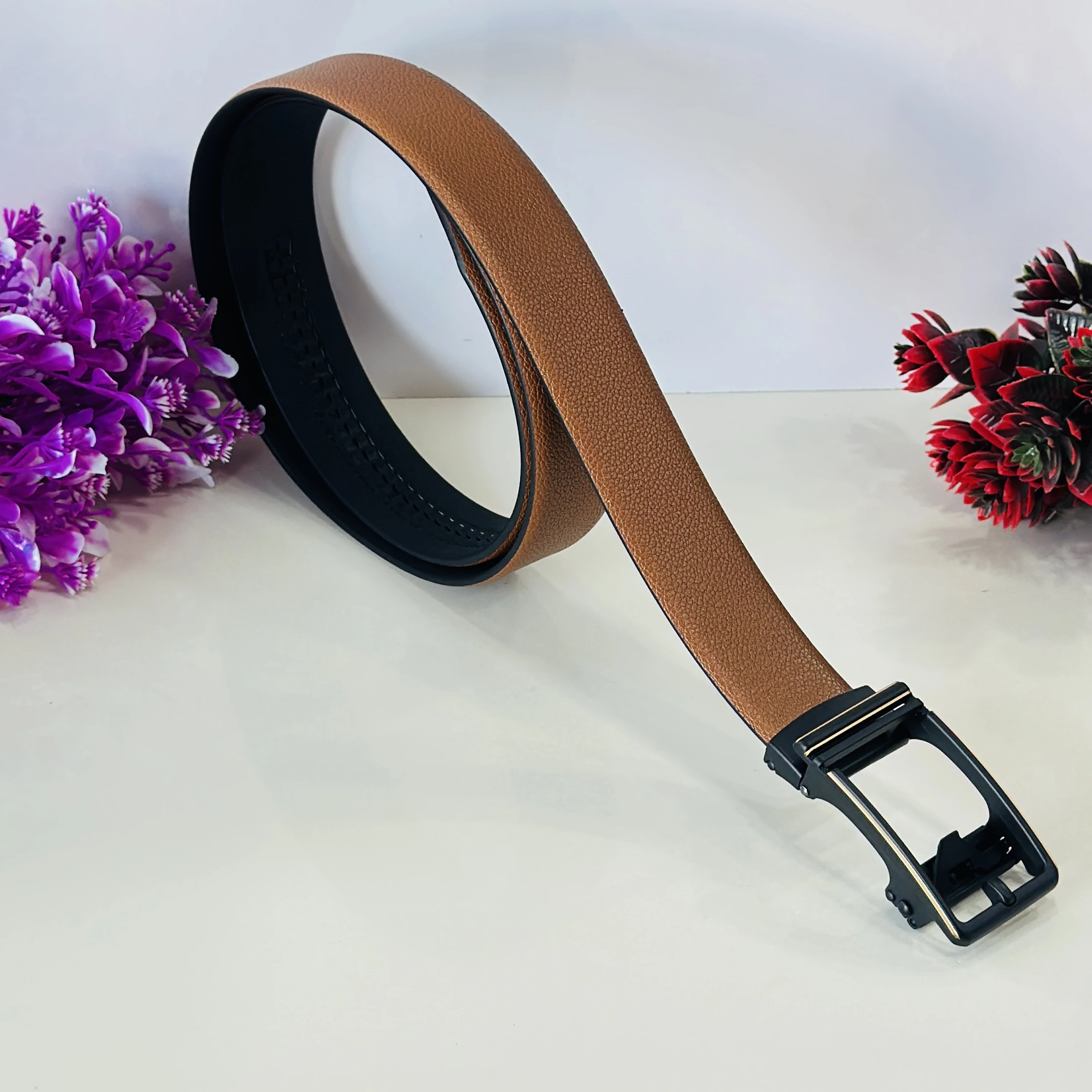 👉 Theme :- Tan and black reversible formal belt with an auto-lock buckle.