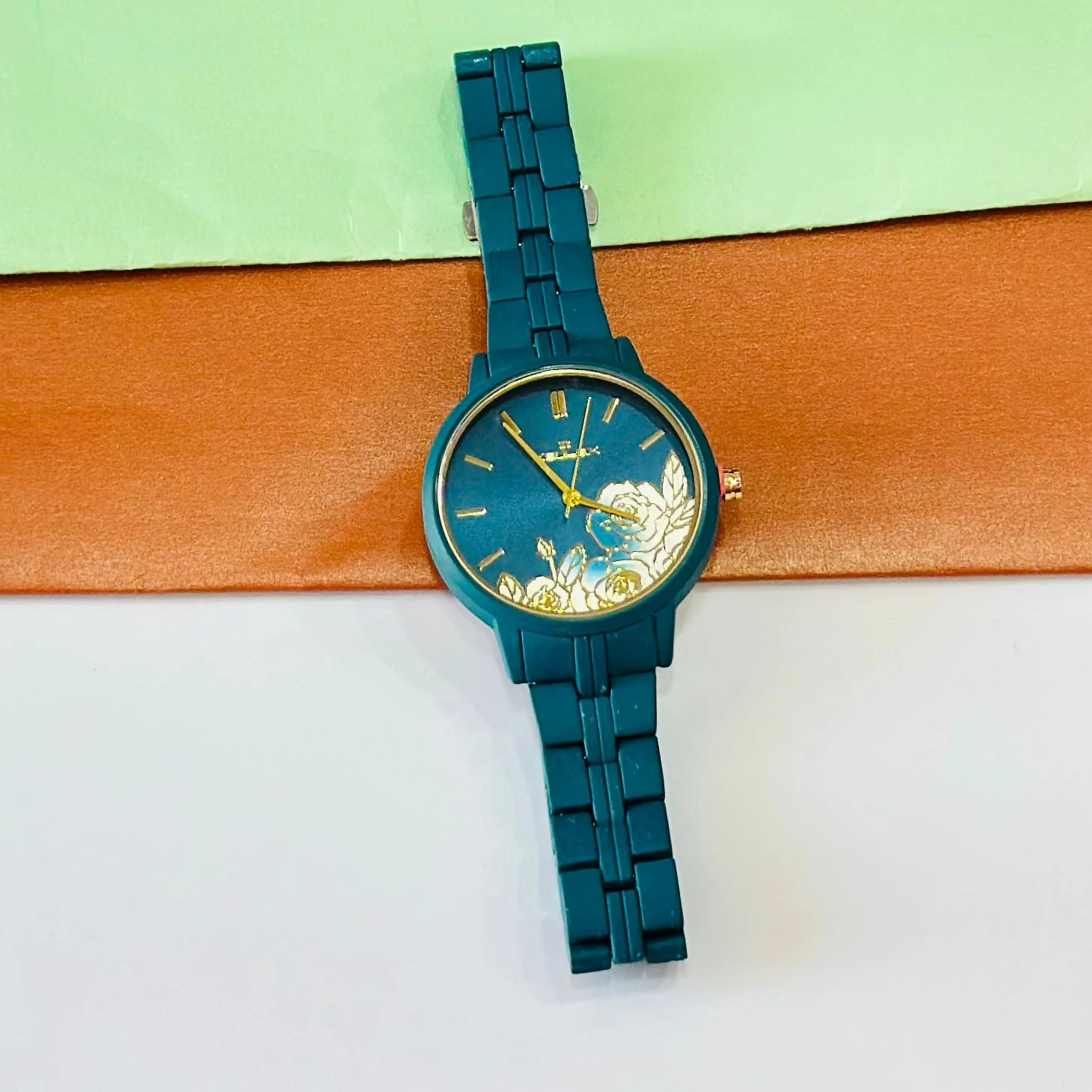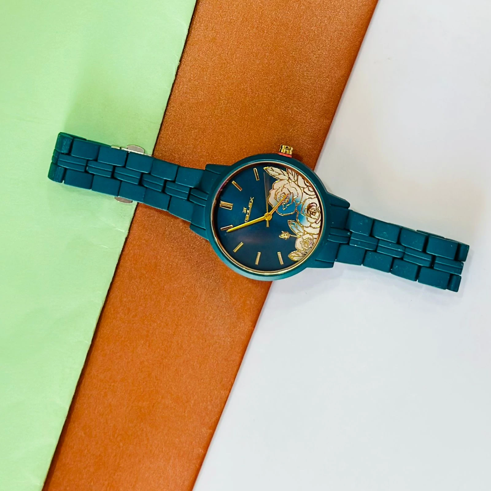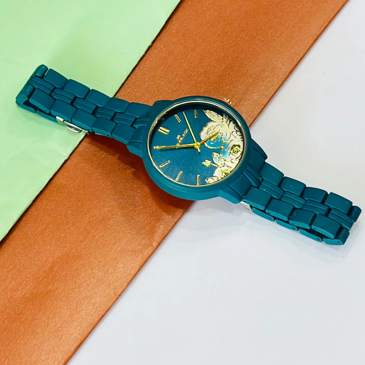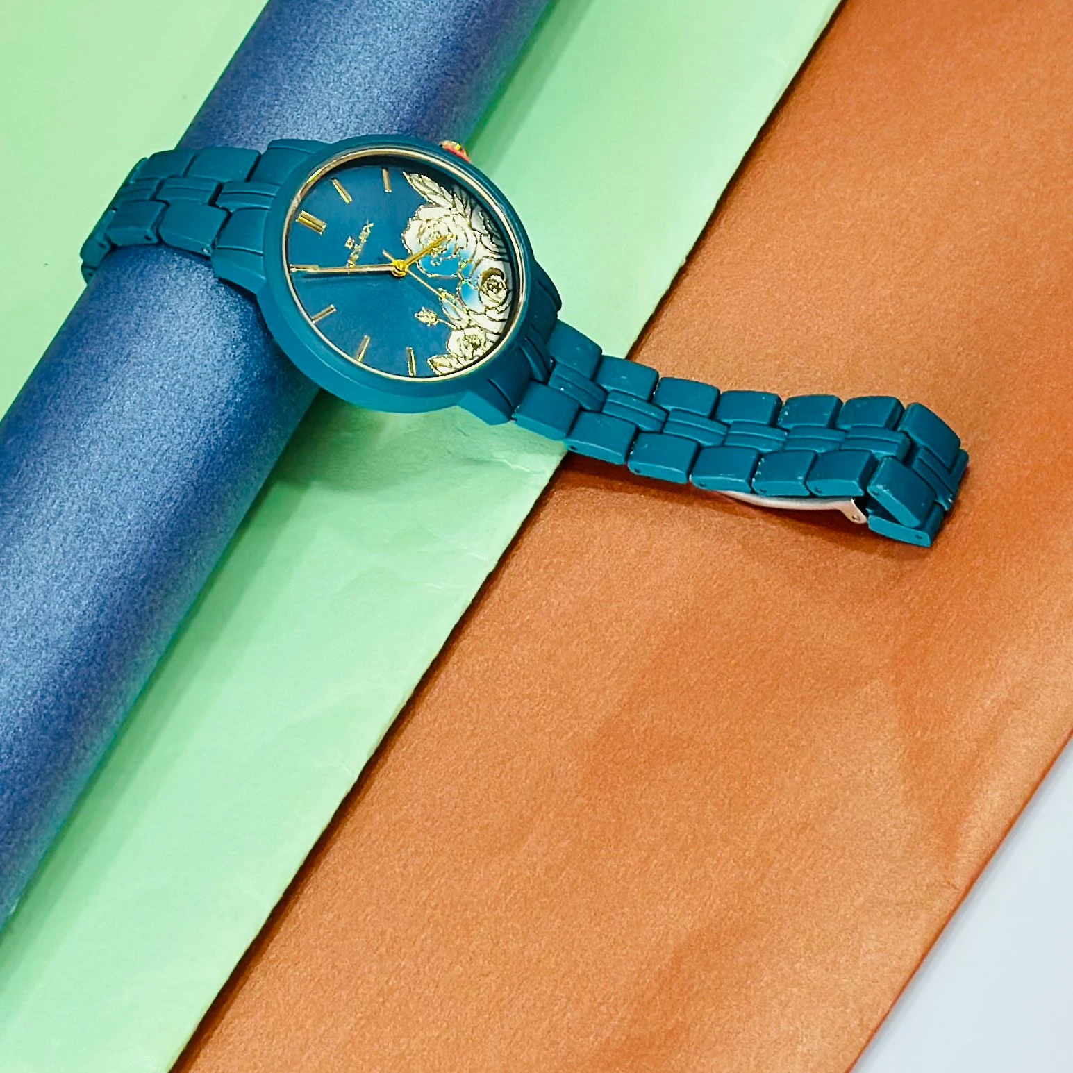 👉 Theme :- TEAL BY CHUMBAK Tulip Garden Quilted Analog Watch for Women in a teal blue hue.