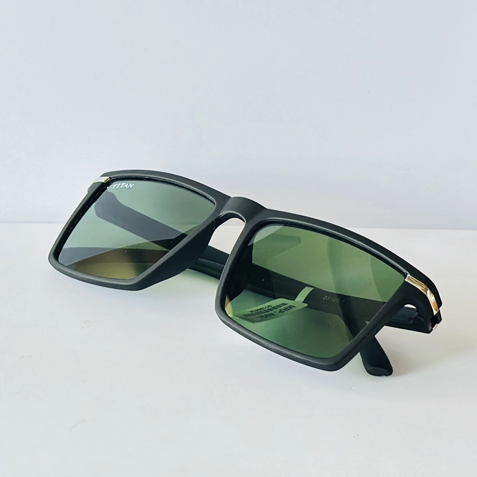 👉 Theme :- Titan brand rectangular sunglasses featuring black frames and green lenses.