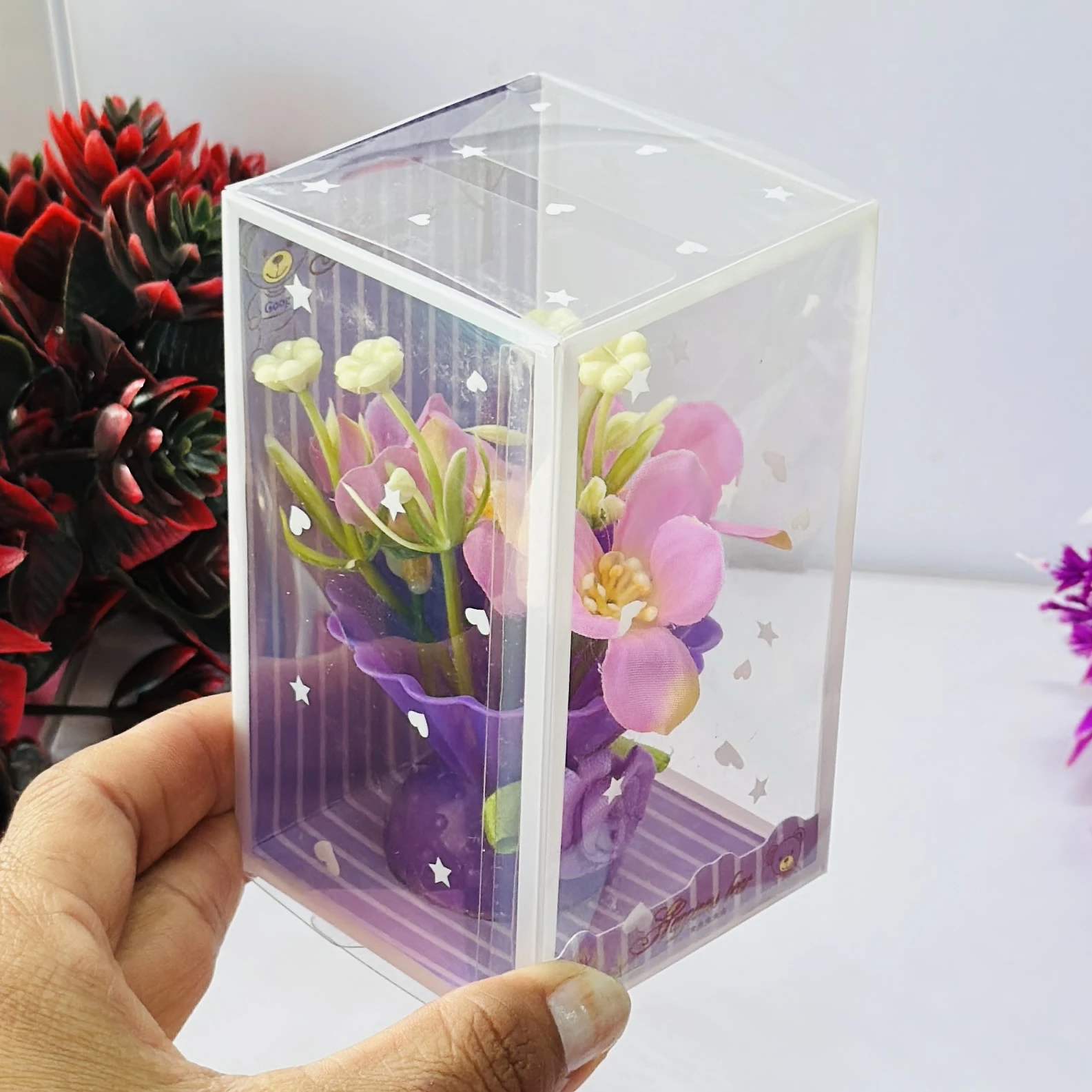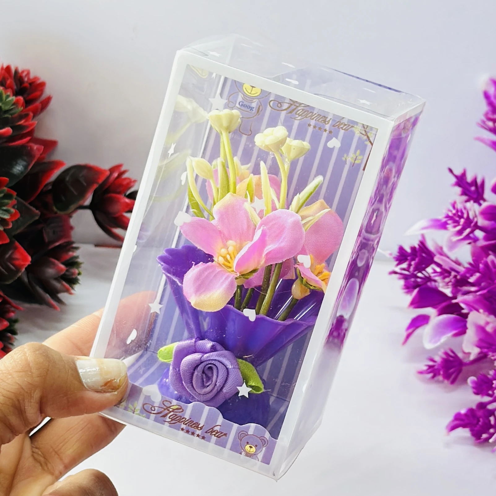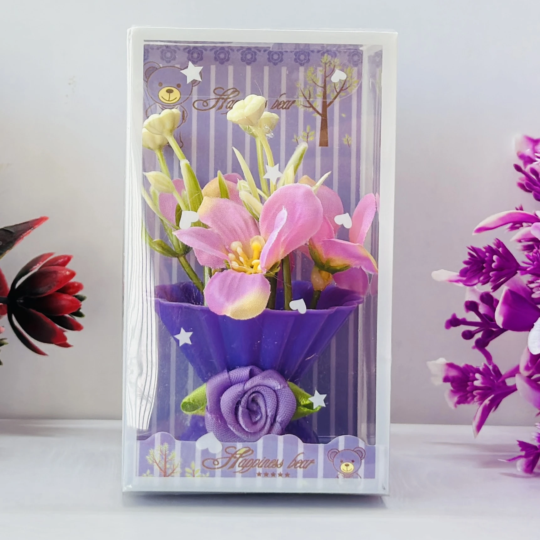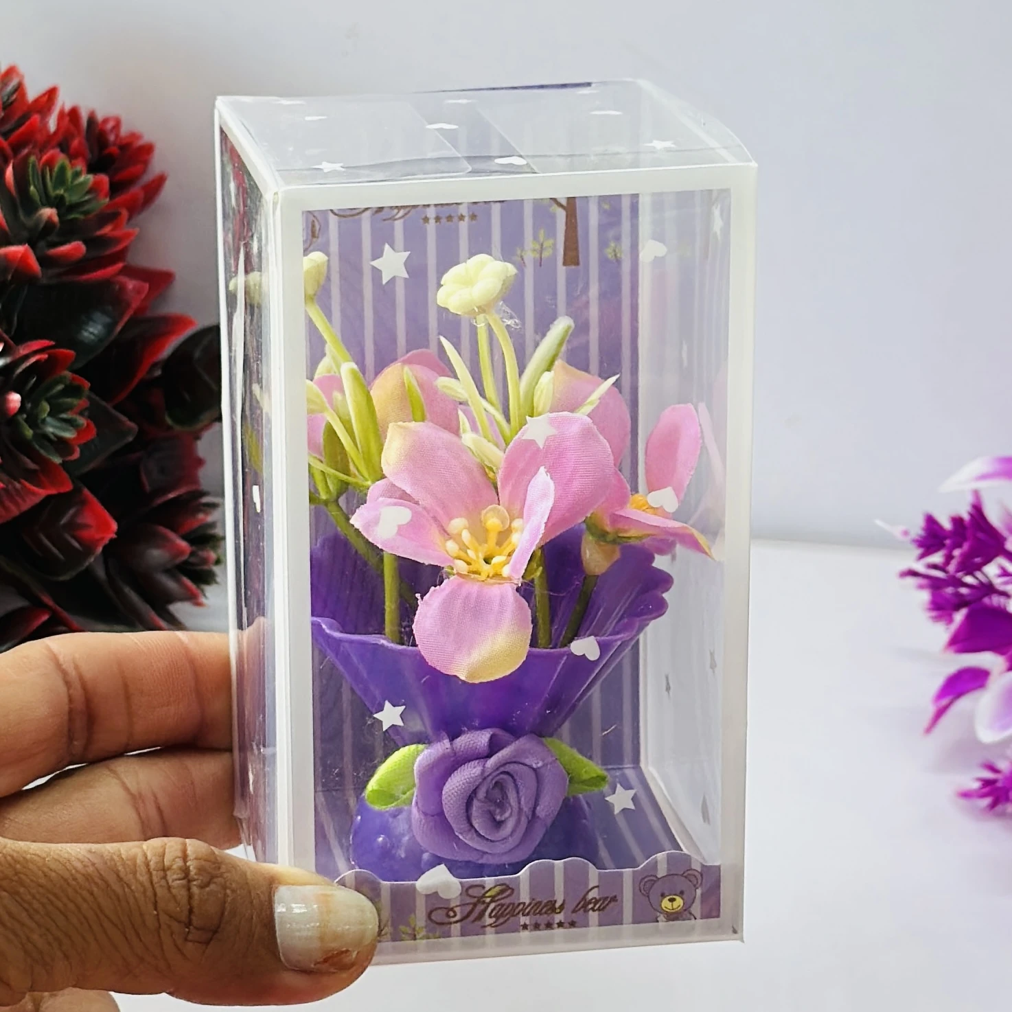 👉 Theme :- Small artificial flower arrangement in a decorative plastic vase, packaged in a clear display box.