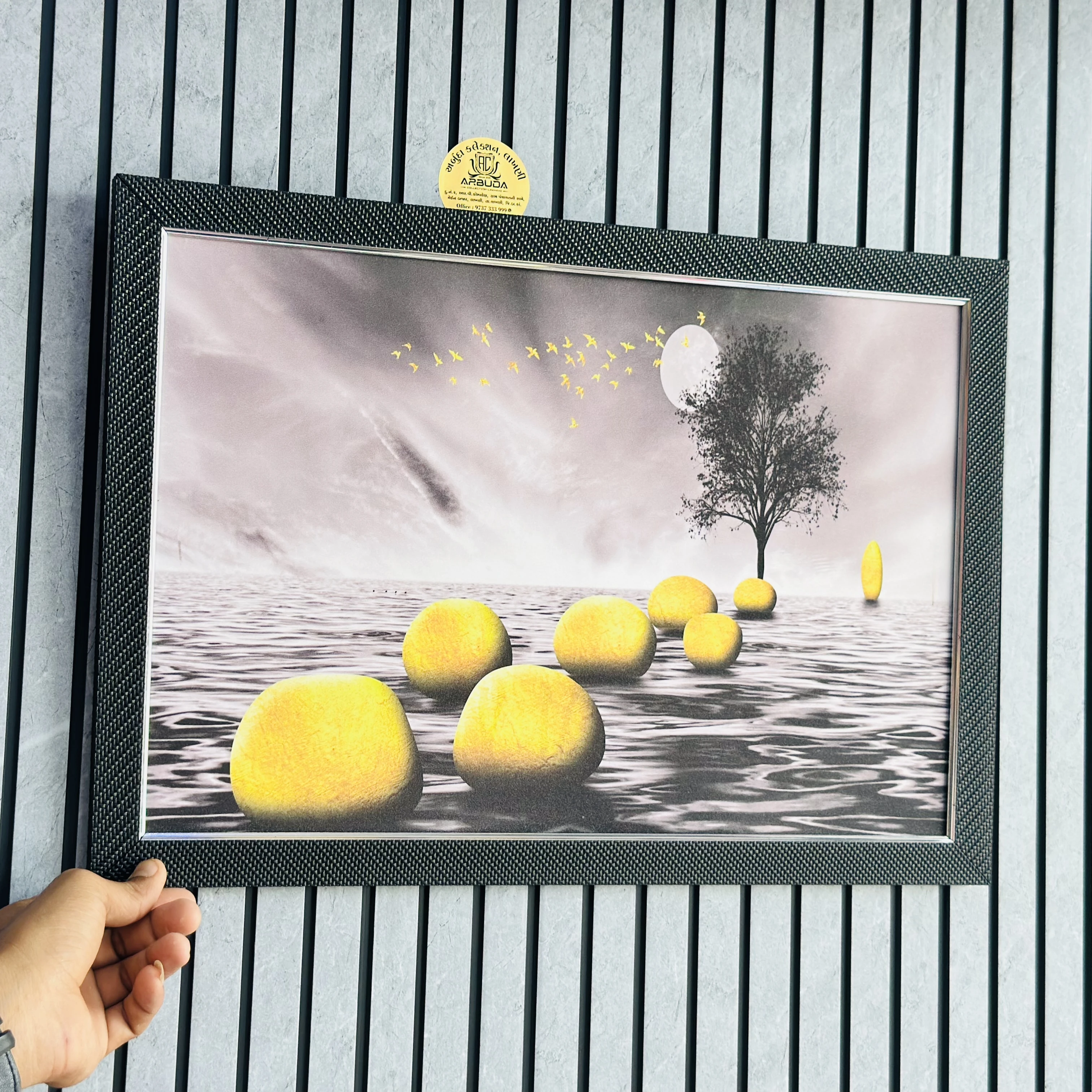 👉 Theme :- wall art depicting a surreal landscape. The image features a black and white background with a path of yellow stones leading across a body of water toward a single tree and a full moon. Golden birds are shown flying across the sky.