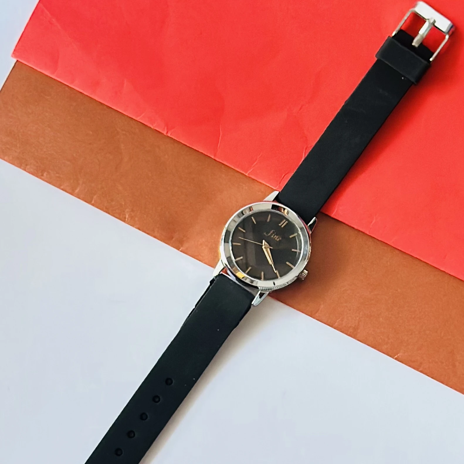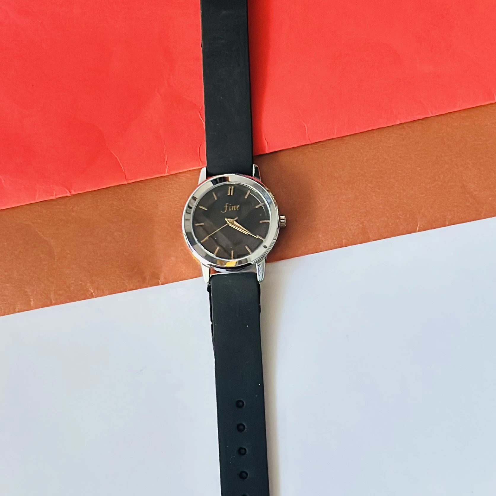 👉 Theme :- Black analog wristwatch with a black faux leather strap.
