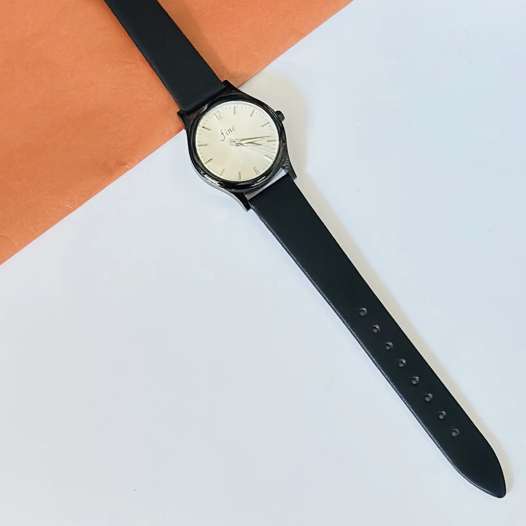 👉 Theme :- Black analog wristwatch with a black faux leather strap.