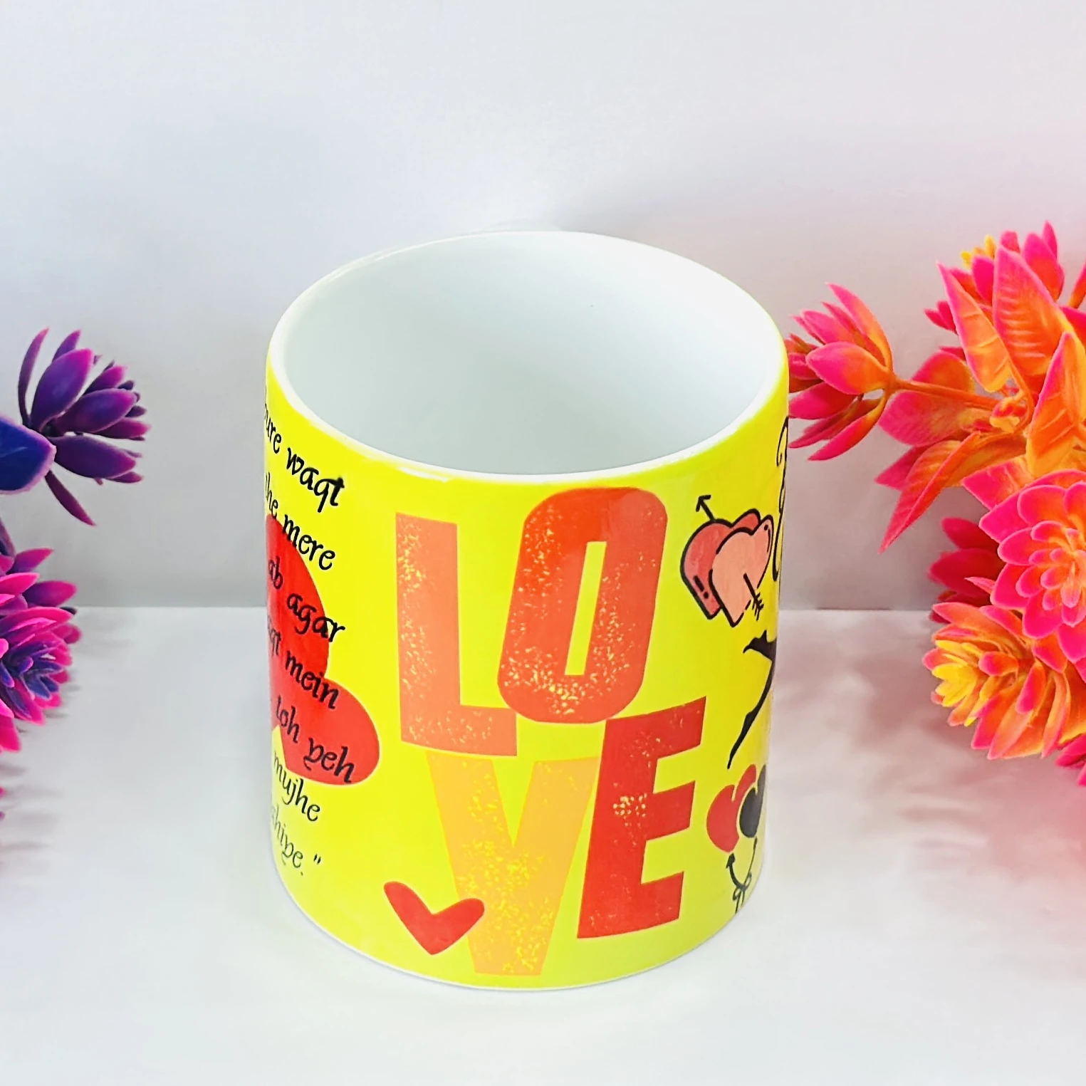👉 Theme :- white ceramic coffee mug with a personalized yellow and red heart design.