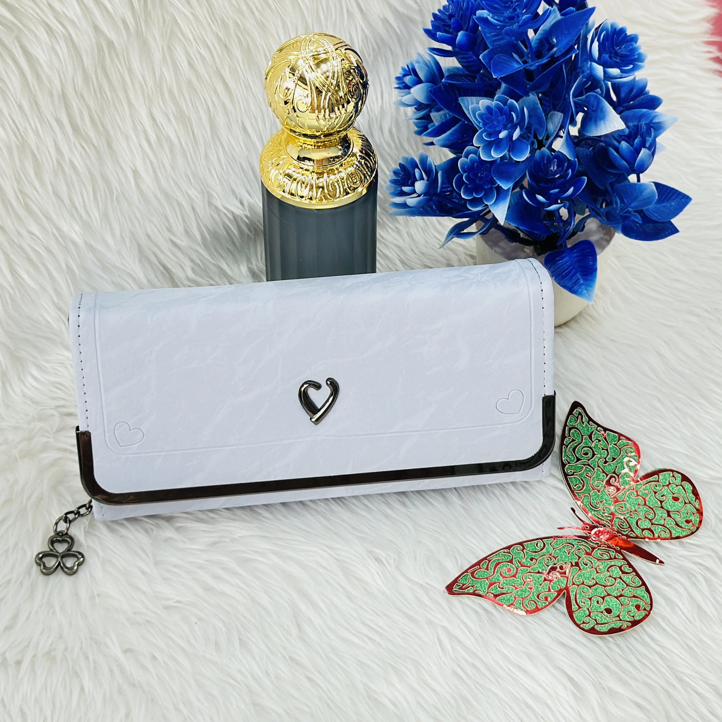👉 Theme :- white faux leather clutch wallet featuring a small heart-shaped charm
