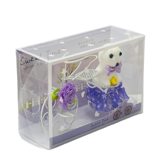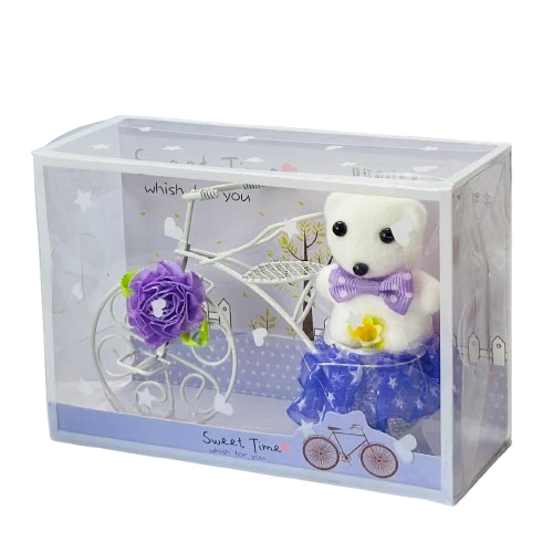 White Plastic Cycle with Teddy Bear and Rose Petals Gift Box