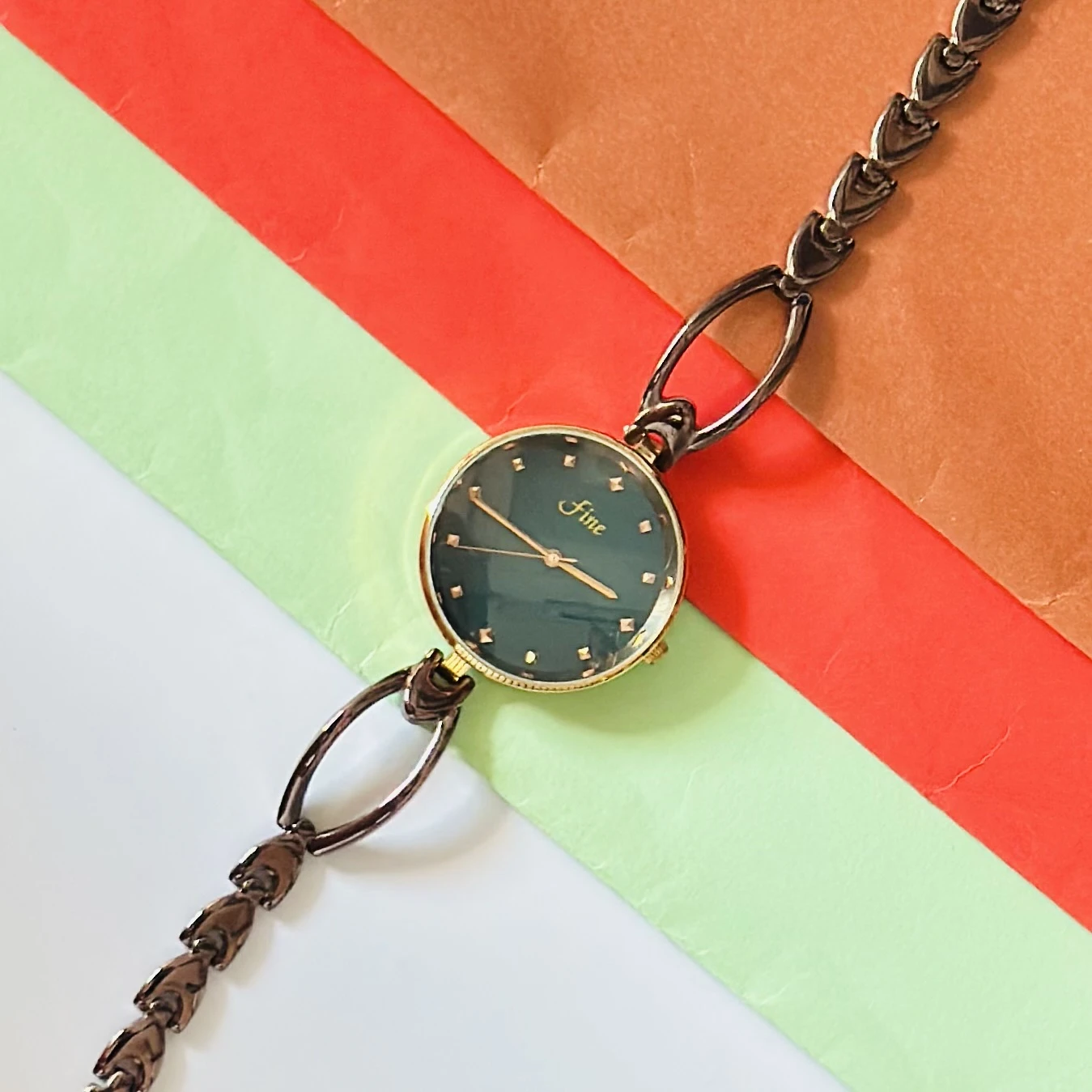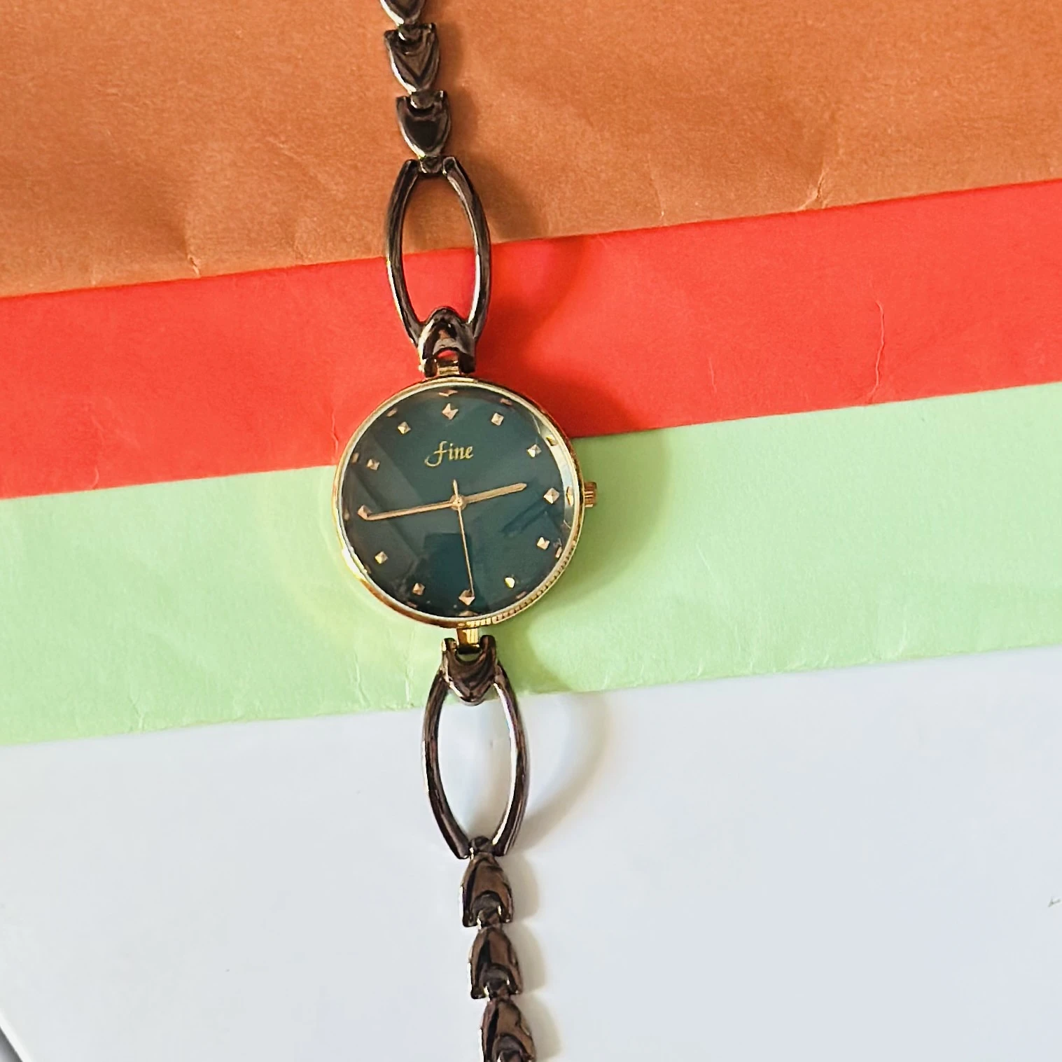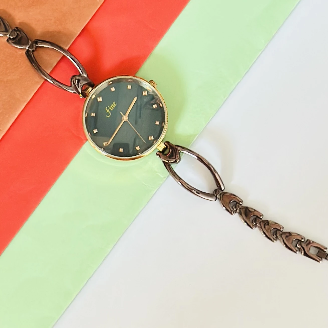 👉 Theme :- women's analog quartz bracelet watch with a green dial and a gunmetal-tone metal link strap.