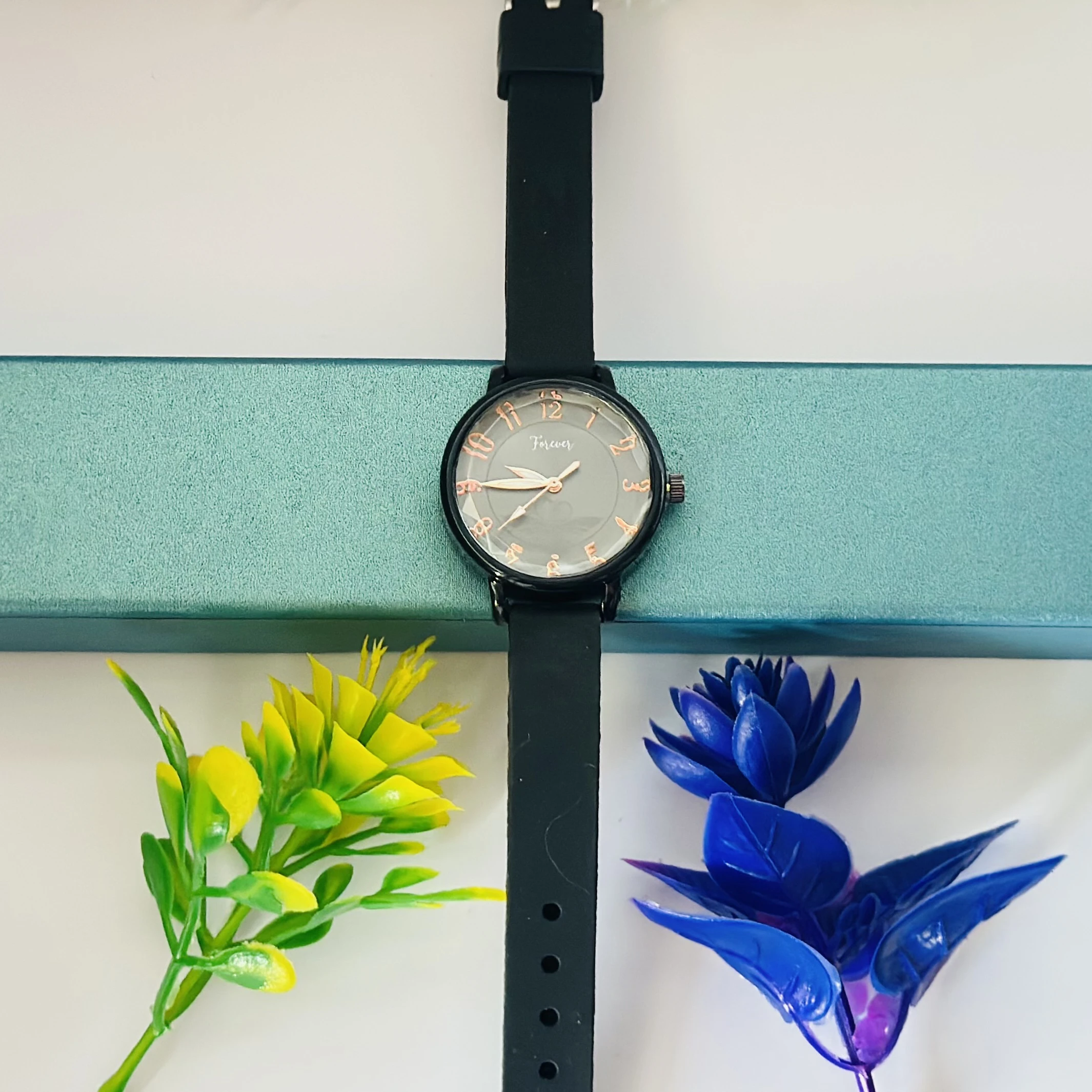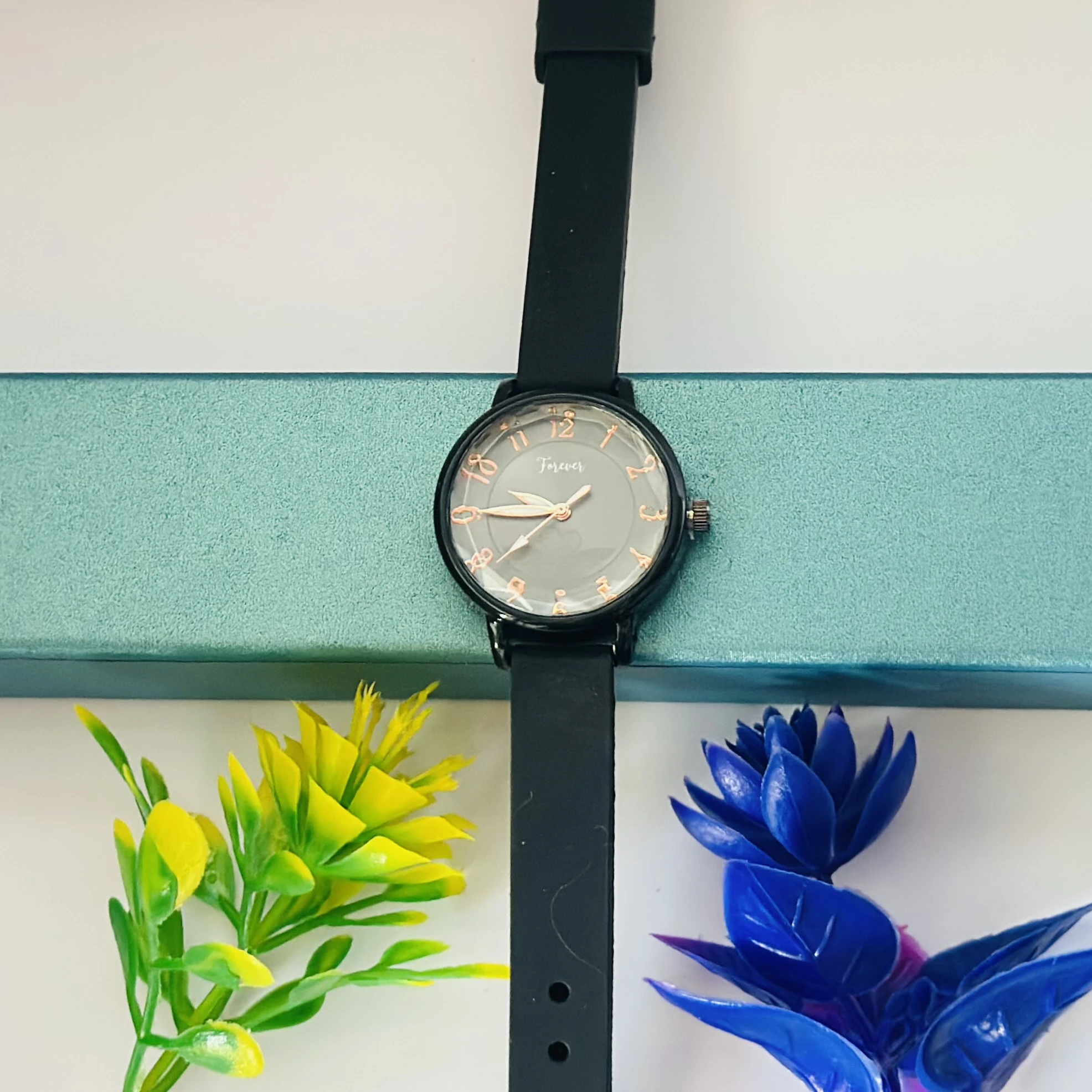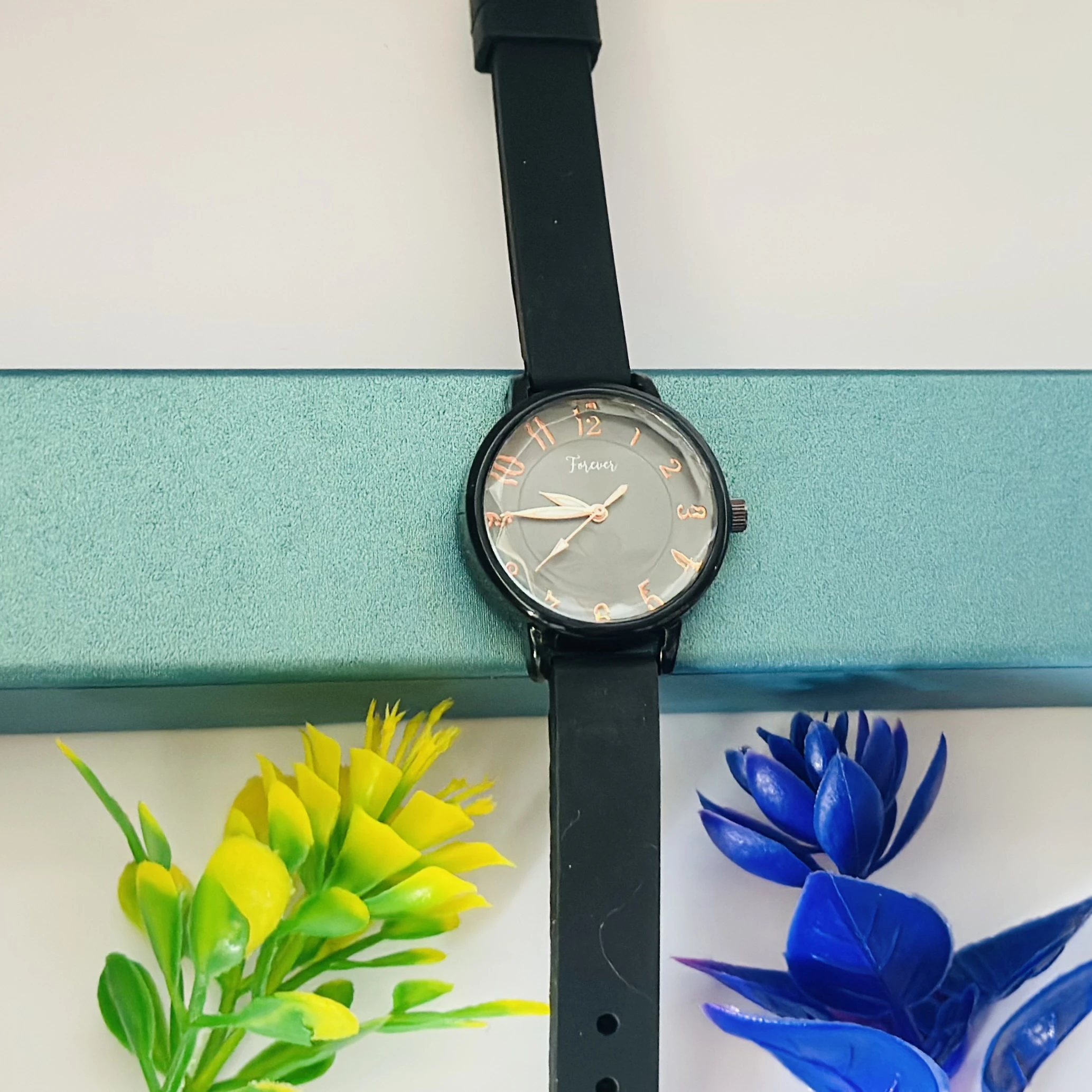 👉 Theme :- Women’s analog quartz watch with a white dial and black strap.