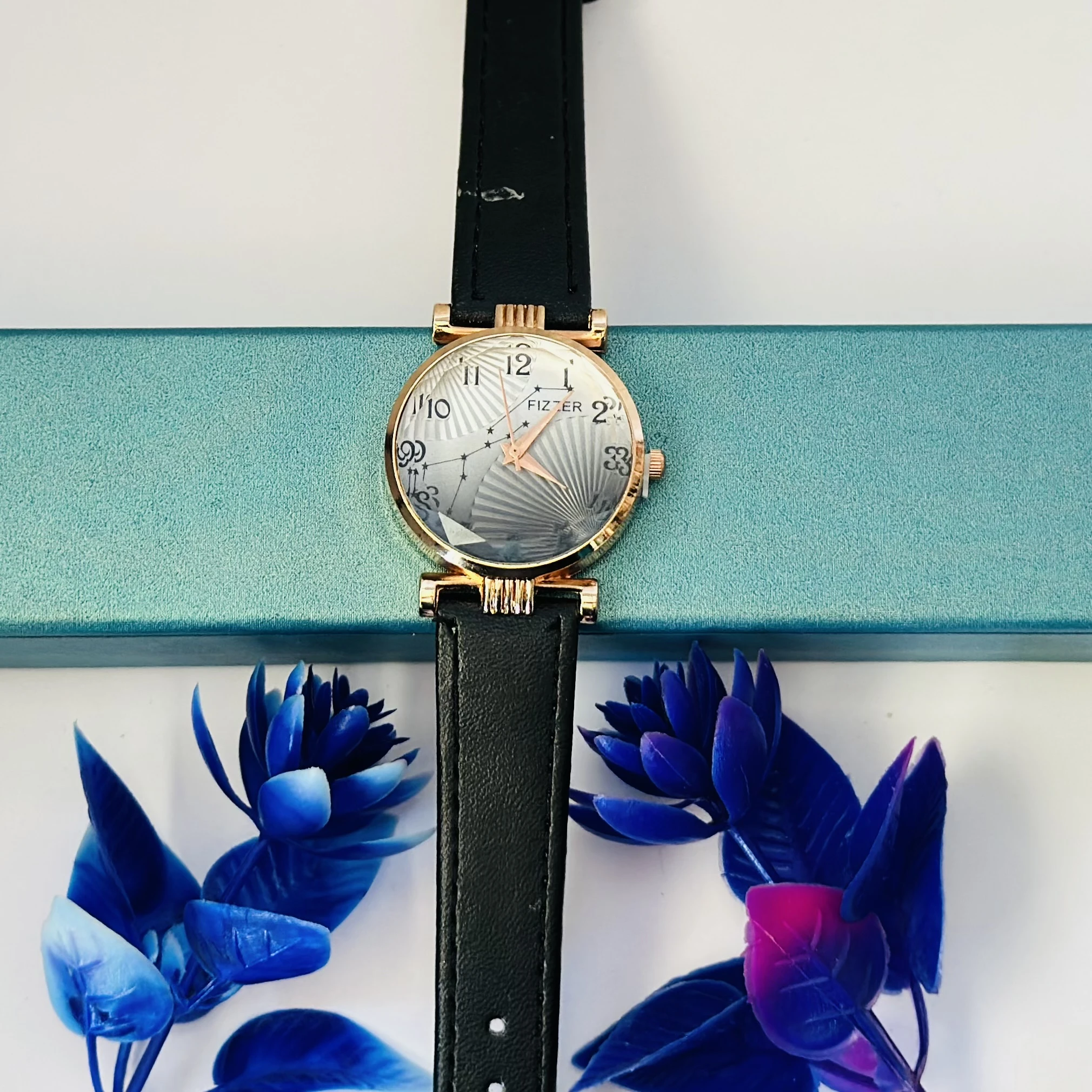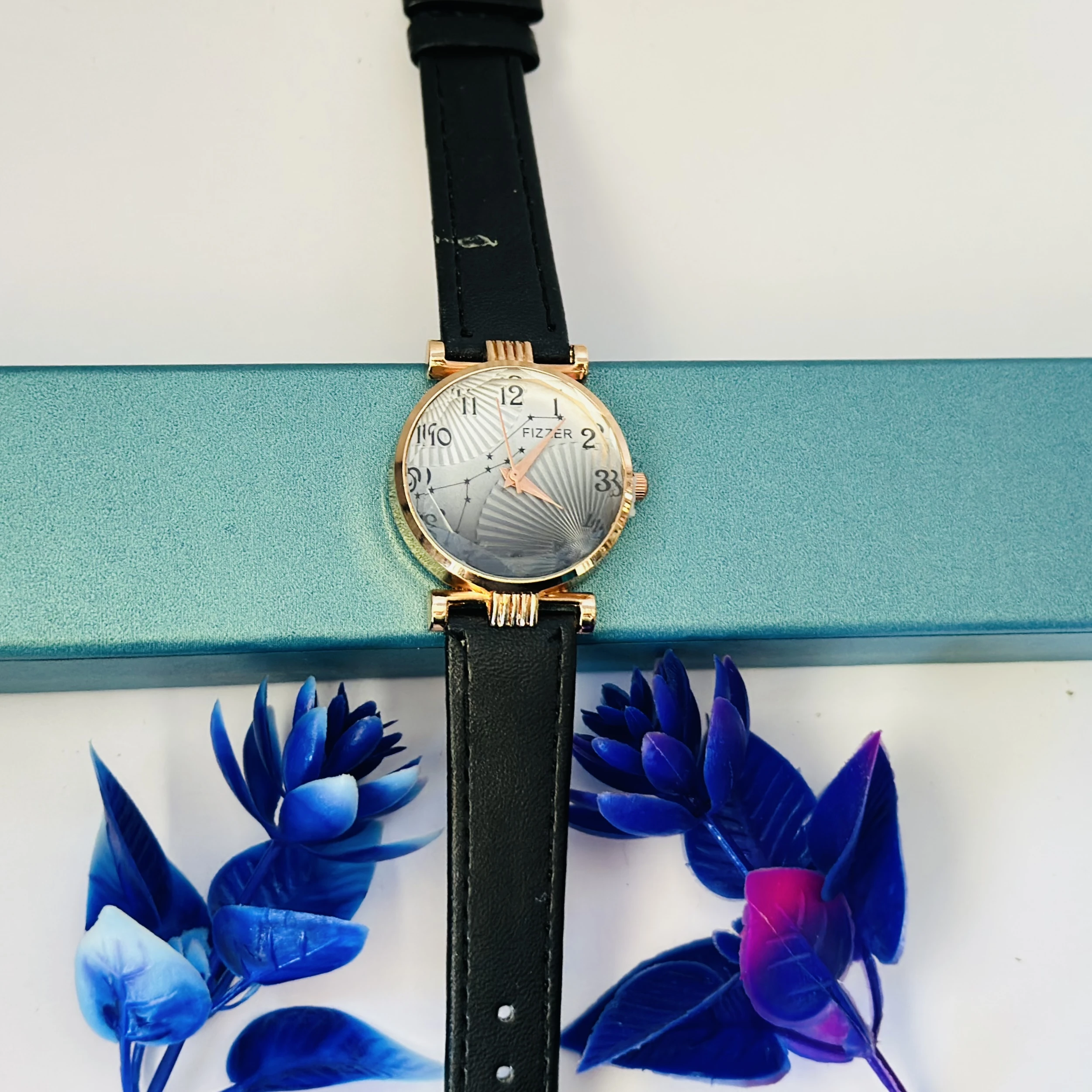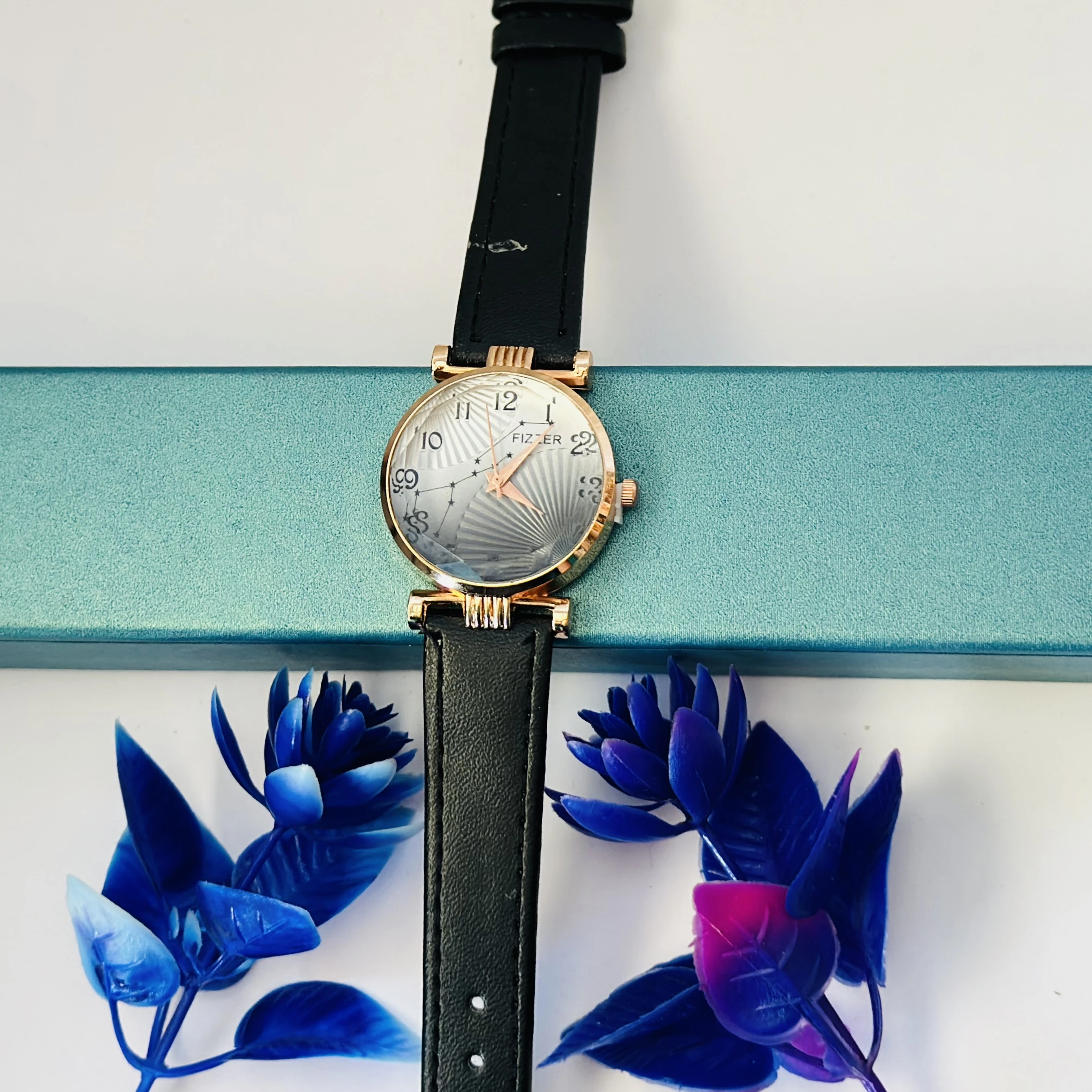 👉 Theme :- women's analog watch with a black leather strap and a rose gold-toned case.