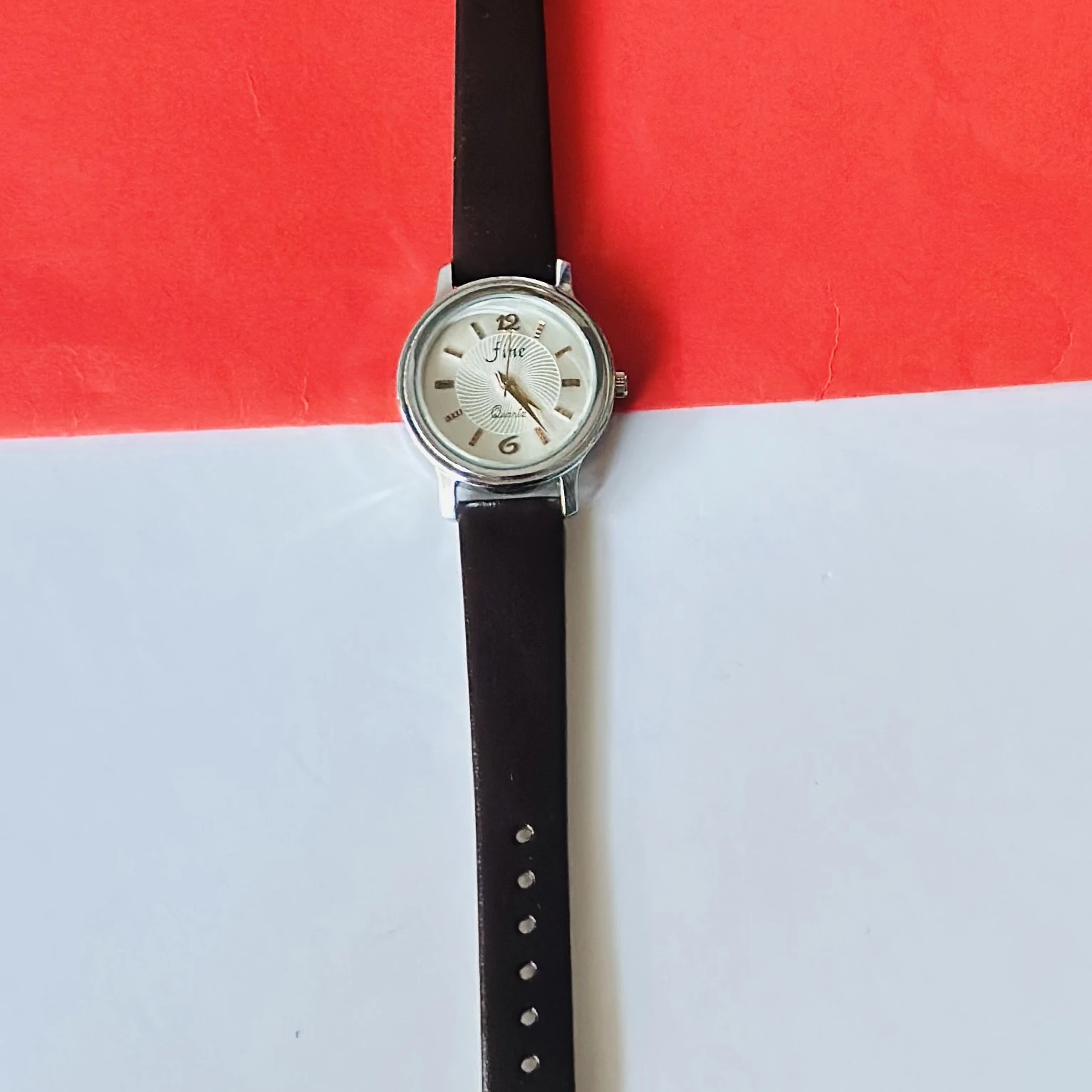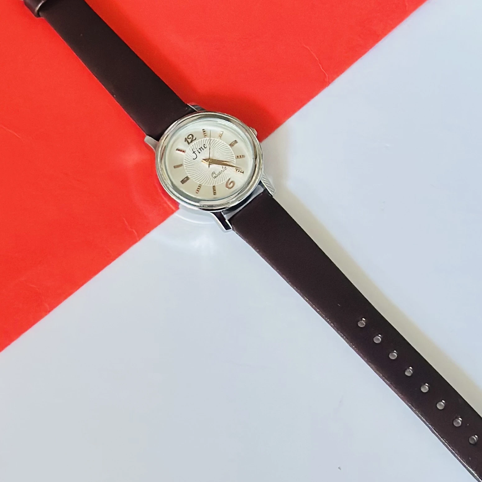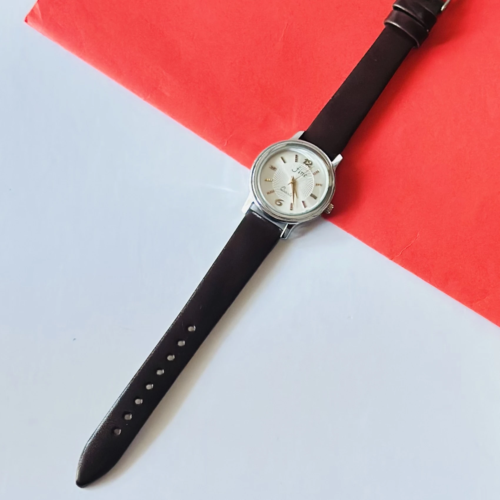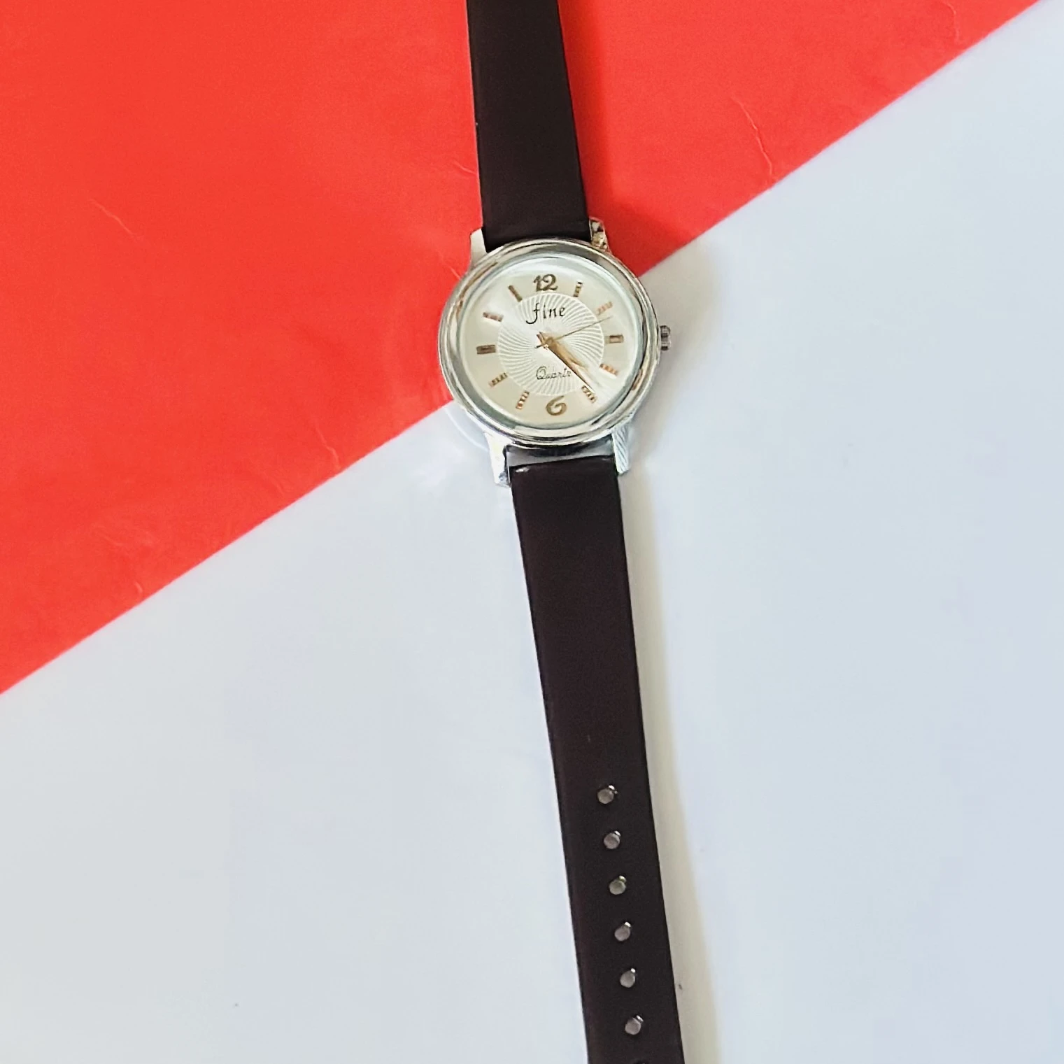 👉 Theme :- women's analog watch with a white dial and a dark brown leather strap.