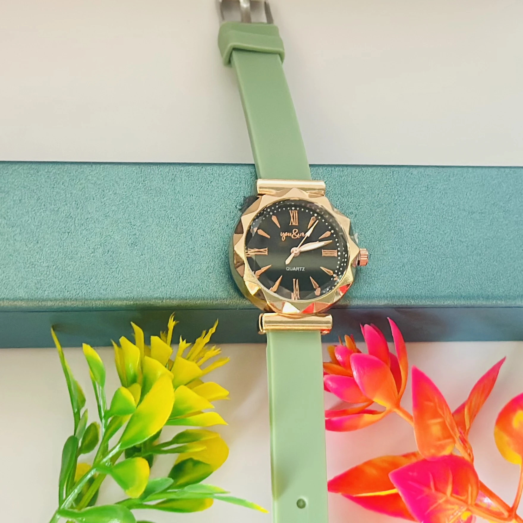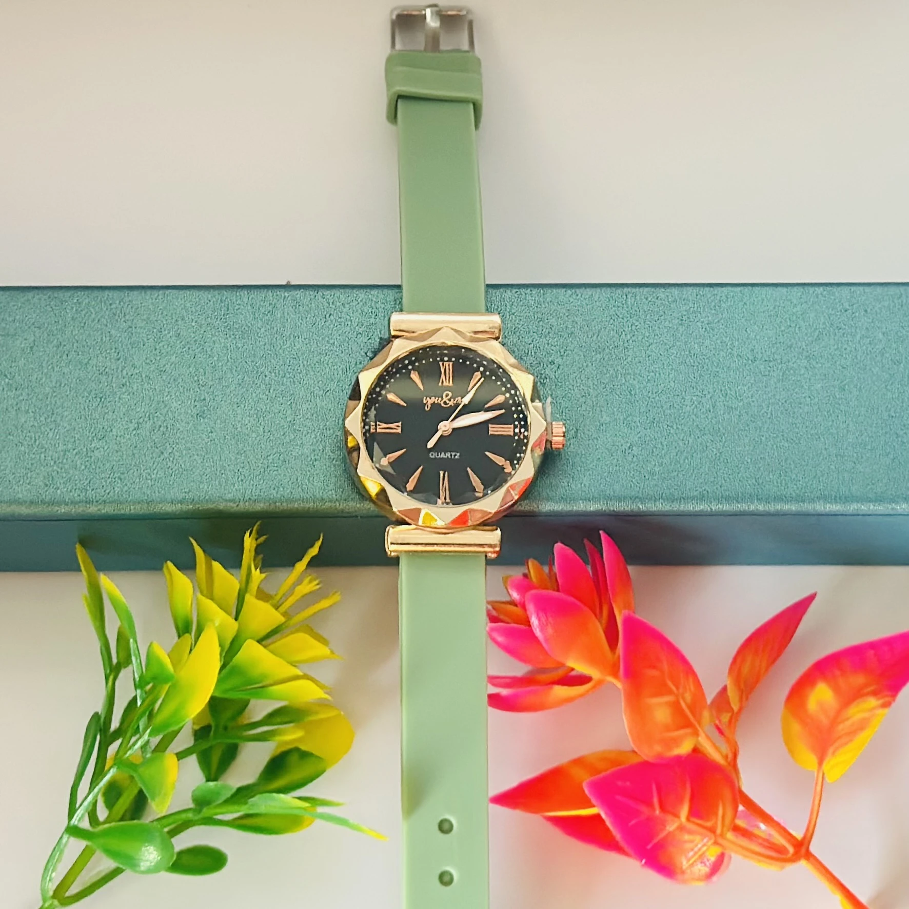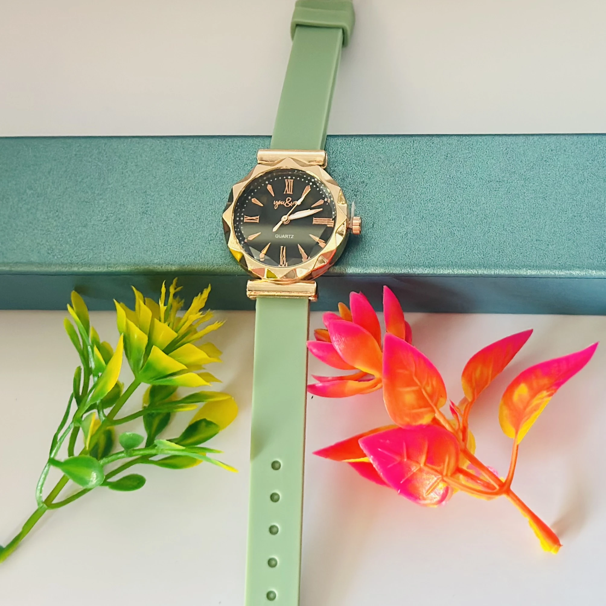 👉 Theme :- women's analog watch with a black dial, rose gold-tone casing, and a light green silicone strap.